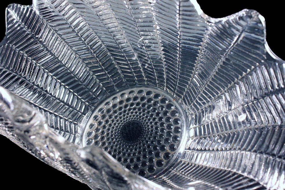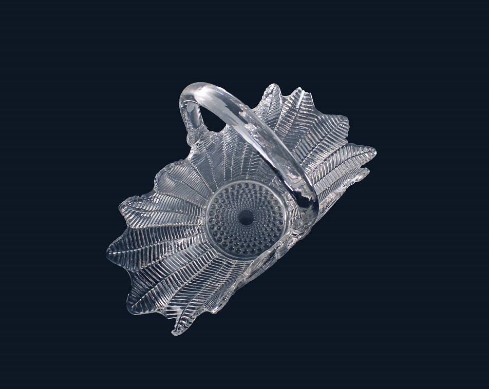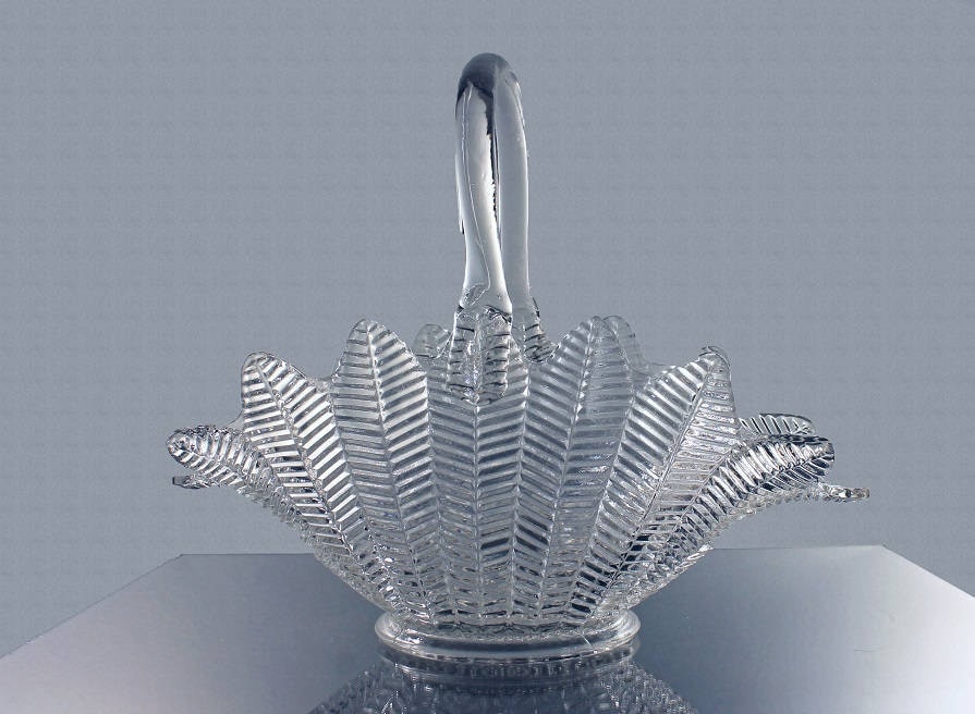 Glass Basket, L E Smith, Fern/Feather Pattern, Clear Glass, Pressed Glass, Herringbone, Hobnail, Large, Centerpiece