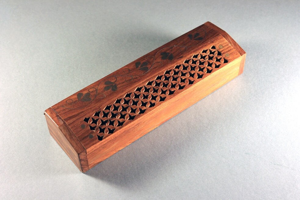 Wooden Pencil Box, Pen Box, Jewelry Box, Trinket Box, Lattice Cut, Gold Floral Inlay, Hinged Box, Mahogany