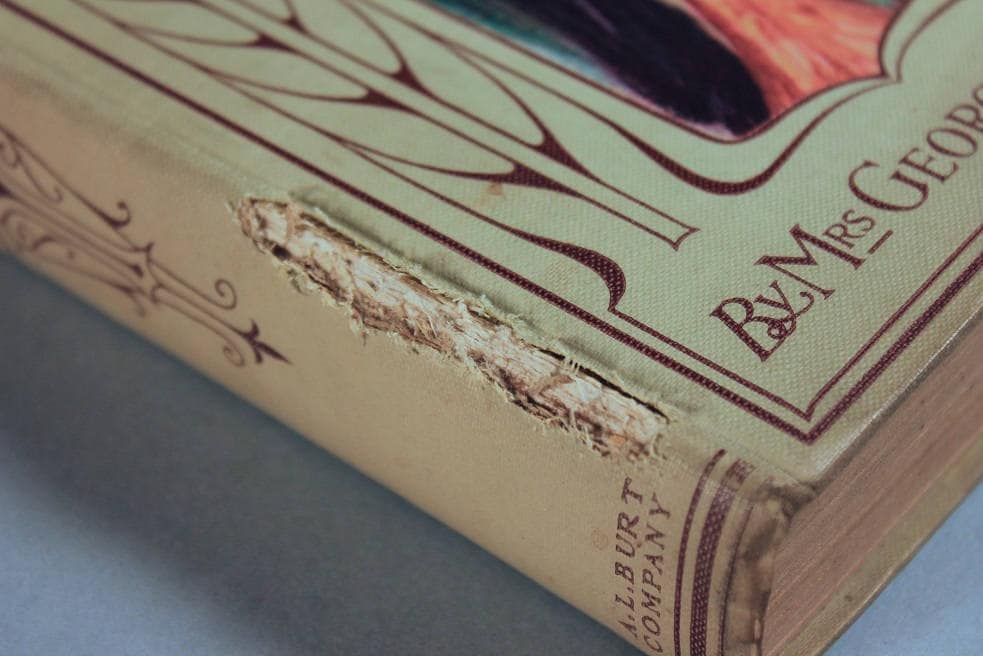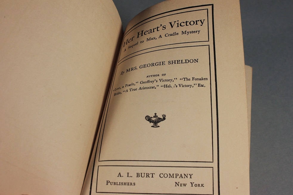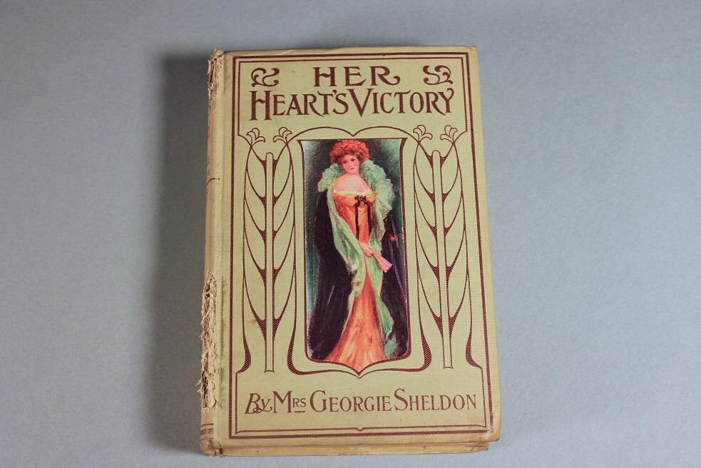 A hardcover fictional romance novel by Mrs. Georgie Sheldon. It is entitled Her Heart's Victory. This is an 1892 Edition but no dust cover. The book's hardcover is light green cloth with a portrait on the cover and brown printing.