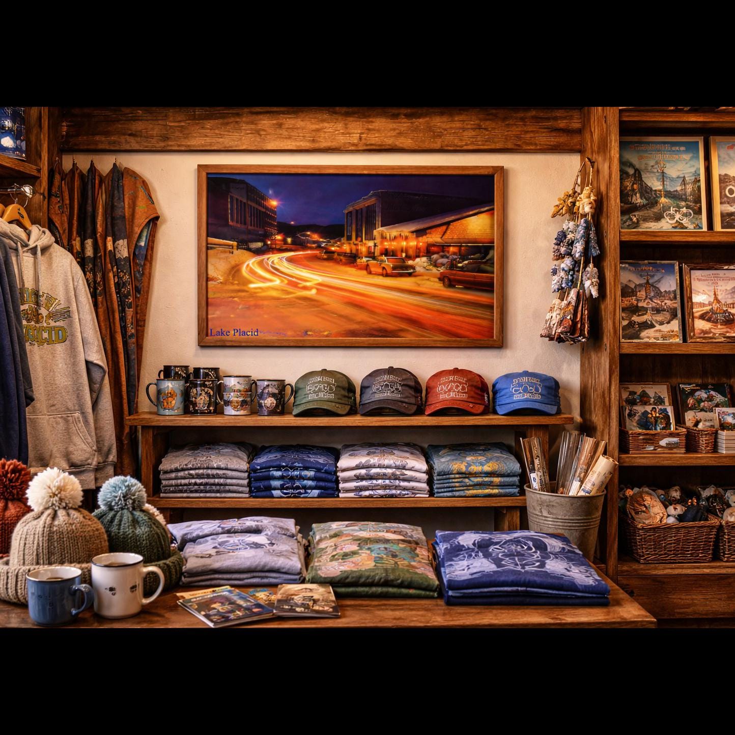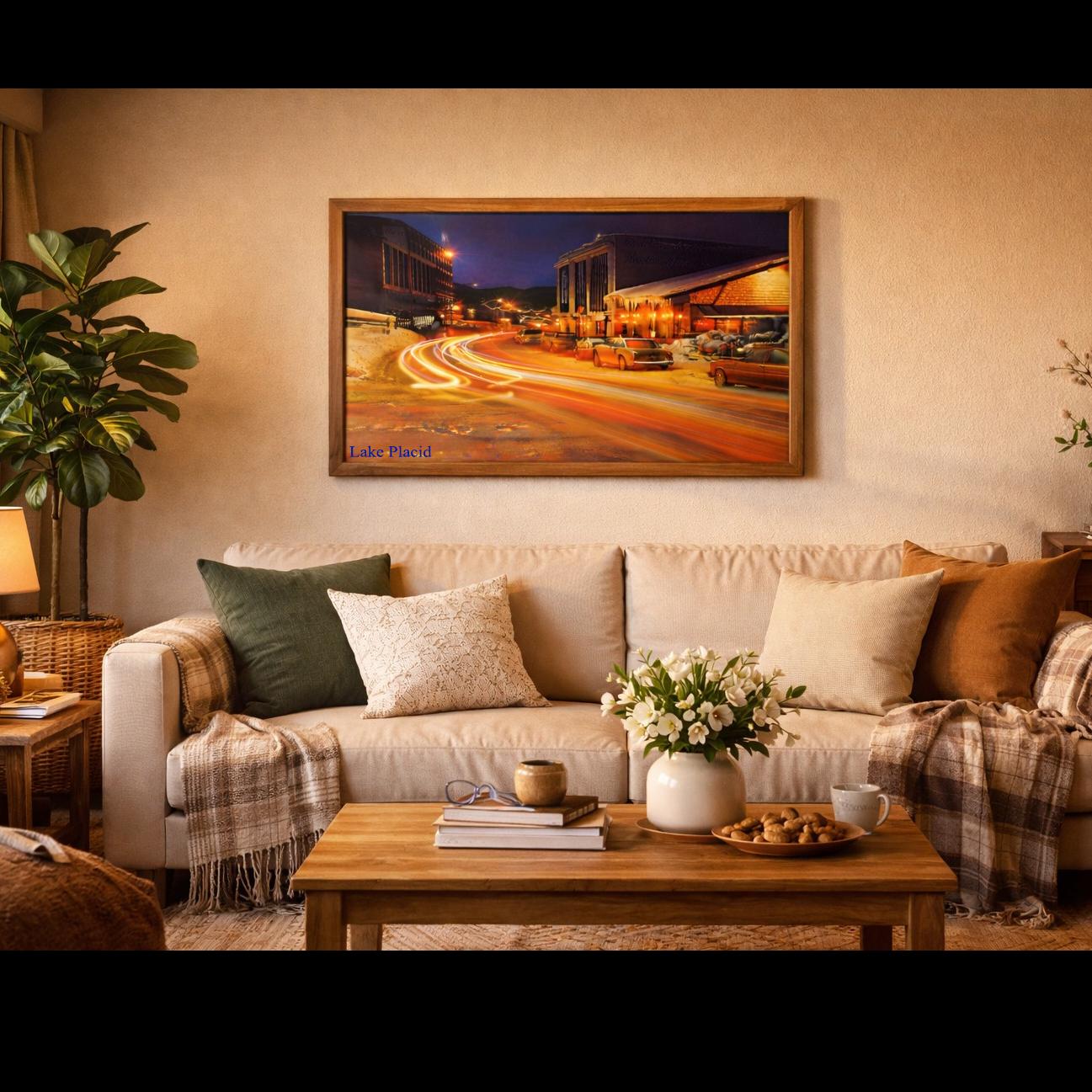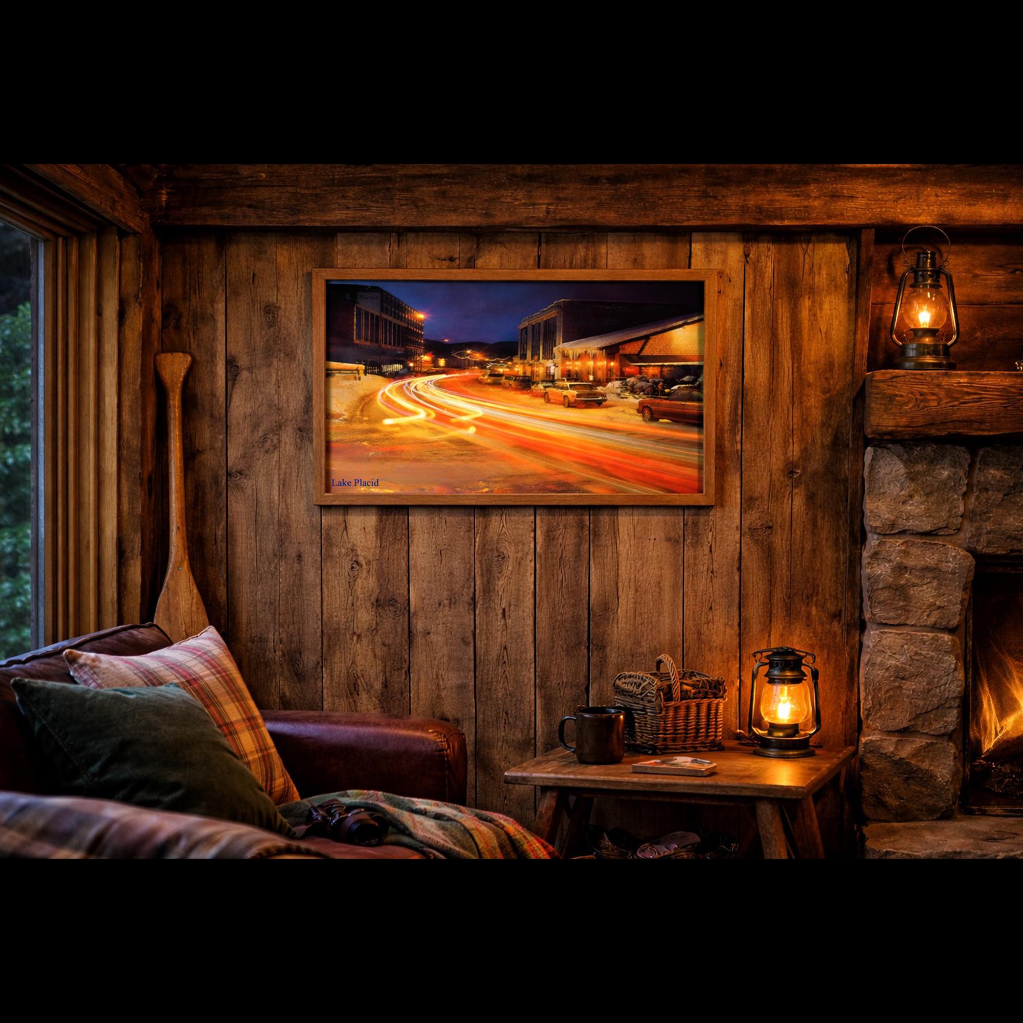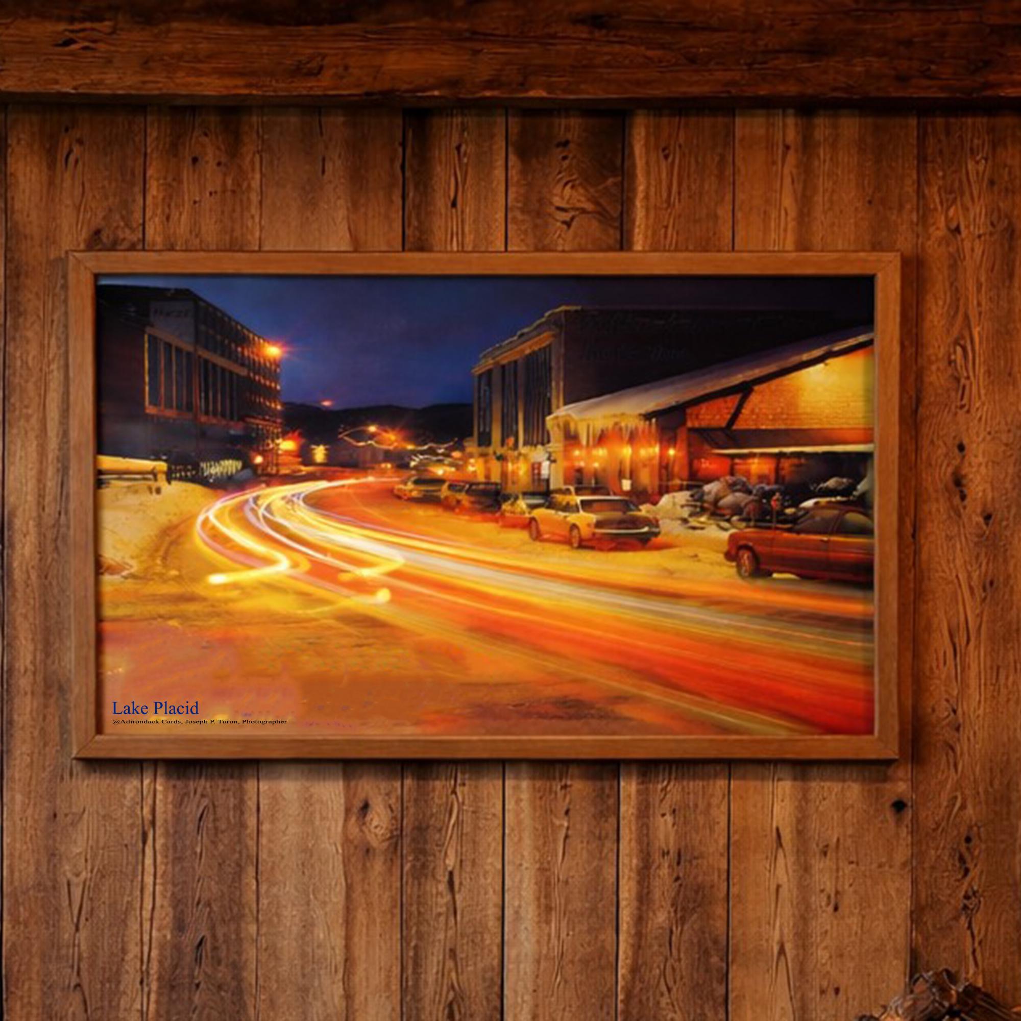 This original vintage photographic poster captures Main Street in Lake Placid, New York during winter at the height of the Olympic era. Photographed using a 15-minute nighttime exposure with 3 tricolor filters of red, green, and blue. The image records the movement and energy of the village as streams of light from passing cars sweep through its snowy street. The long exposure creates the glowing light trails that defined night photography of the period, preserving a moment from Lake Placid’s most historic years. More than a souvenir, this piece documents Lake Placid when the village stood at the center of the winter sports world.