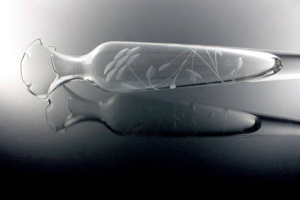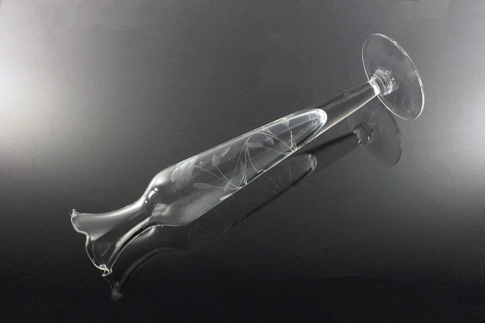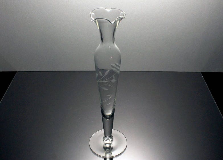 A lovely etched clear glass bud vase. It has a pedestal foot and a fluted rim. The floral pattern wraps around the vase. A perfect bud vase for those treasures from your garden.