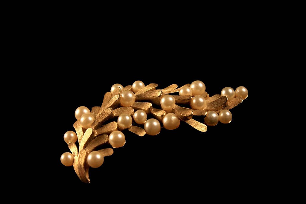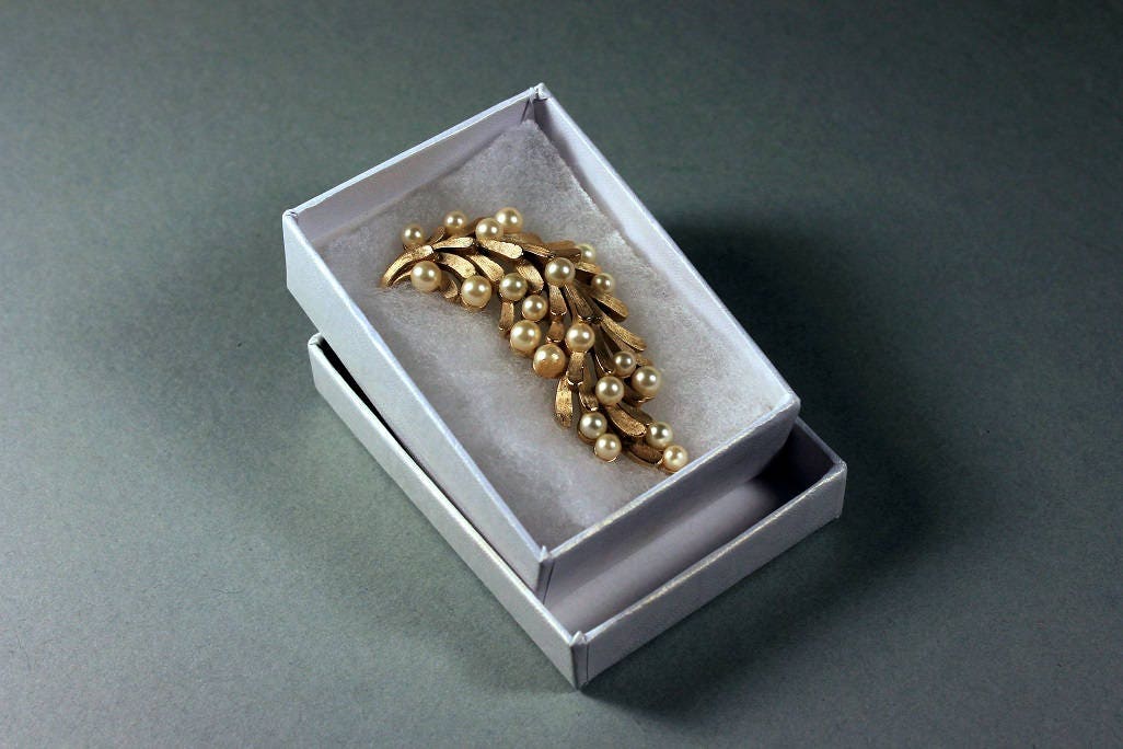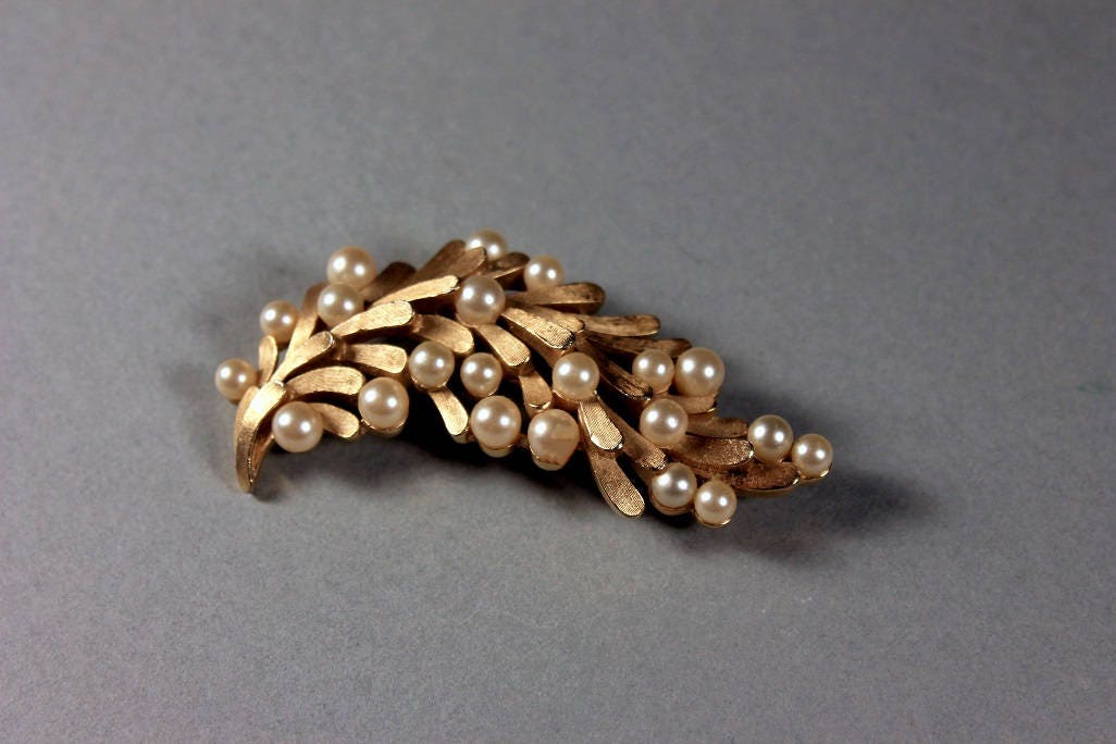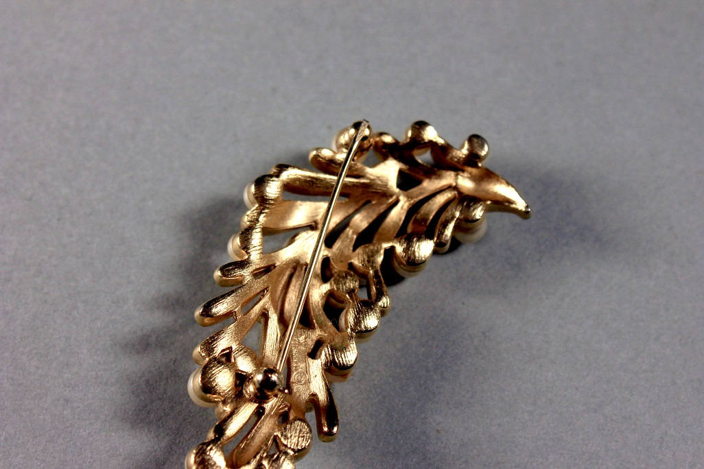 This is a beautiful gold tone faux pearl brooch by Crown Trifari. This brooch is in the design of a bough of leaves. The faux pearls look like berries surrounded by brushed gold leaves. It has a locking c-clasp closure. It could be attached to a cardigan or lapel, used to close a sweater or scarf, or on the center of a garment’s neckline. A wonderful collectible brooch that would make a perfect gift idea.