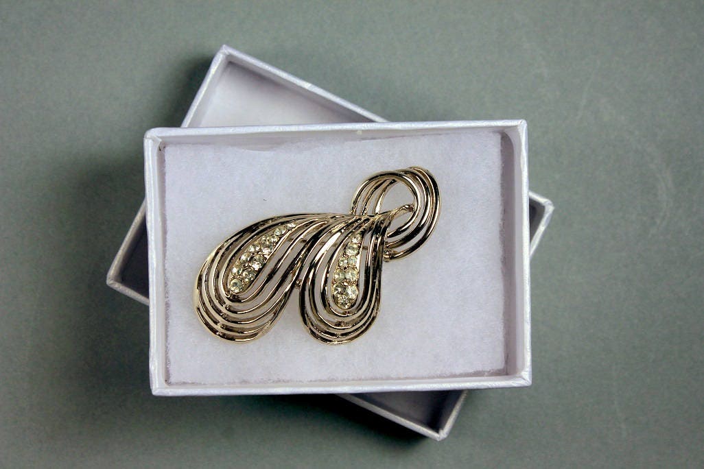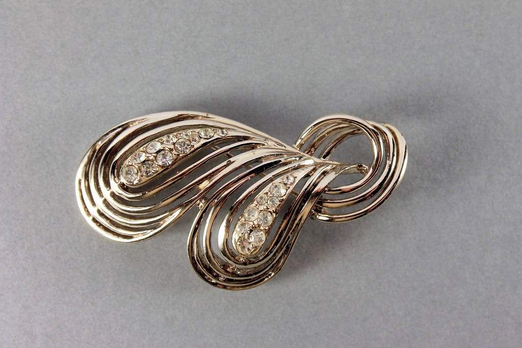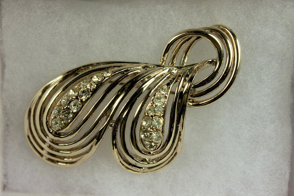 This is a beautiful and very shiny gold tone statement brooch. The brooch has many clear rhinestones set in a swirl design. It has a c-clasp closure. This would be a wonderful addition to an evening outfit. It could be attached to a cardigan or lapel, used to close a sweater or scarf, or on the center of a garment’s neckline. A wonderful collectible brooch that would make a perfect gift idea.