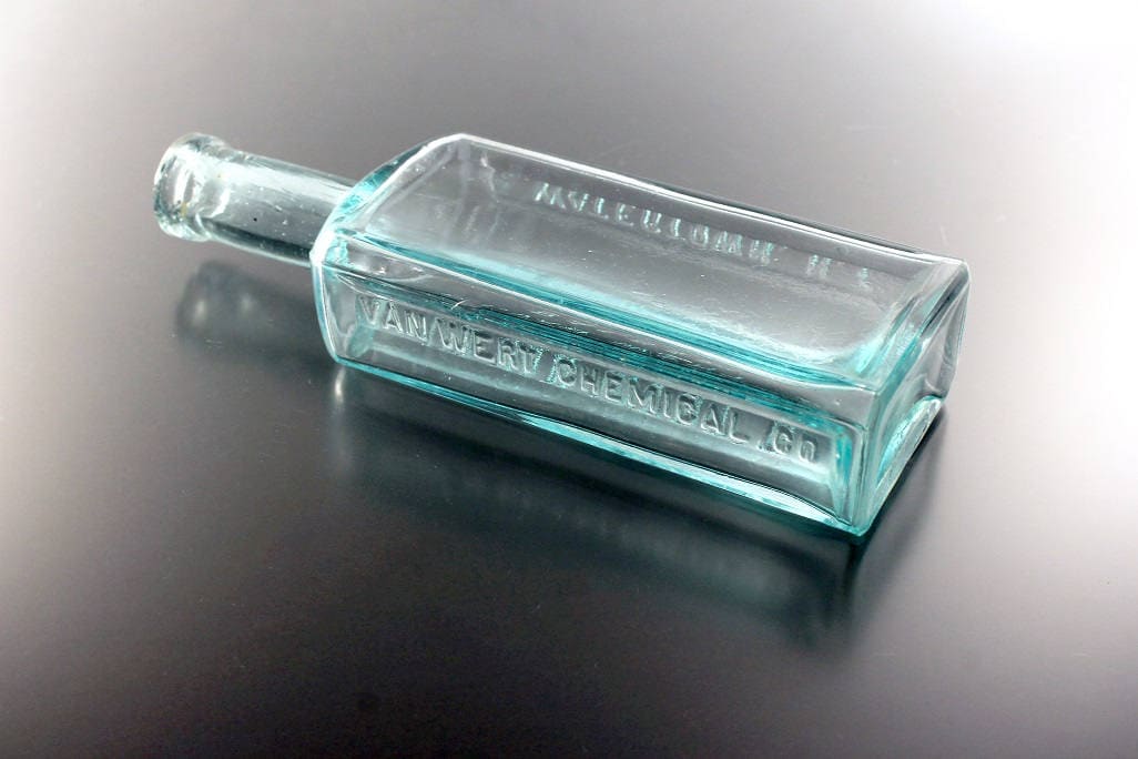 A wonderful aqua antique bottle. This is Dr. Van Wert's Balsam. This bottle is from circa 1800s. The bottle is embossed with "Dr. Van Wert's Balsam" on the front, Van Wert Chemical Co on one side, Watertown NY on the other side. This would be an ideal addition to a pharmaceutical bottle collection. A great gift idea for a collector.