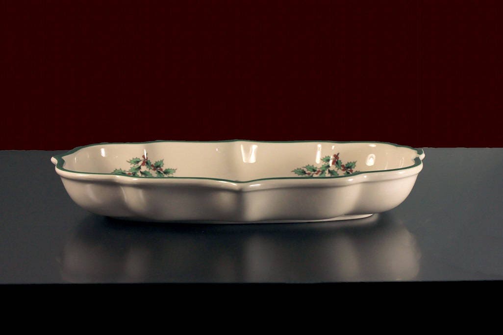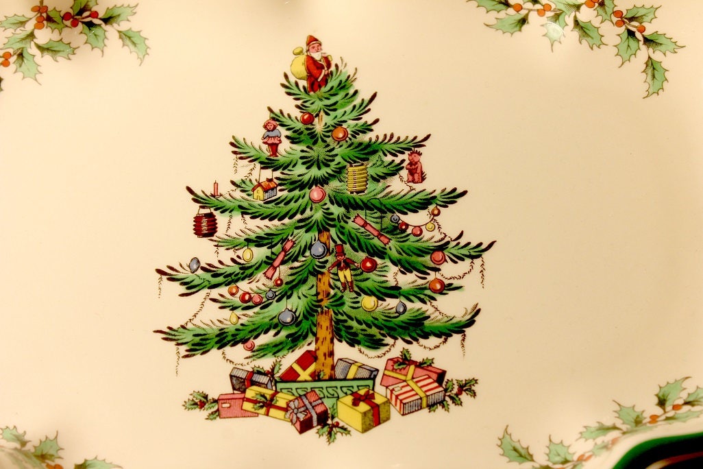 A beautiful Christmas ogee candy dish by Spode and made in England. The pattern is called Christmas Tree and features a Christmas tree with presents underneath. This pattern was started in 1938 and has been a highly prized holiday china service ever since. It would be a great addition or replacement piece for a set. Also, it would be a fantastic holiday gift idea.