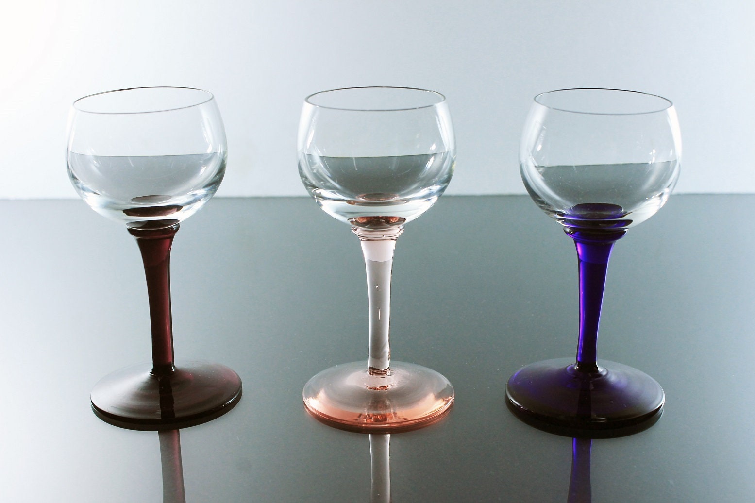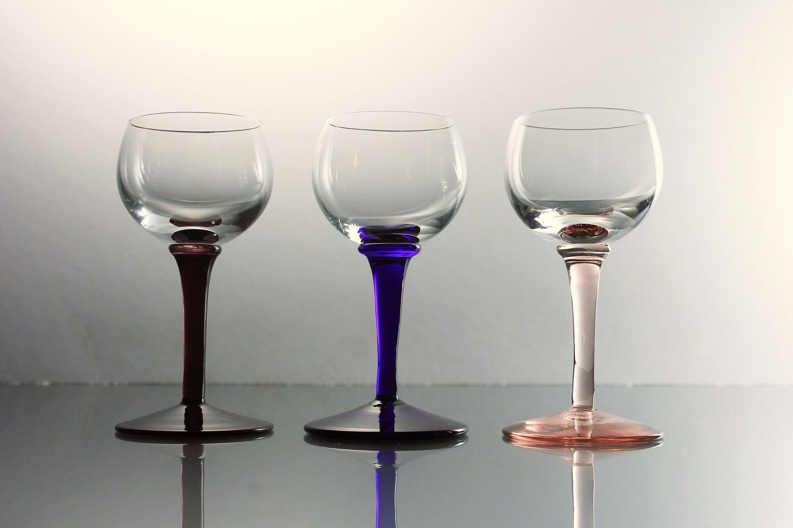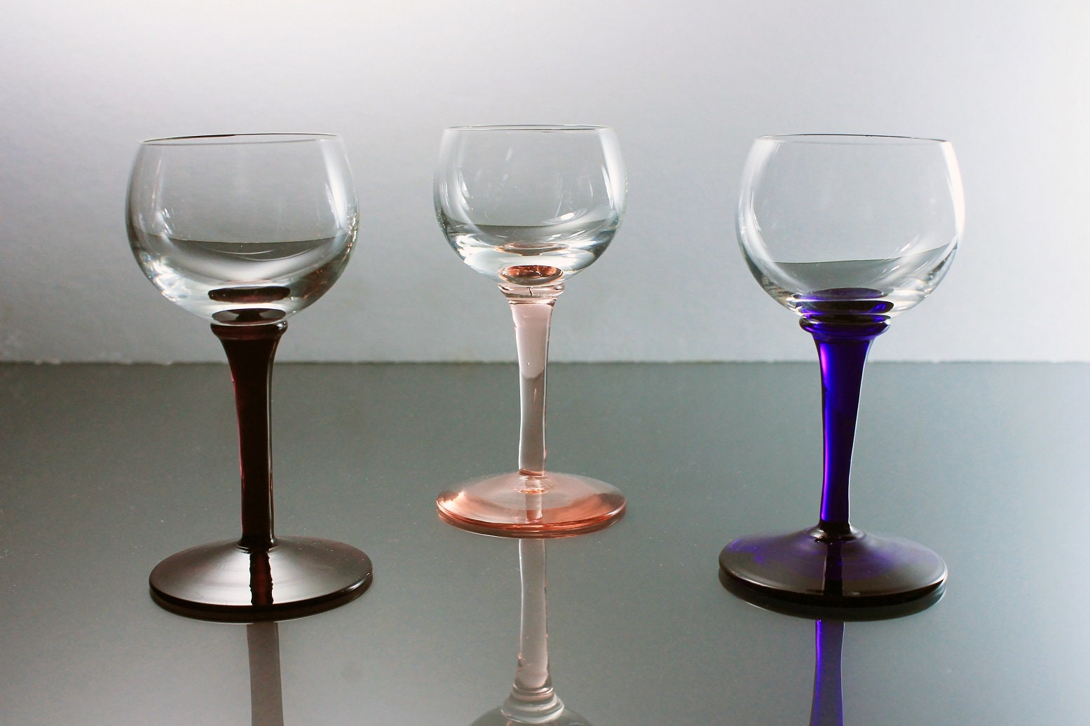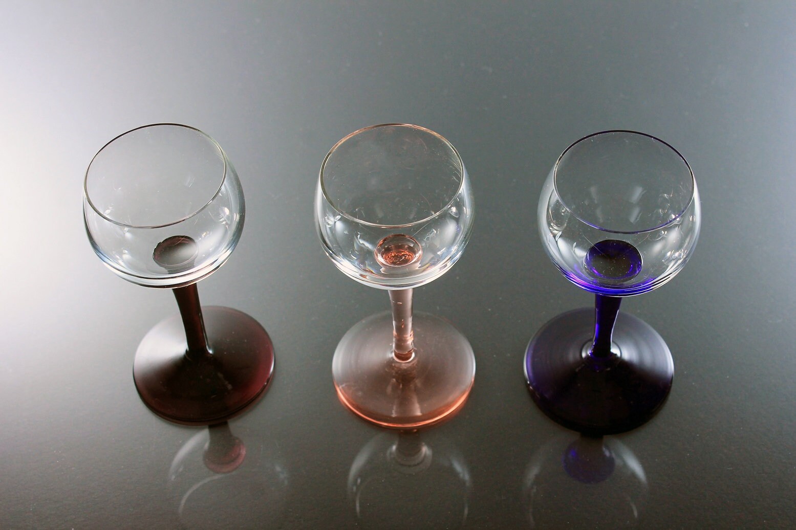 A beautiful set of three cordial glasses. These glasses would be perfect for any dessert wine or liqueur. The bowls are clear and the stems are different colors. The stems are pink, dark purple, and dark blue. This set would be perfect for a home bar or man cave. Great for entertaining.