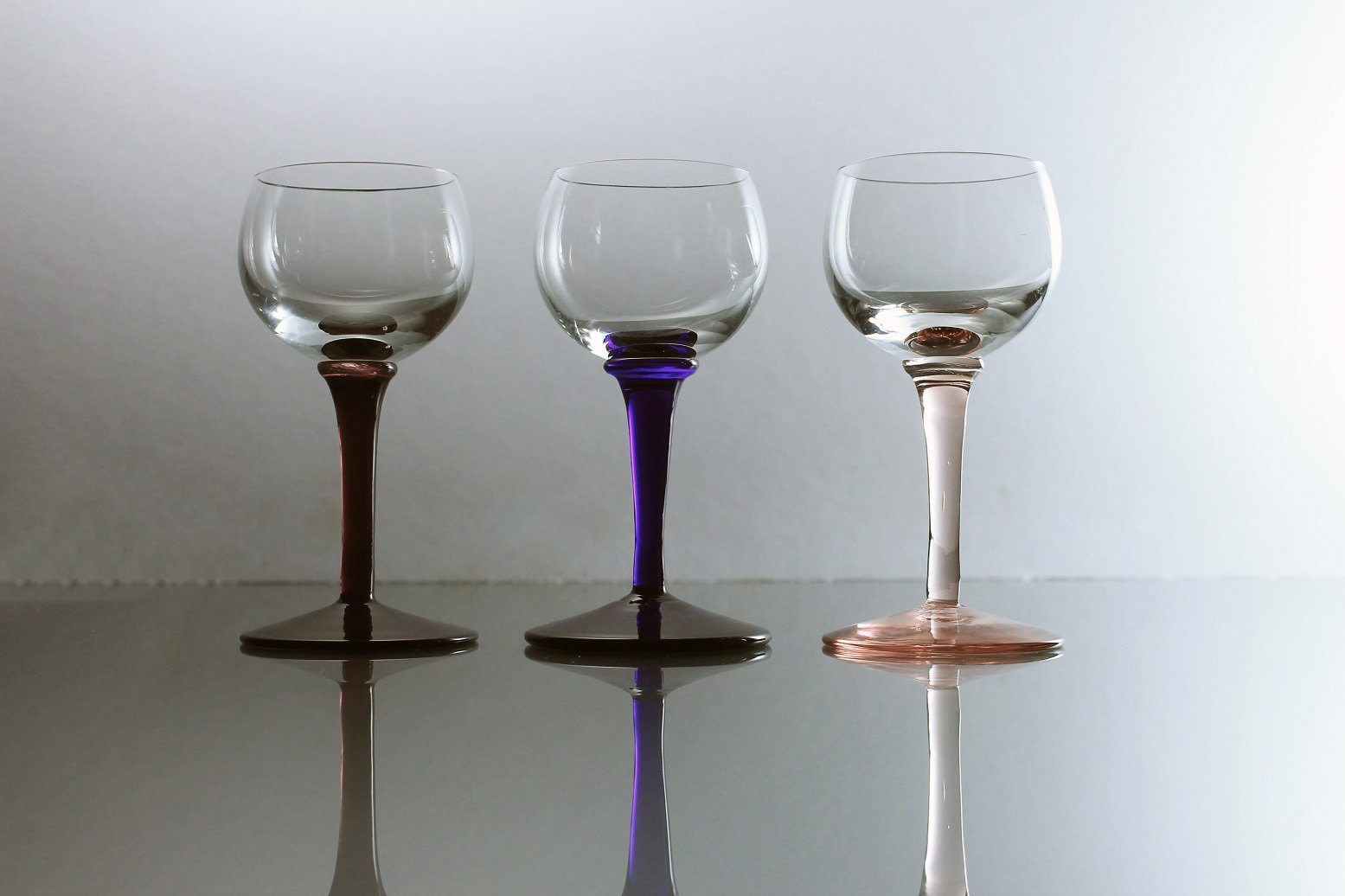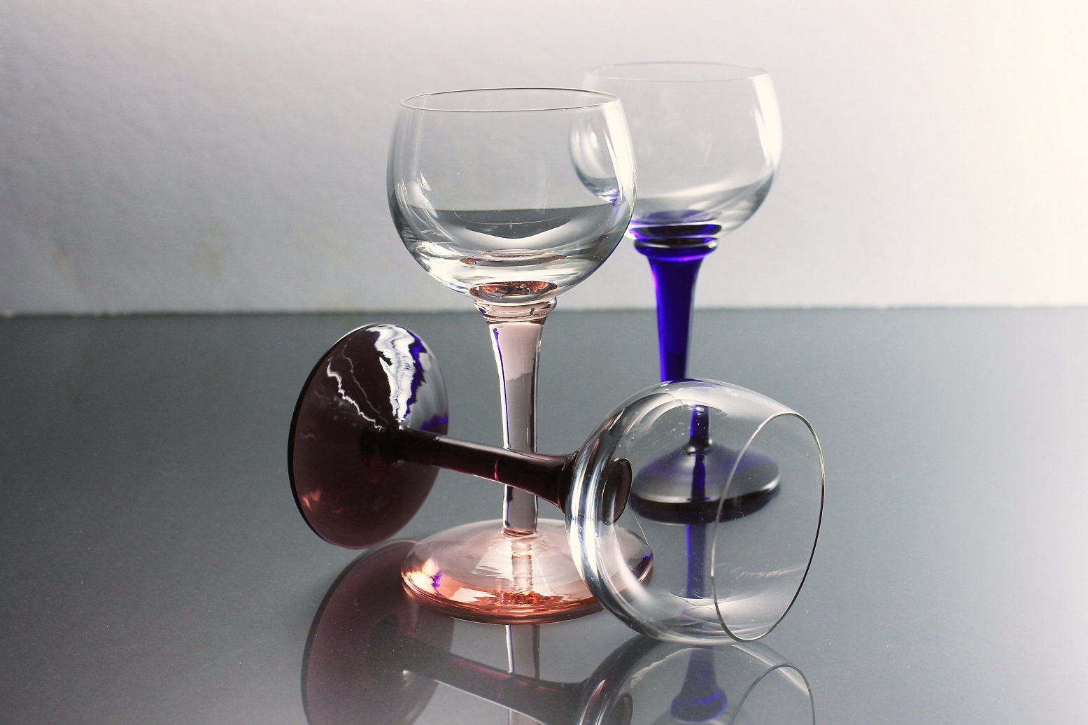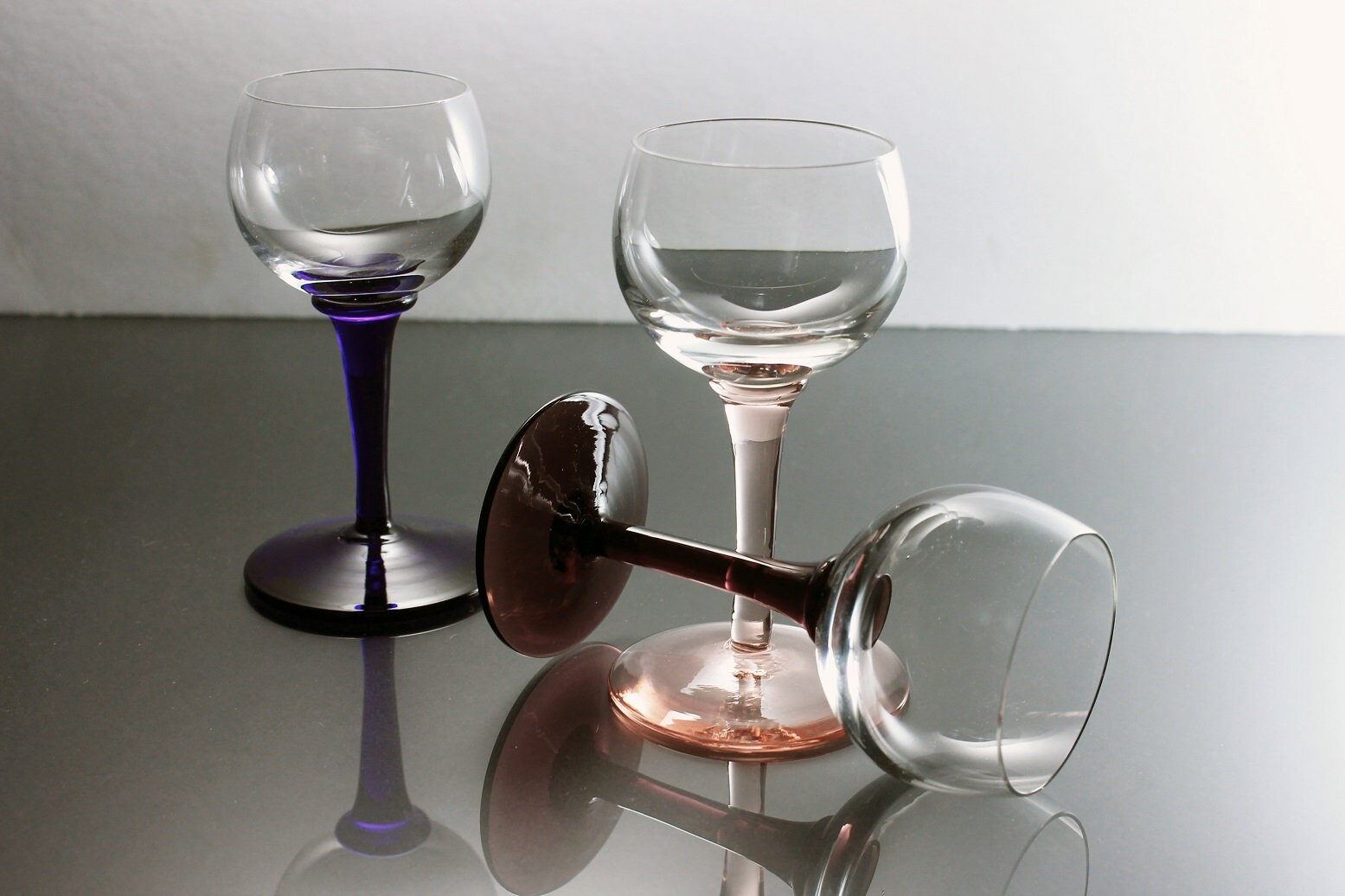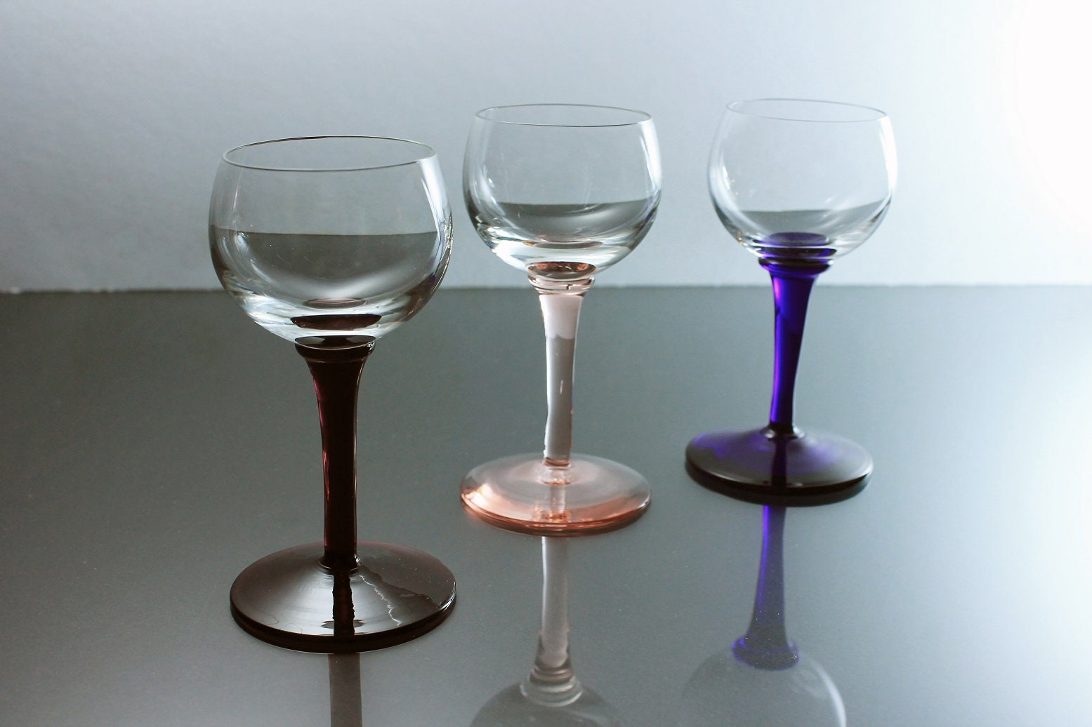 A beautiful set of three cordial glasses. These glasses would be perfect for any dessert wine or liqueur. The bowls are clear and the stems are different colors. The stems are pink, dark purple, and dark blue. This set would be perfect for a home bar or man cave. Great for entertaining.