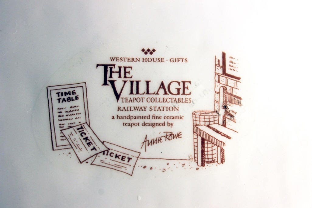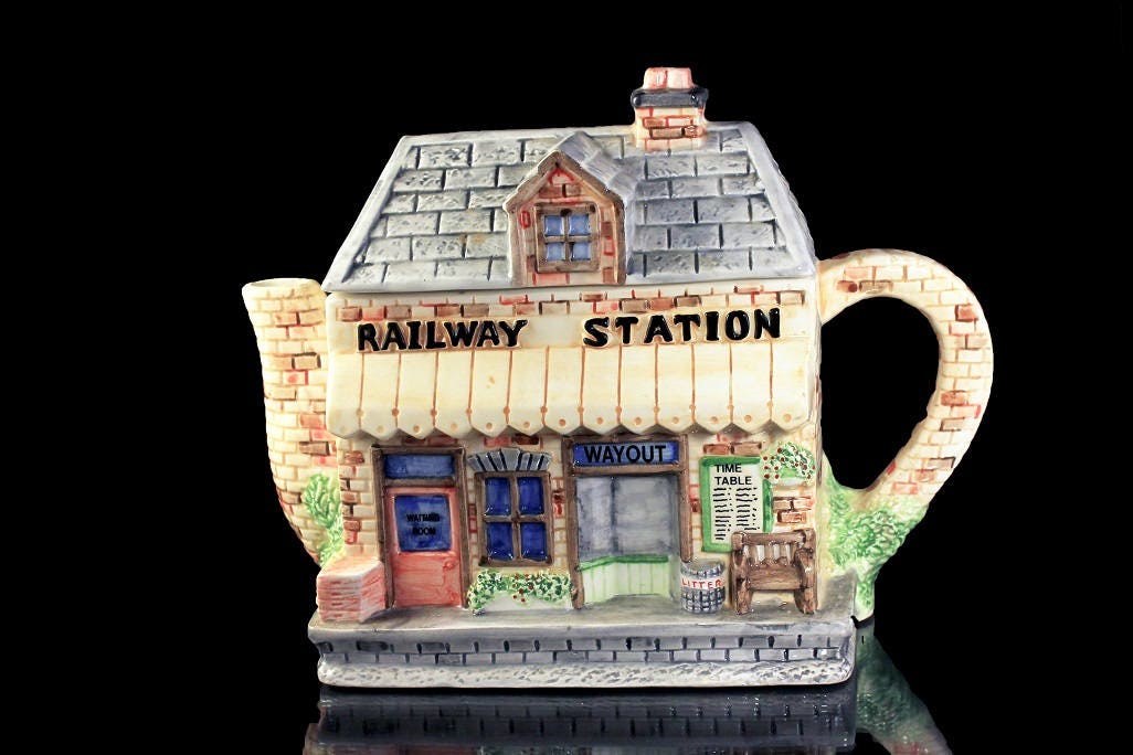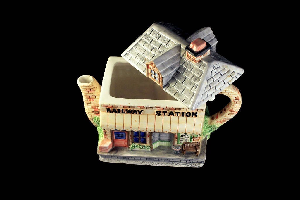 A whimsical ceramic railway station shaped teapot. It was made by Western House Gifts and the designer was Annie Rowe. The lid makes up part of the roof and the bottom is the station. A great gift idea for any teapot collector. A fun and a unique teapot that would be perfect for that morning cup of tea.