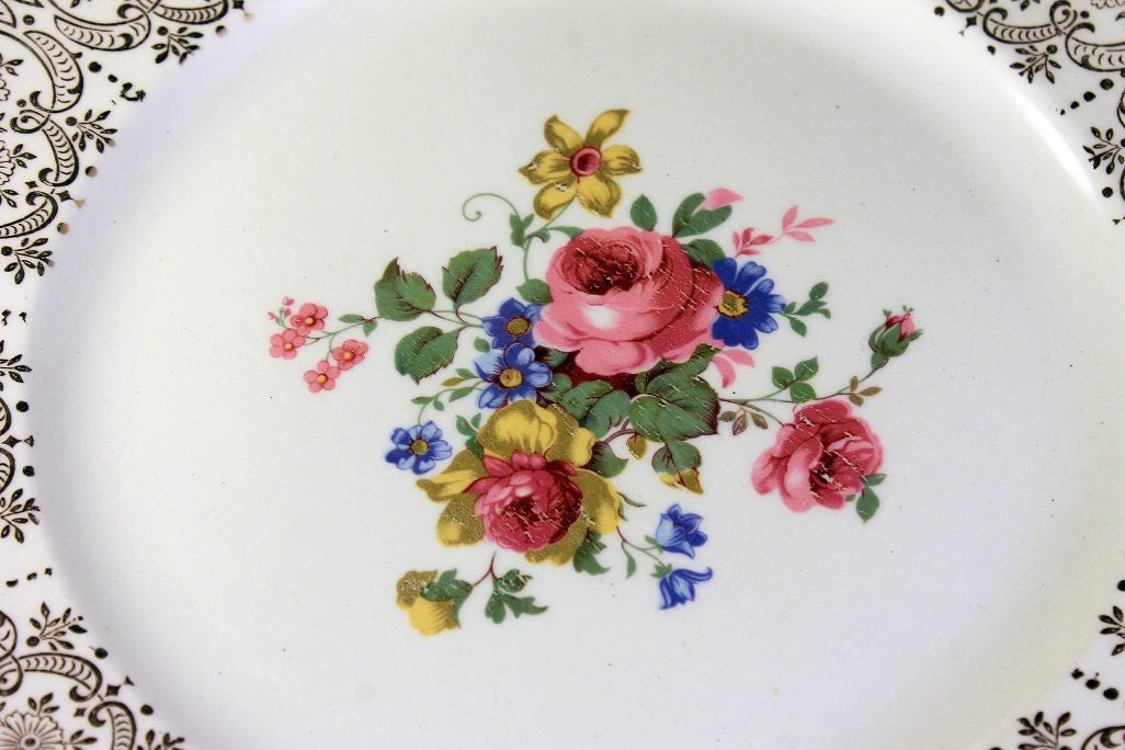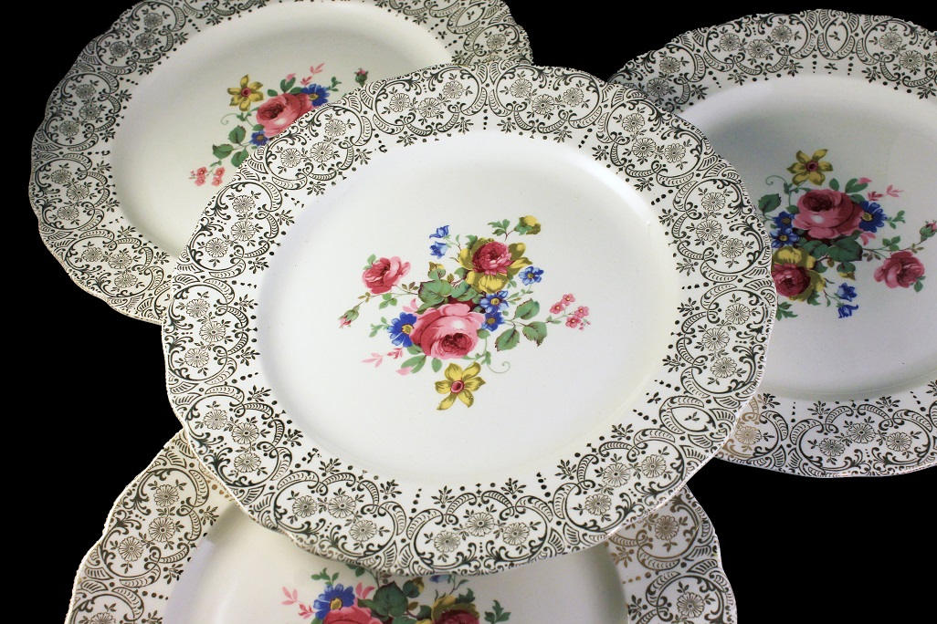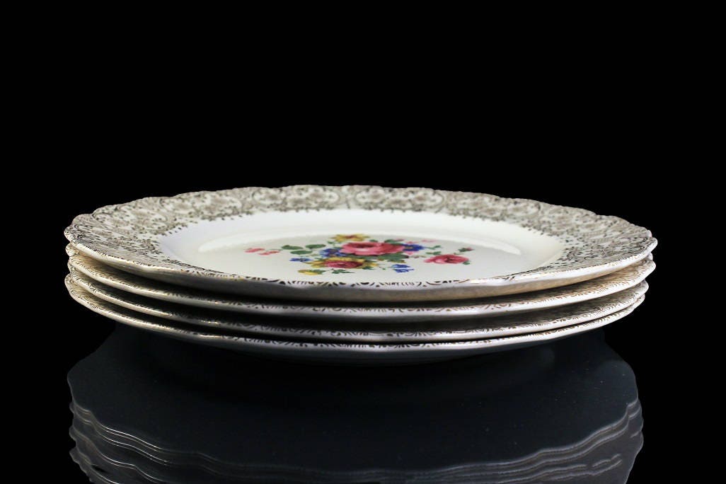 Dinner Plates, Canonsburg Pottery Company, Set of 4, Warranted 22 Karat Gold, Rose Floral Pattern, Gold Filigree