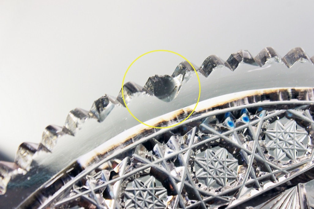 One of the many ways to tell original American Brilliant cut glass is to check it under a black light. If it is real it will fluoresce a lime green color. This item has been checked and does. Also, the cuts in the glass are sharp and the glass is heavy for its size.