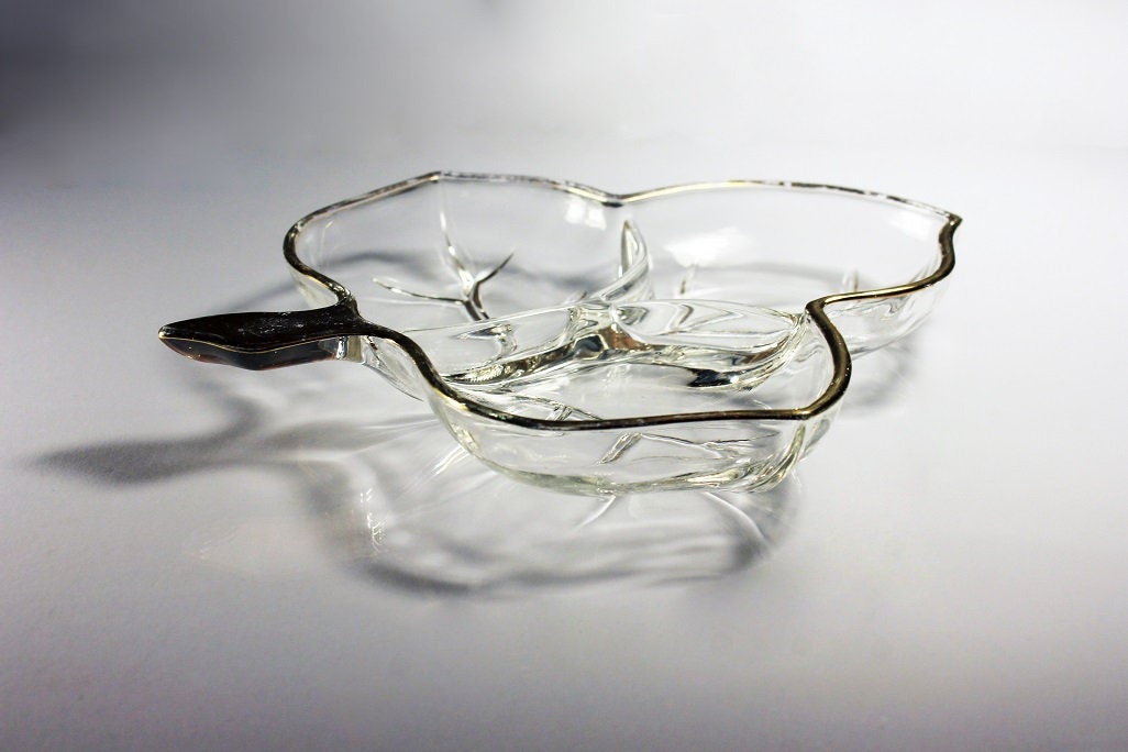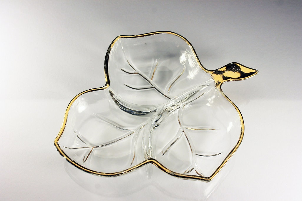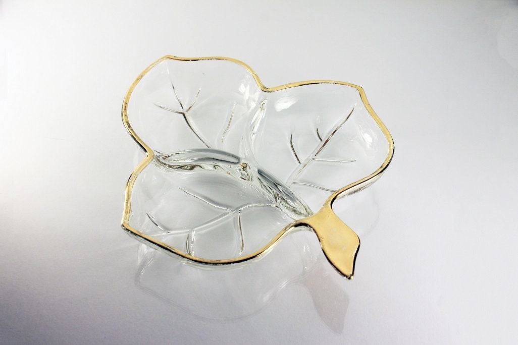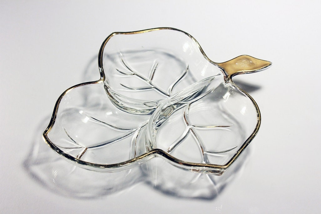 Leaf Divided Relish Dish, Hazel Atlas, Leaf Pattern, Trinket Dish, Candy Bowl, Nut Bowl, Gold Trimmed, Three Section