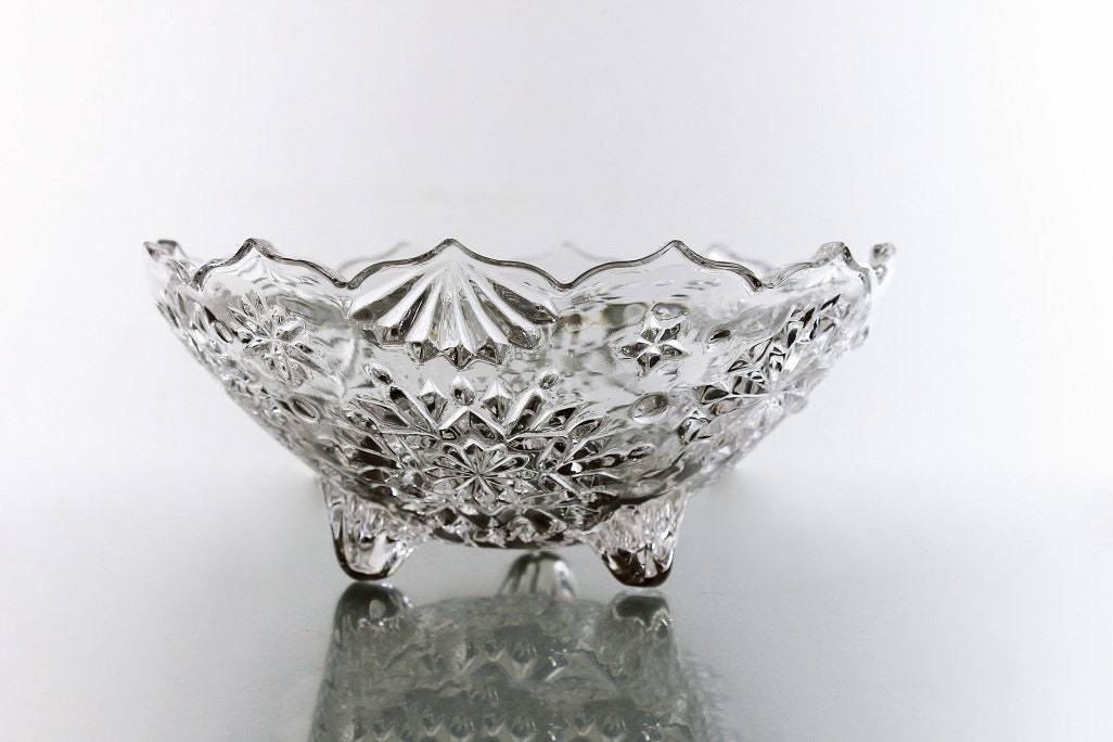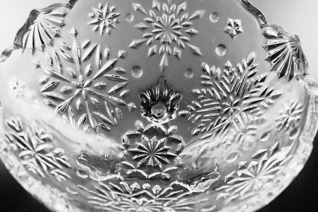 Mikasa Crystal Footed Bowl, Snowflake Pattern, Candy Dish, Nut Bowl, Holiday Dish, Christmas Bowl, Pressed Glass, Clear