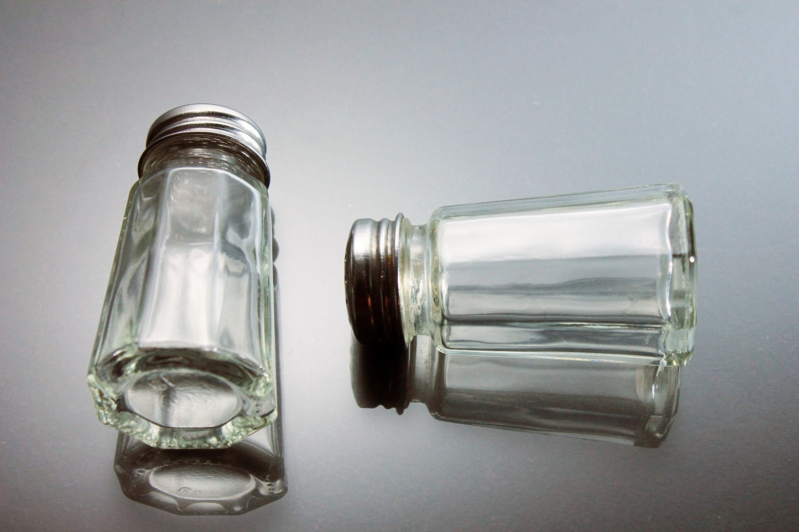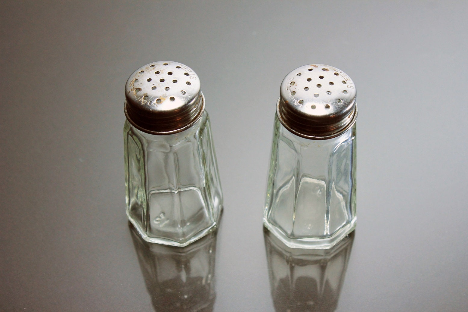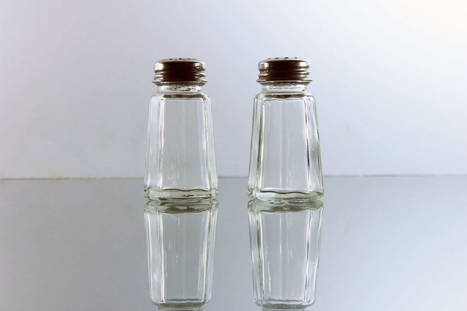 Octagon Salt and Pepper Shakers, Stainless Steel Tops, Clear Glass, Heavy Pressed Glass, Diner Style, Small