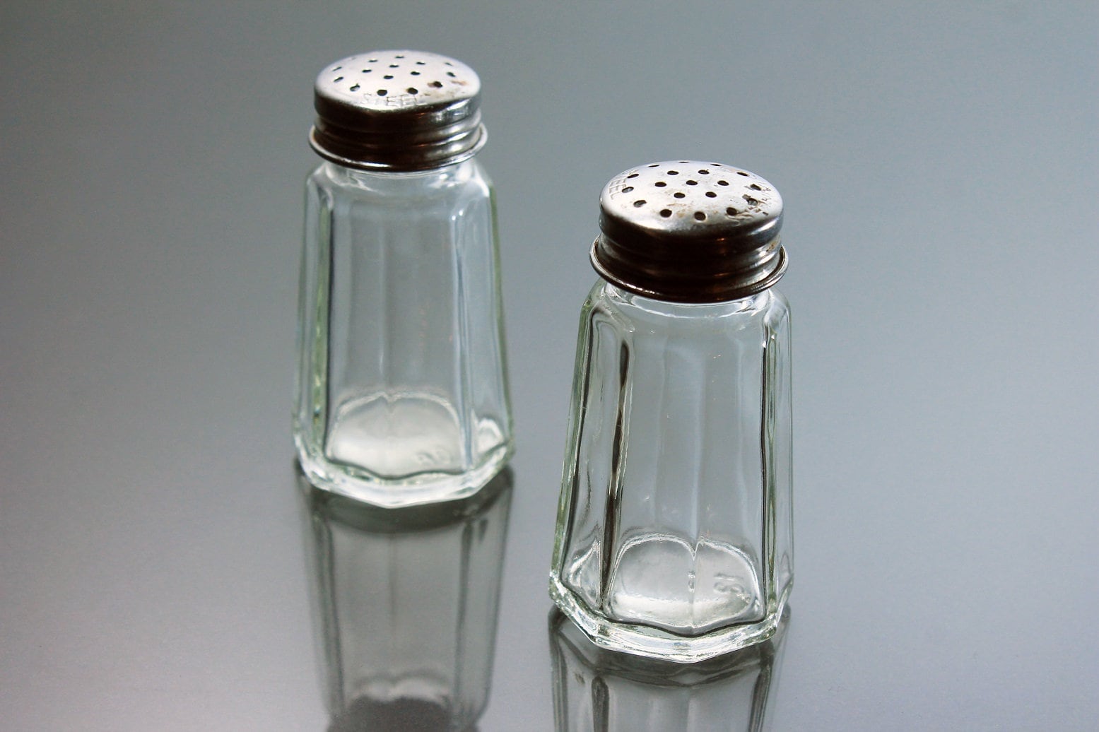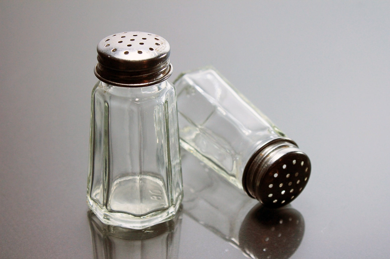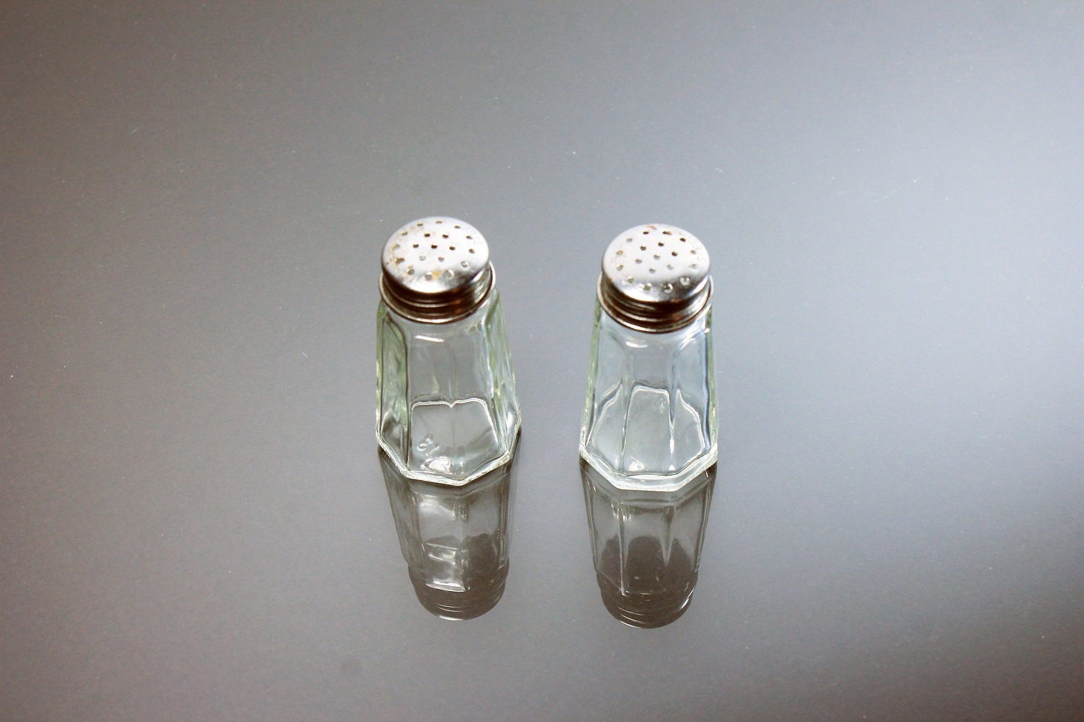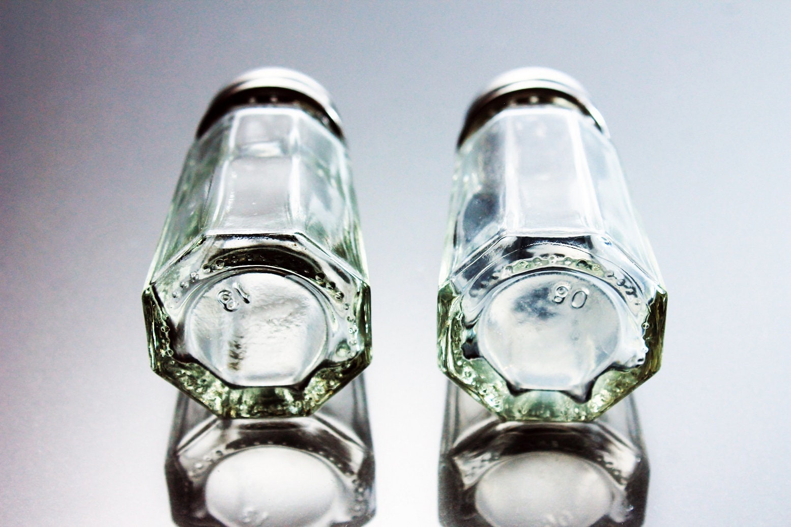 Octagon Salt and Pepper Shakers, Stainless Steel Tops, Clear Glass, Heavy Pressed Glass, Diner Style, Small