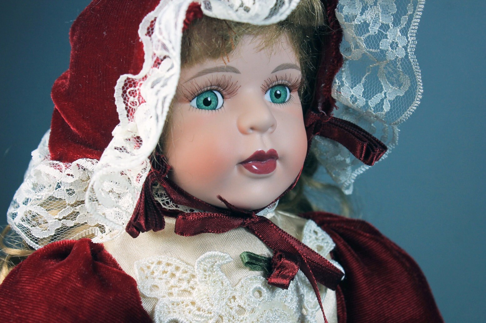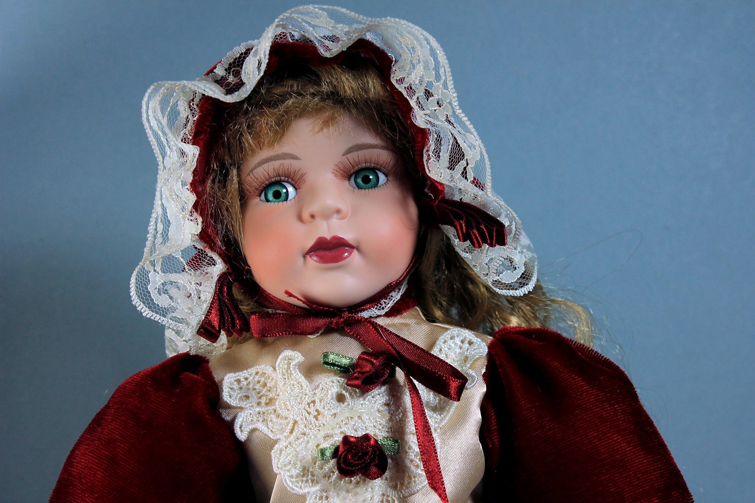 A lovely porcelain doll from The Samantha Collection by Samantha Medici. Her dress is a lovely red velvet with white lace and floral dress with matching hat. She has light brown hair and bright green eyes with lifelike lashes. Her head, hands, and feet are porcelain. She comes with a doll stand. What a great doll to add to a collection.