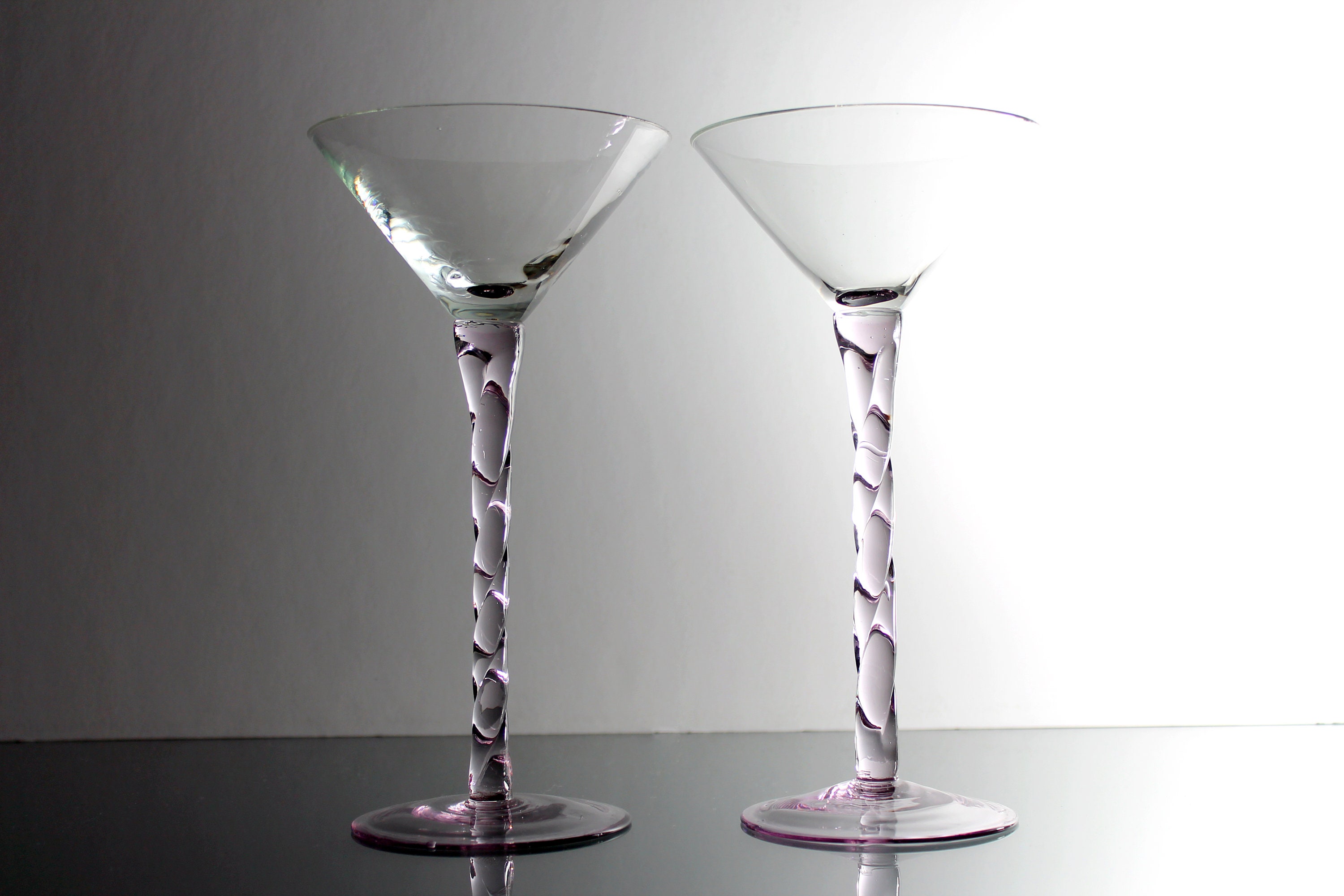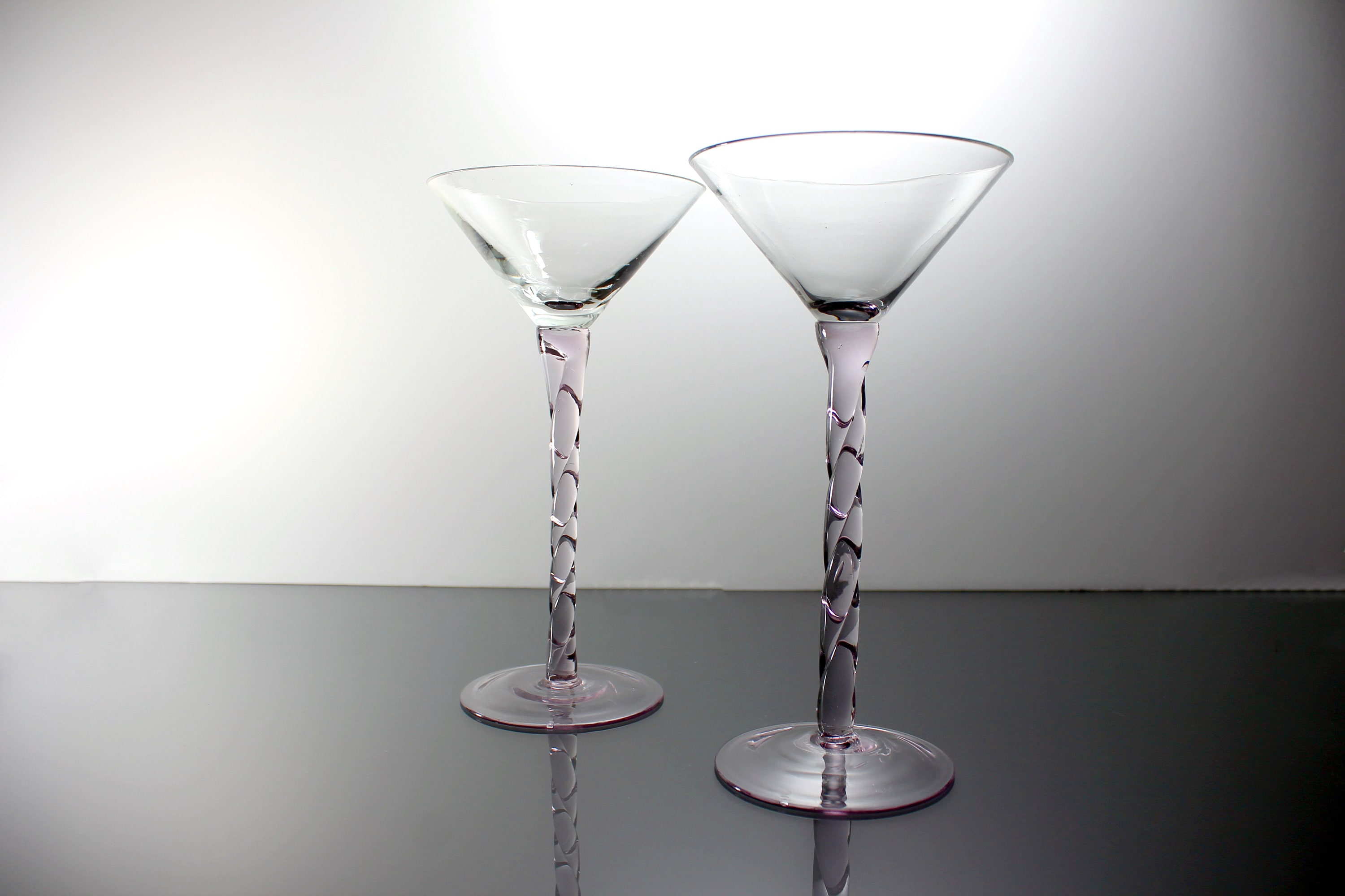 Tall Martini Glasses, Pink Twisted Stem, Set of 2, Handblown, Barware