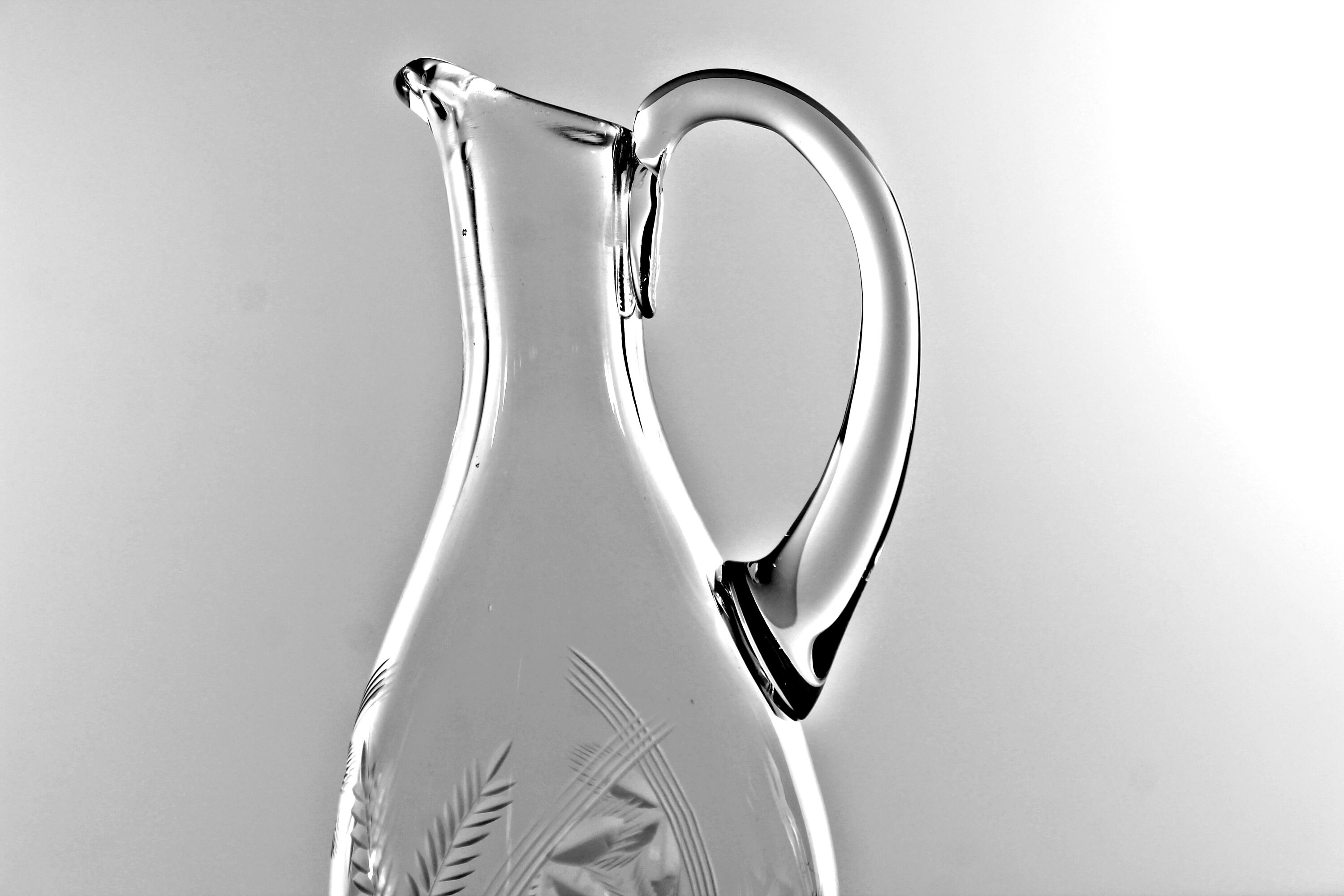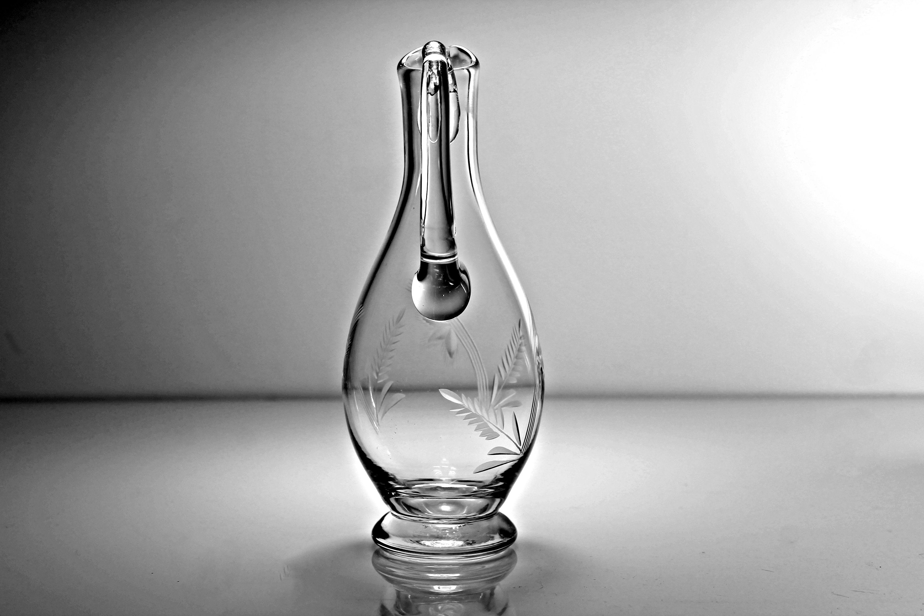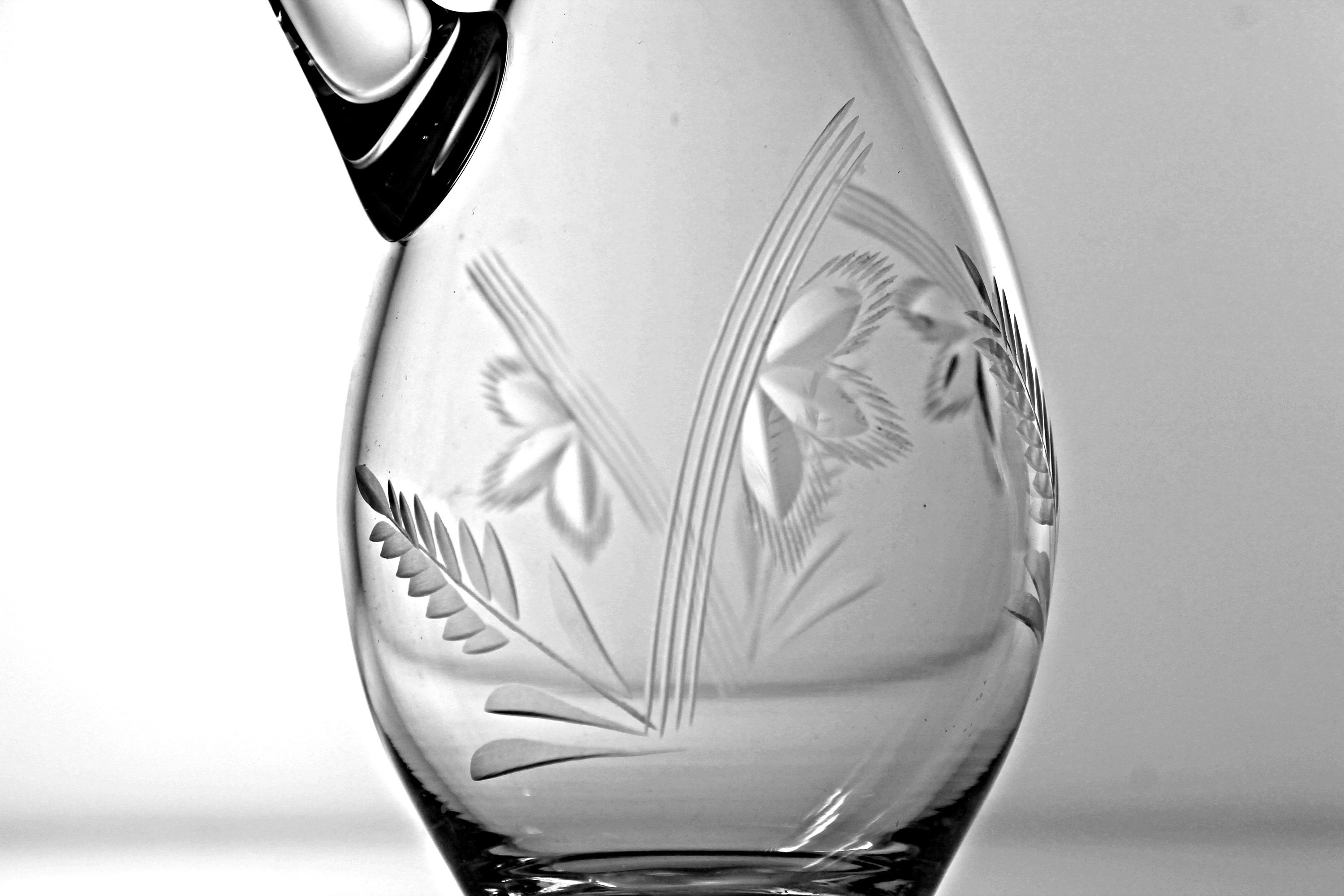 A beautifully etched glass cruet in a leaf pattern. It does not have a stopper. This would be perfect for oil or vinegar for use at a dining table. A wonderful gift idea.