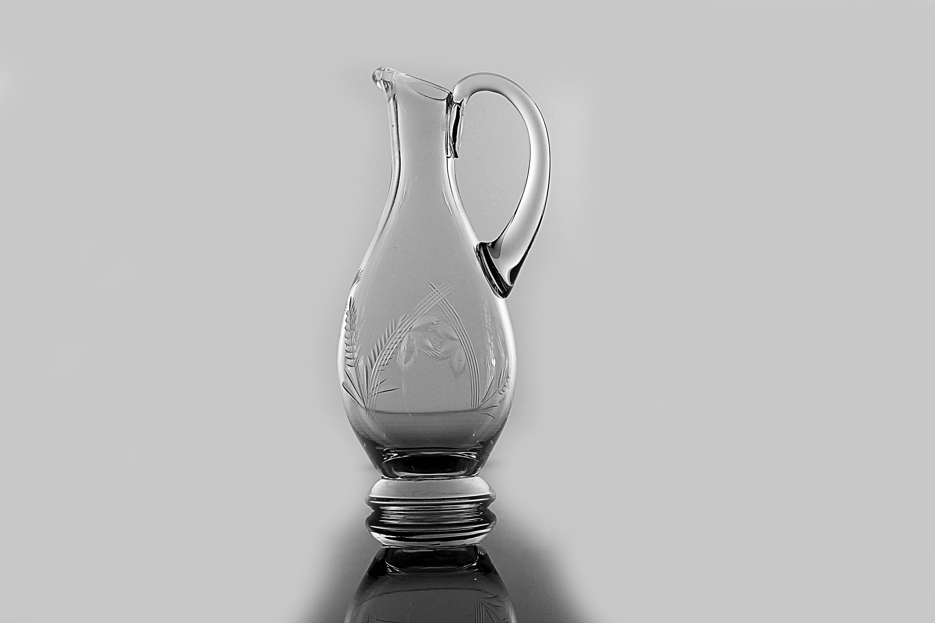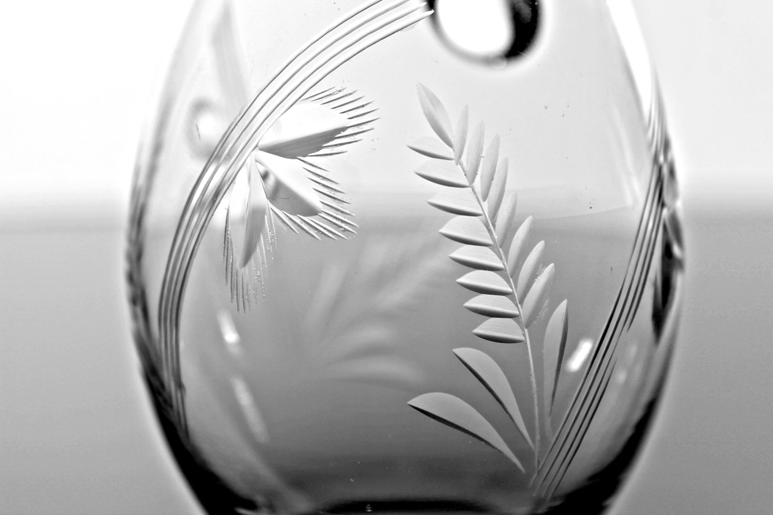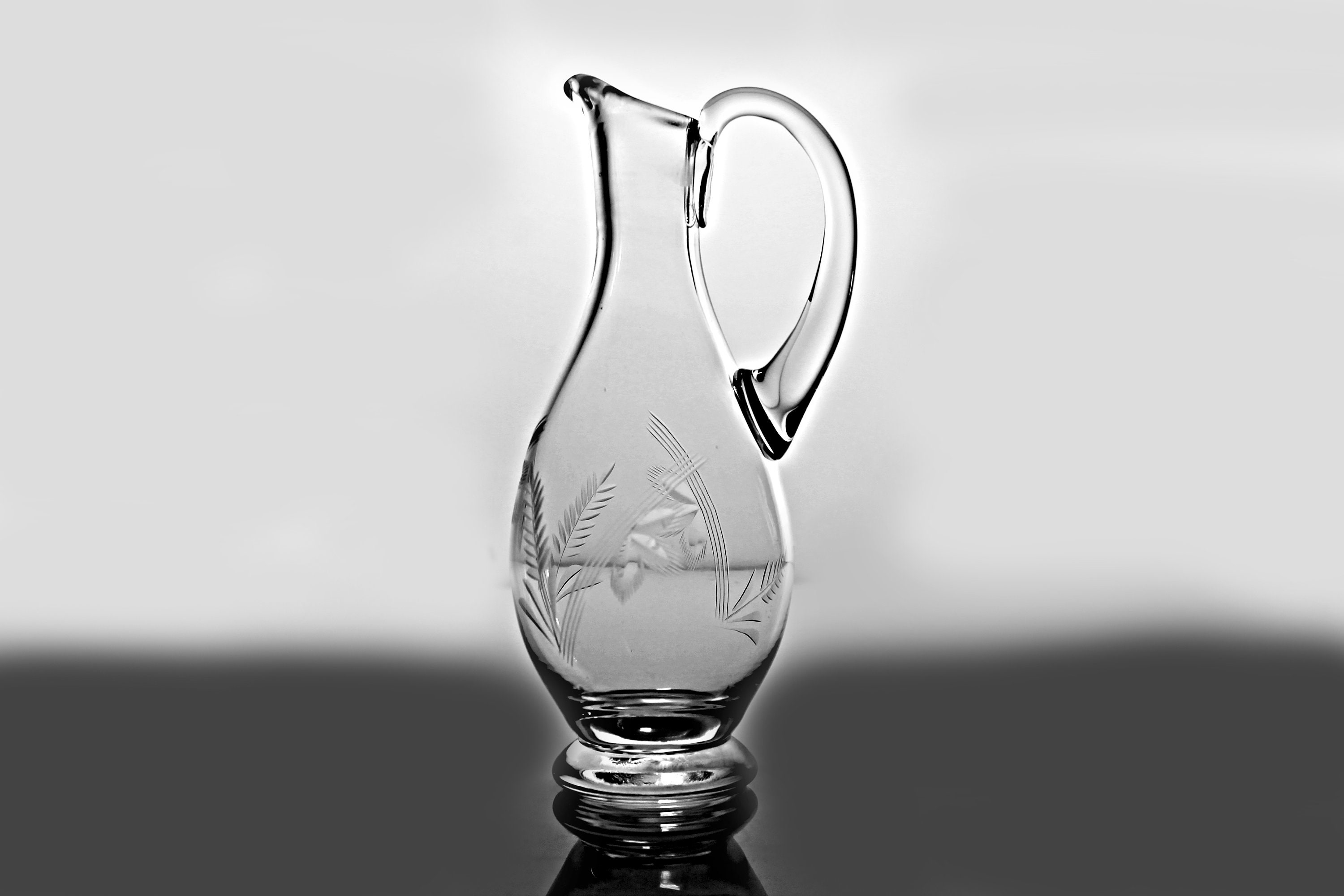 A beautifully etched glass cruet in a leaf pattern. It does not have a stopper. This would be perfect for oil or vinegar for use at a dining table. A wonderful gift idea.