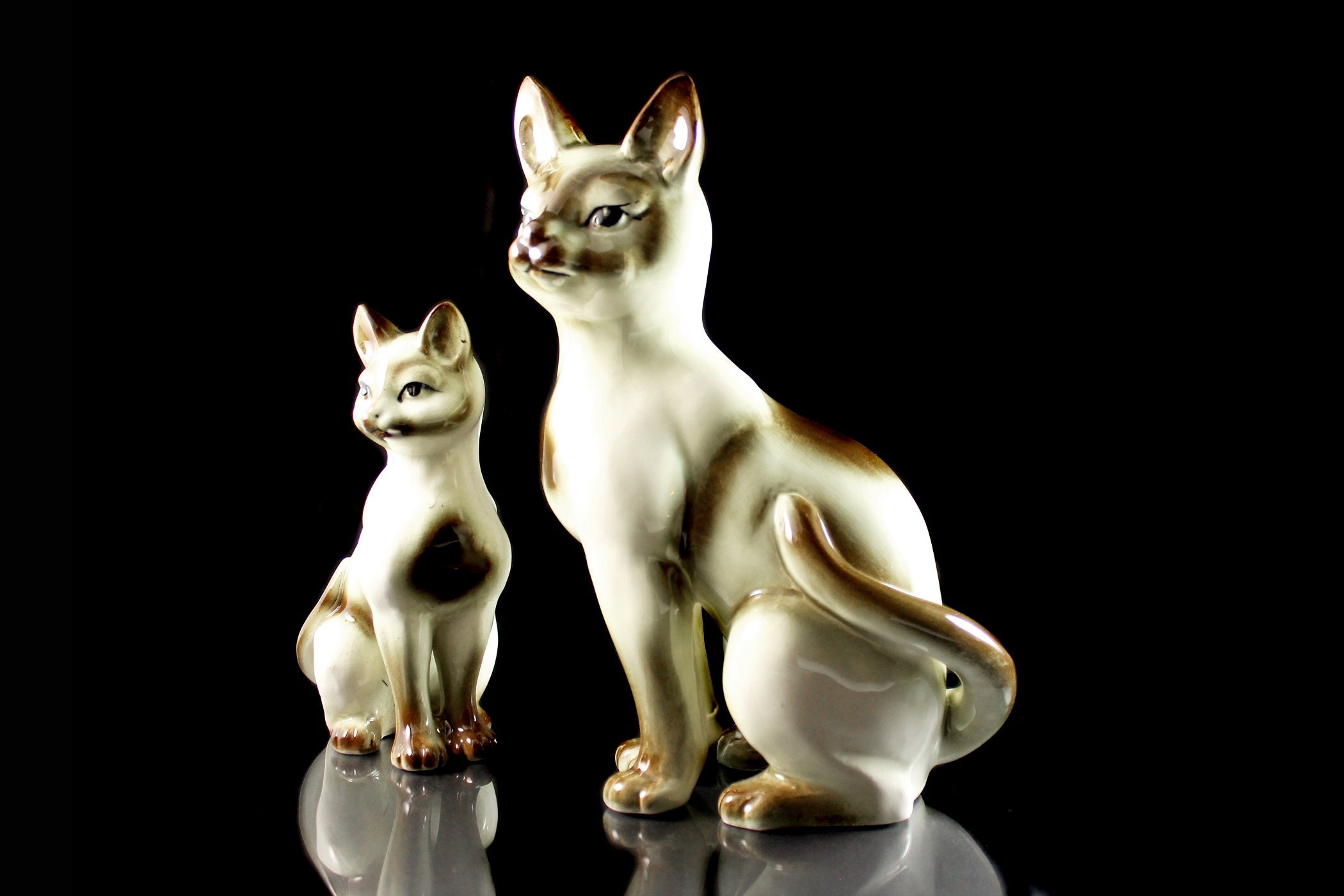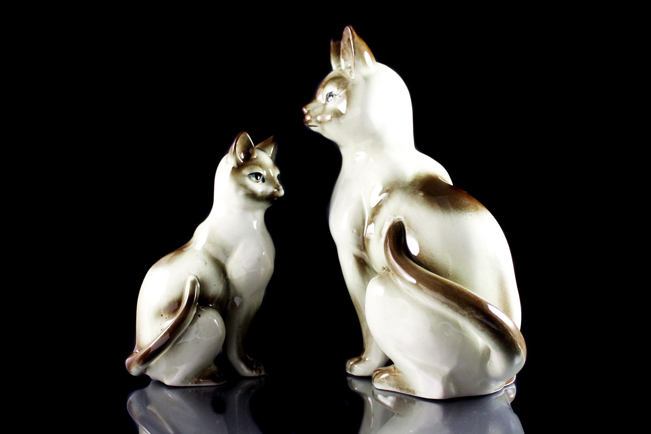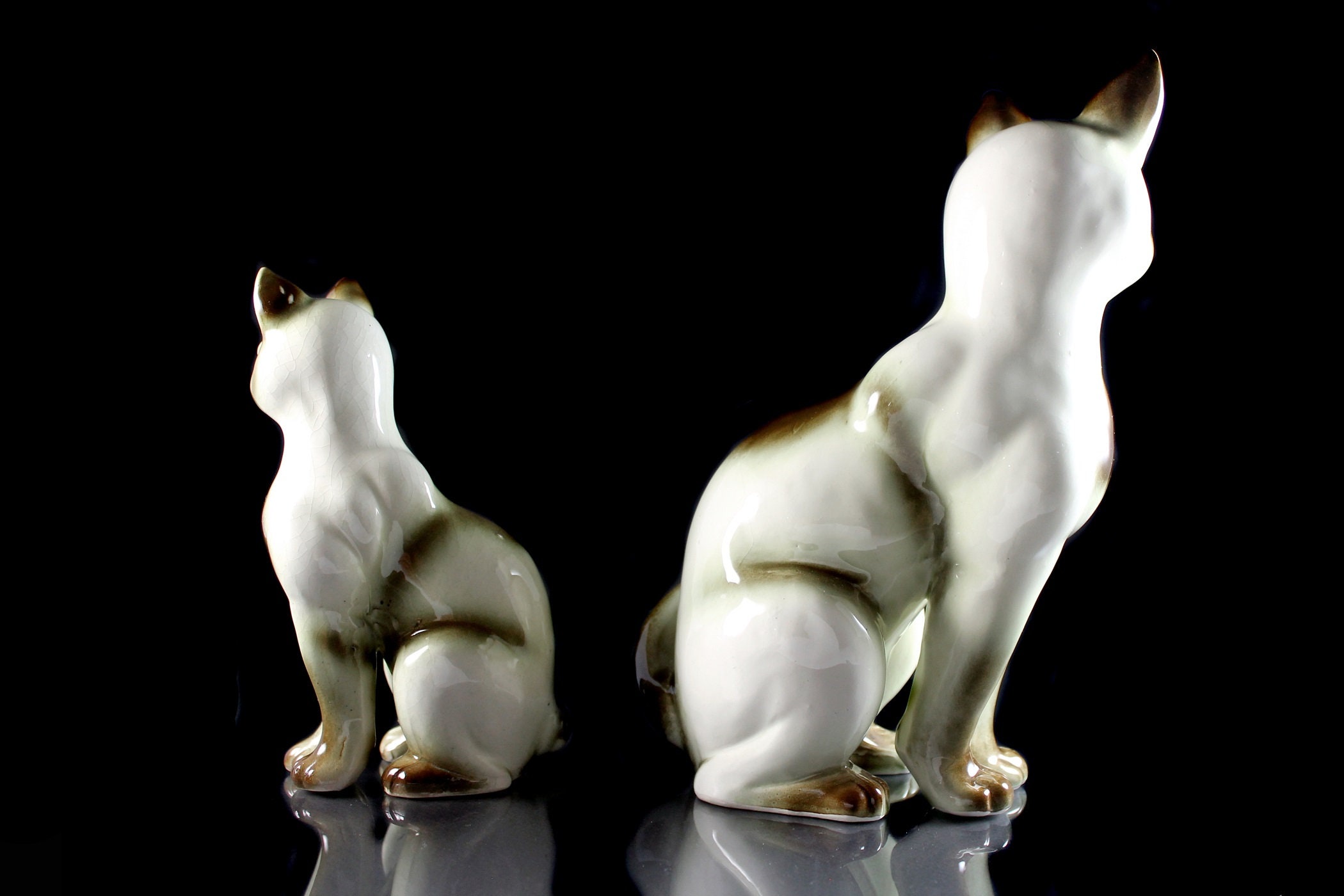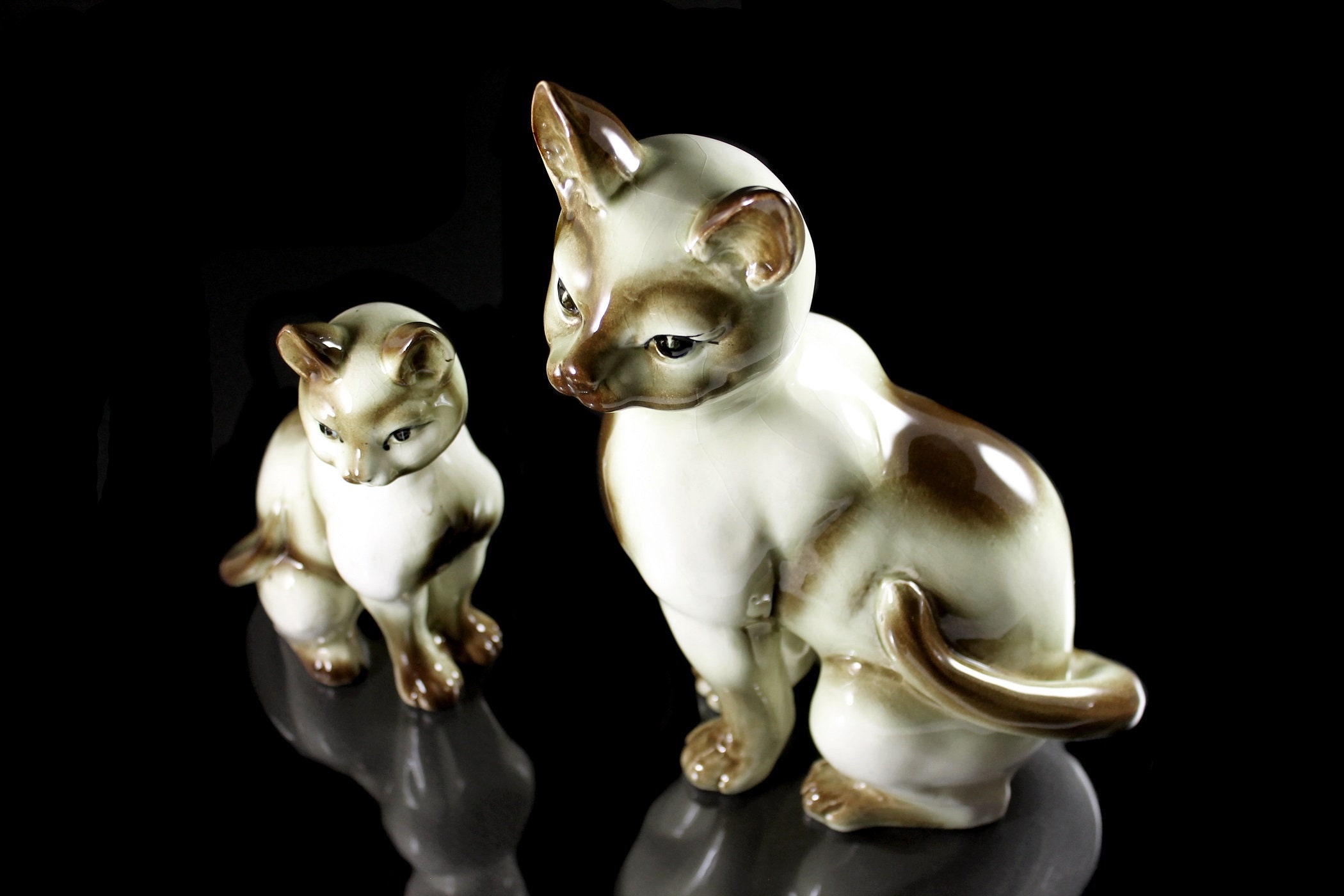 Siamese Cat Figurines, Porcelain, Set of Two, Large and Small, Cat and Kitten Statues, Hand Painted, Made in Japan