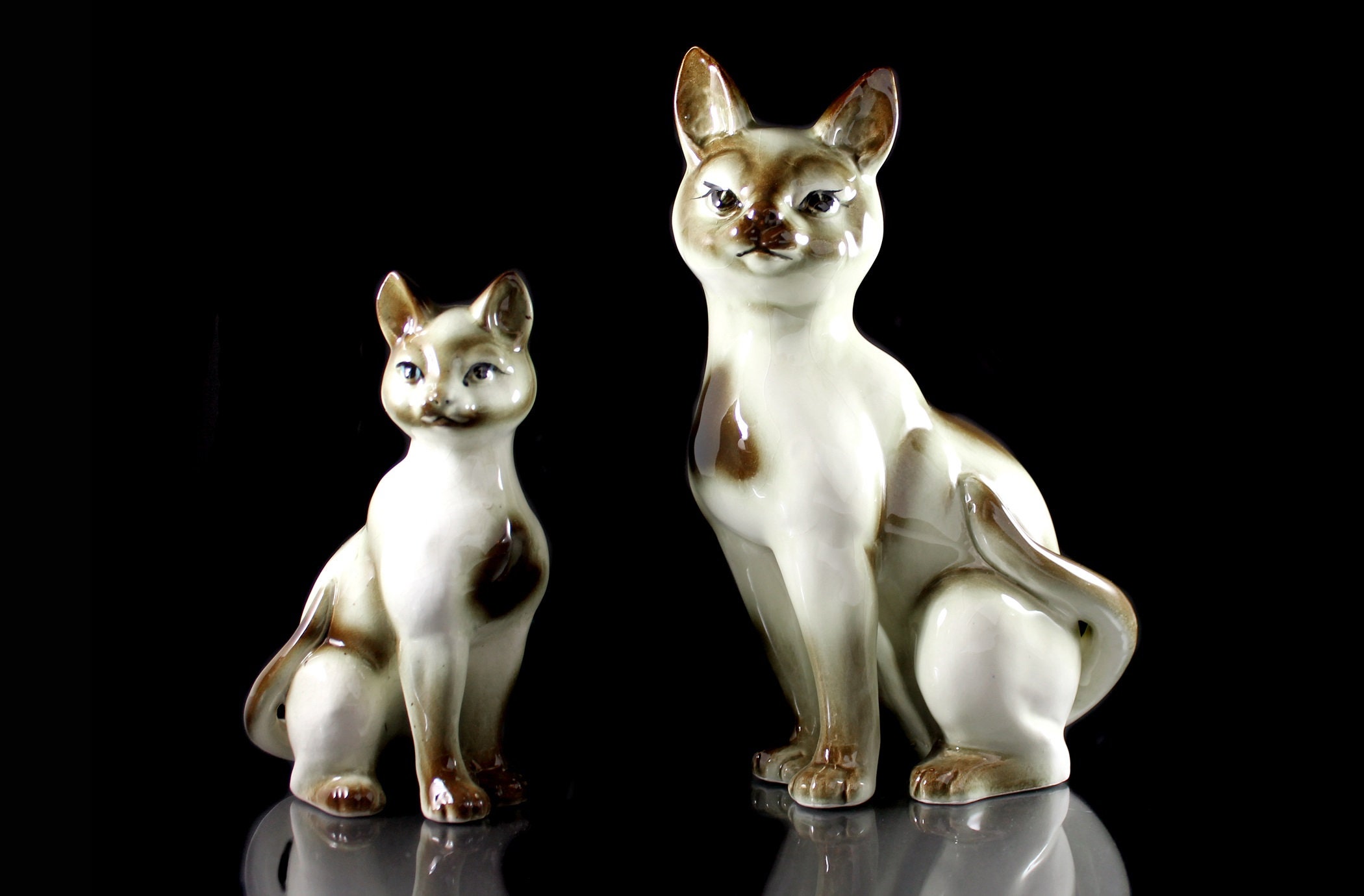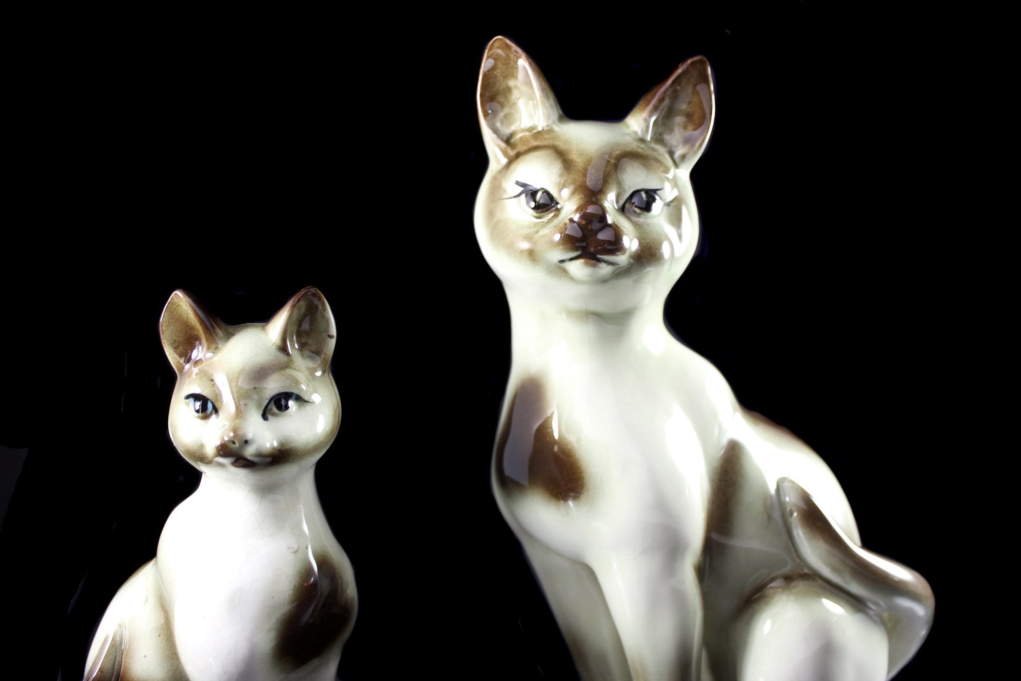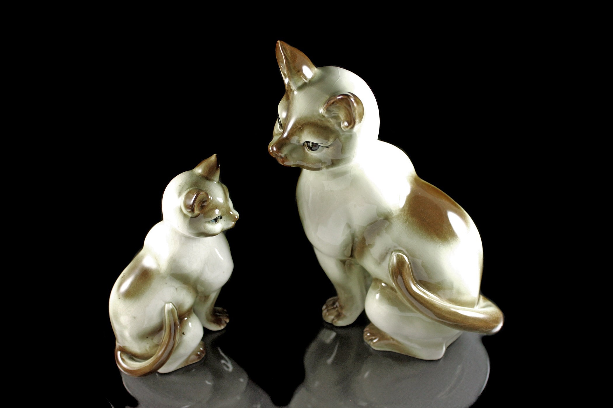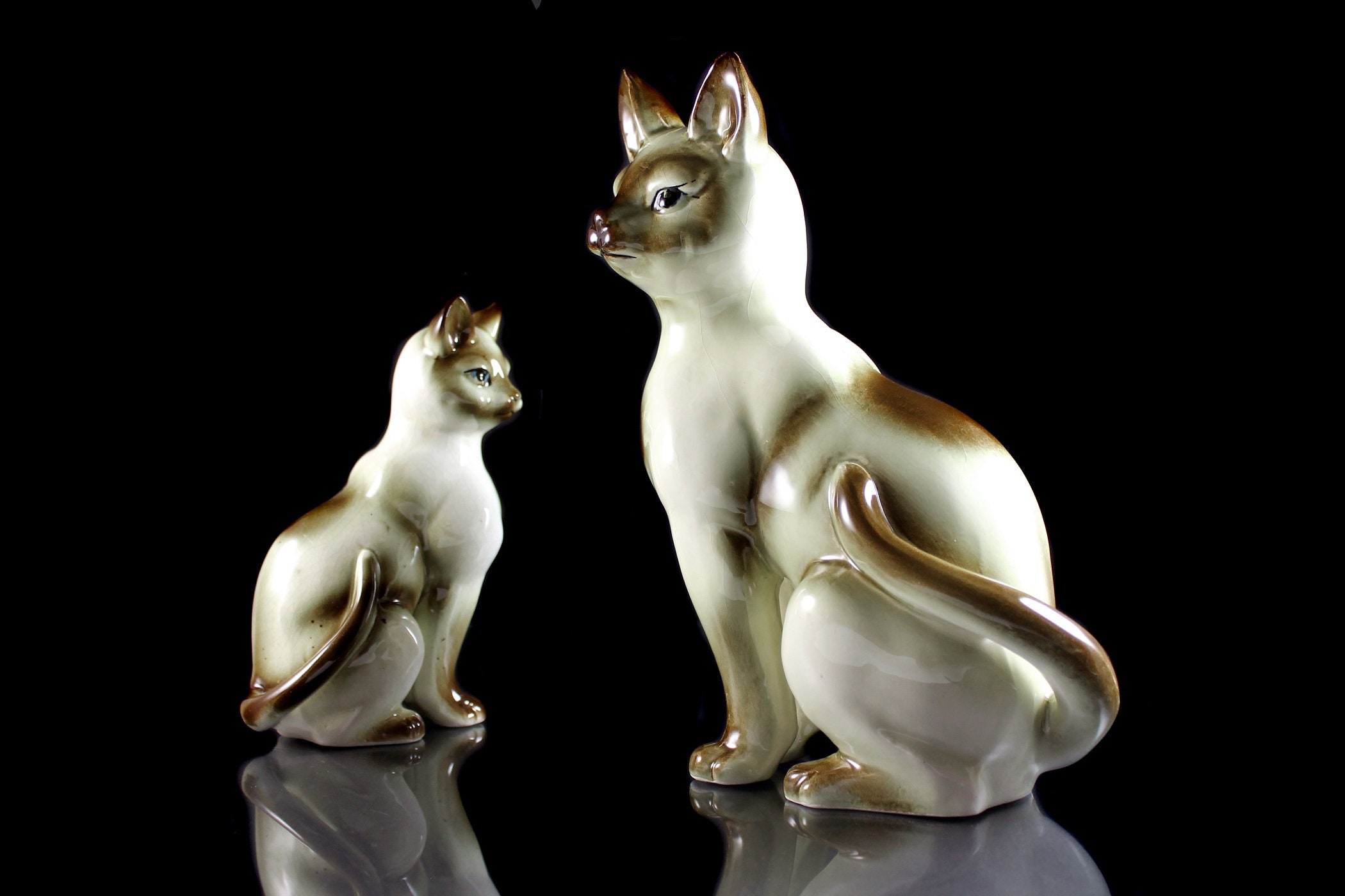 Siamese Cat Figurines, Porcelain, Set of Two, Large and Small, Cat and Kitten Statues, Hand Painted, Made in Japan