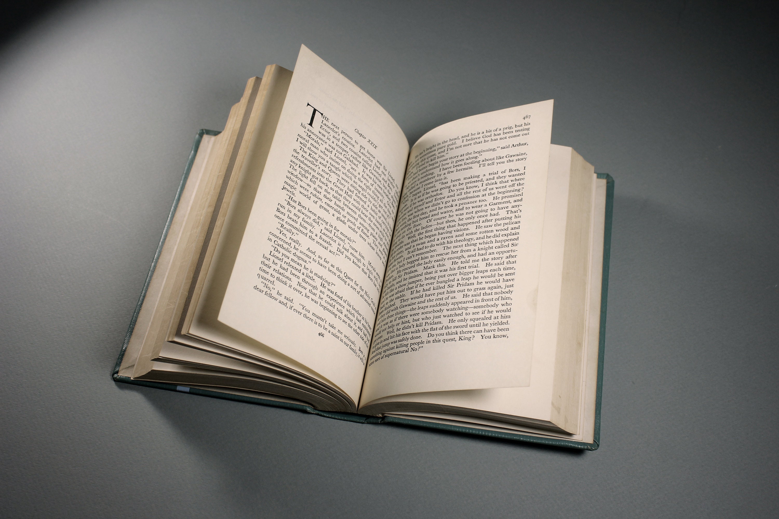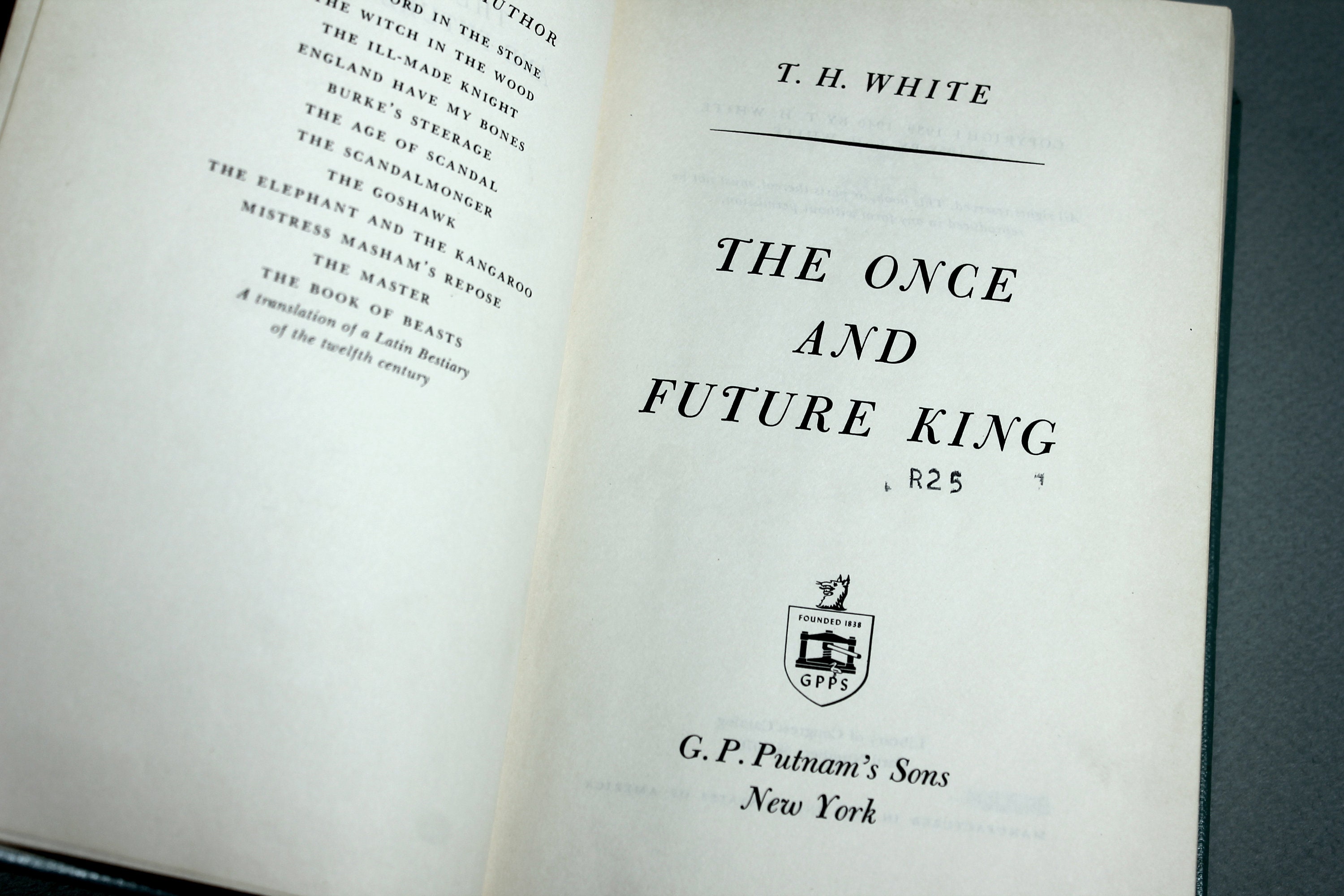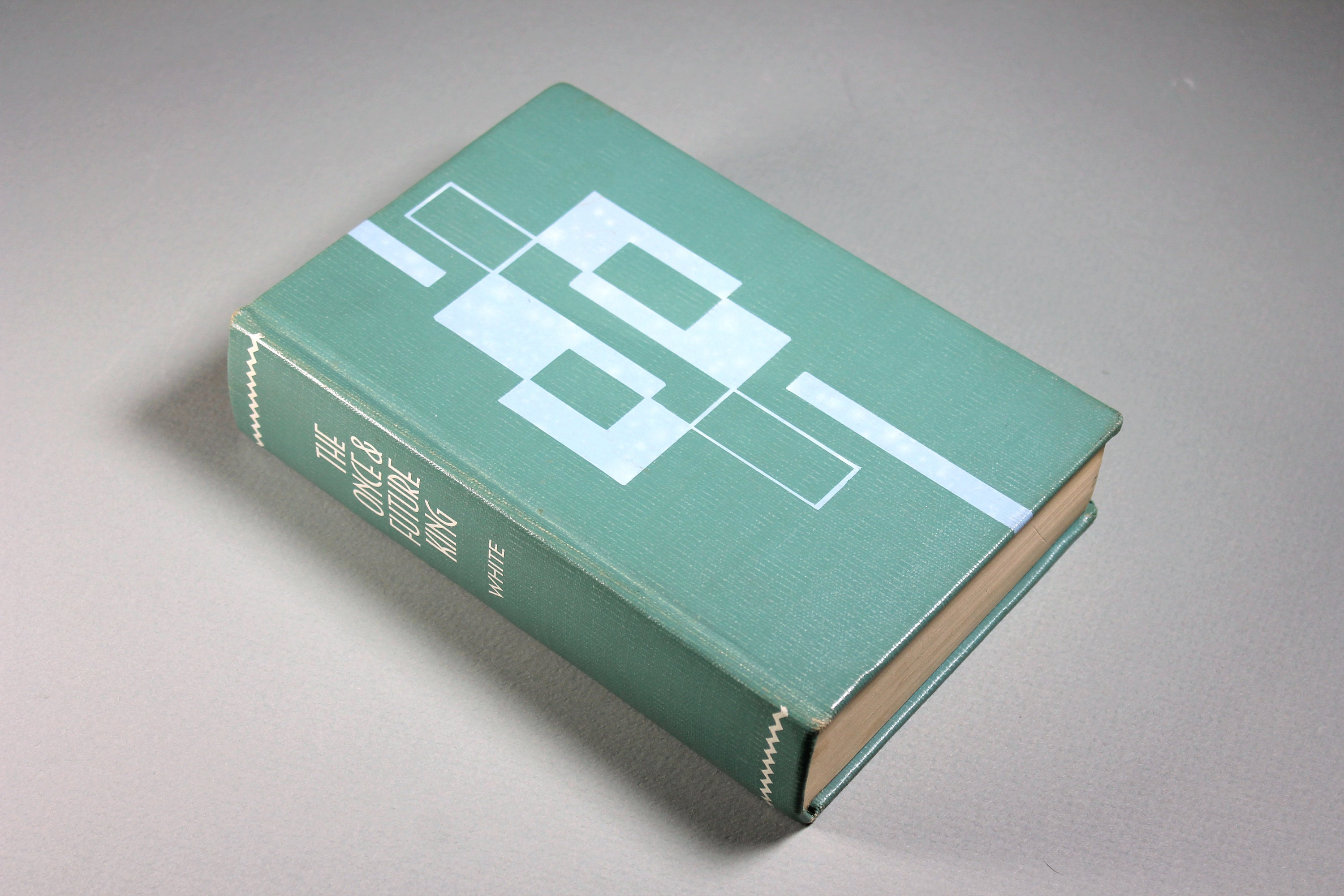 A hardcover fictional novel by T. H. White. It is entitled The Once and Future King. This is a 1958 First Edition. The book's hardcover is green cloth with a blue symbol on the front and title in white on the spine.