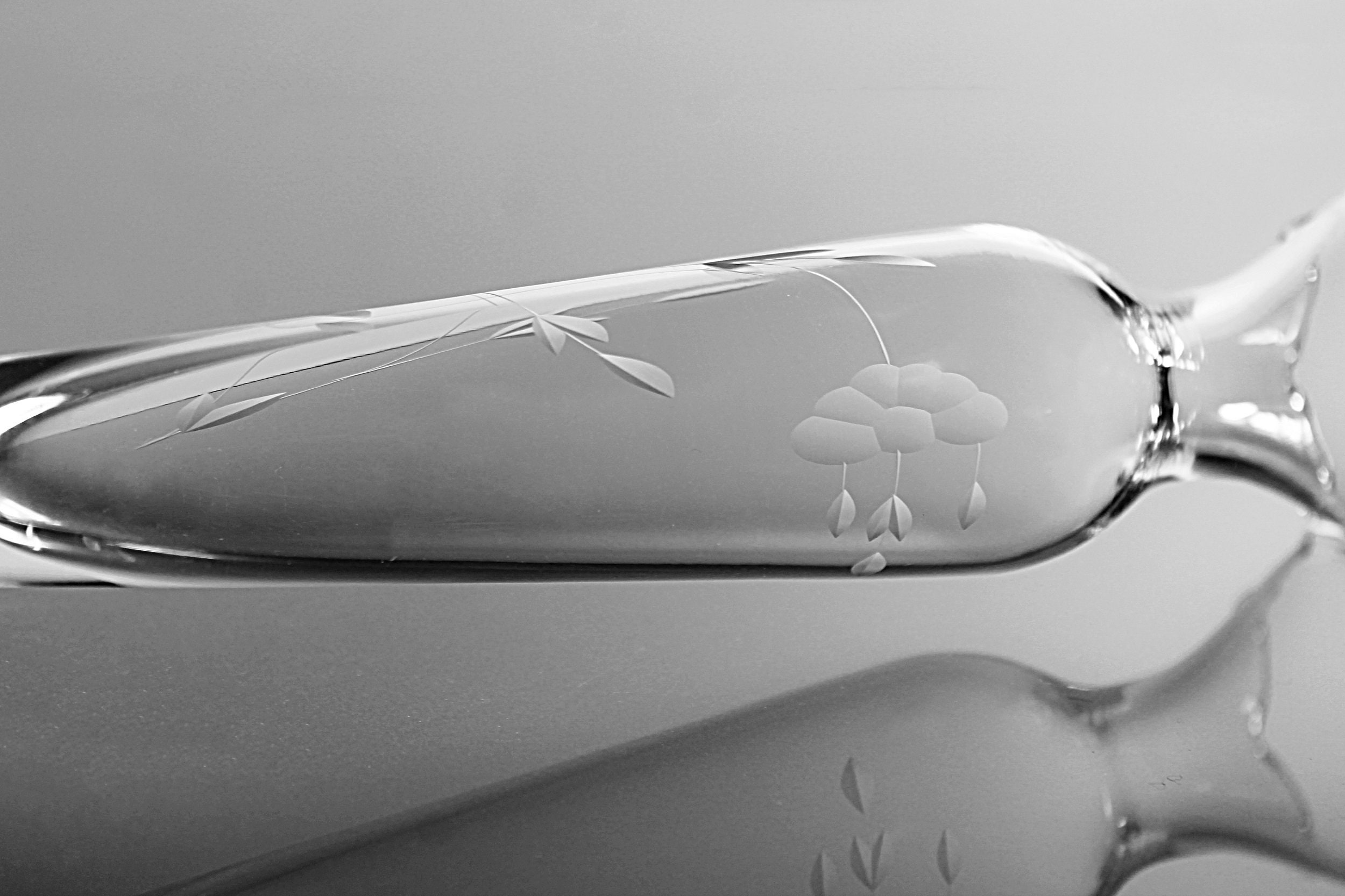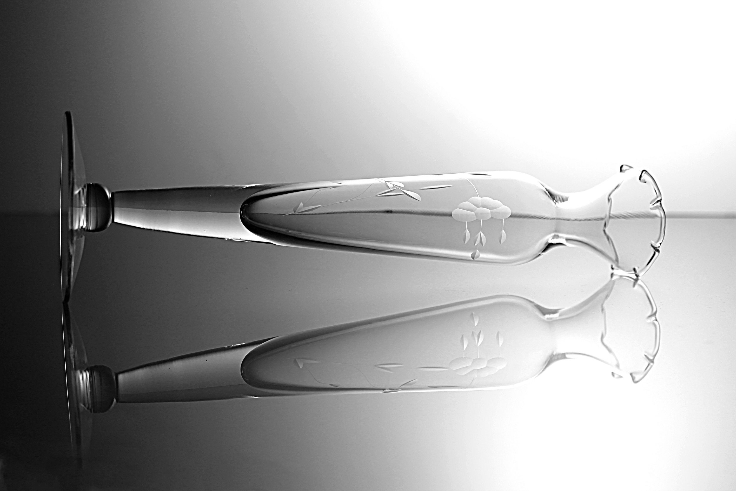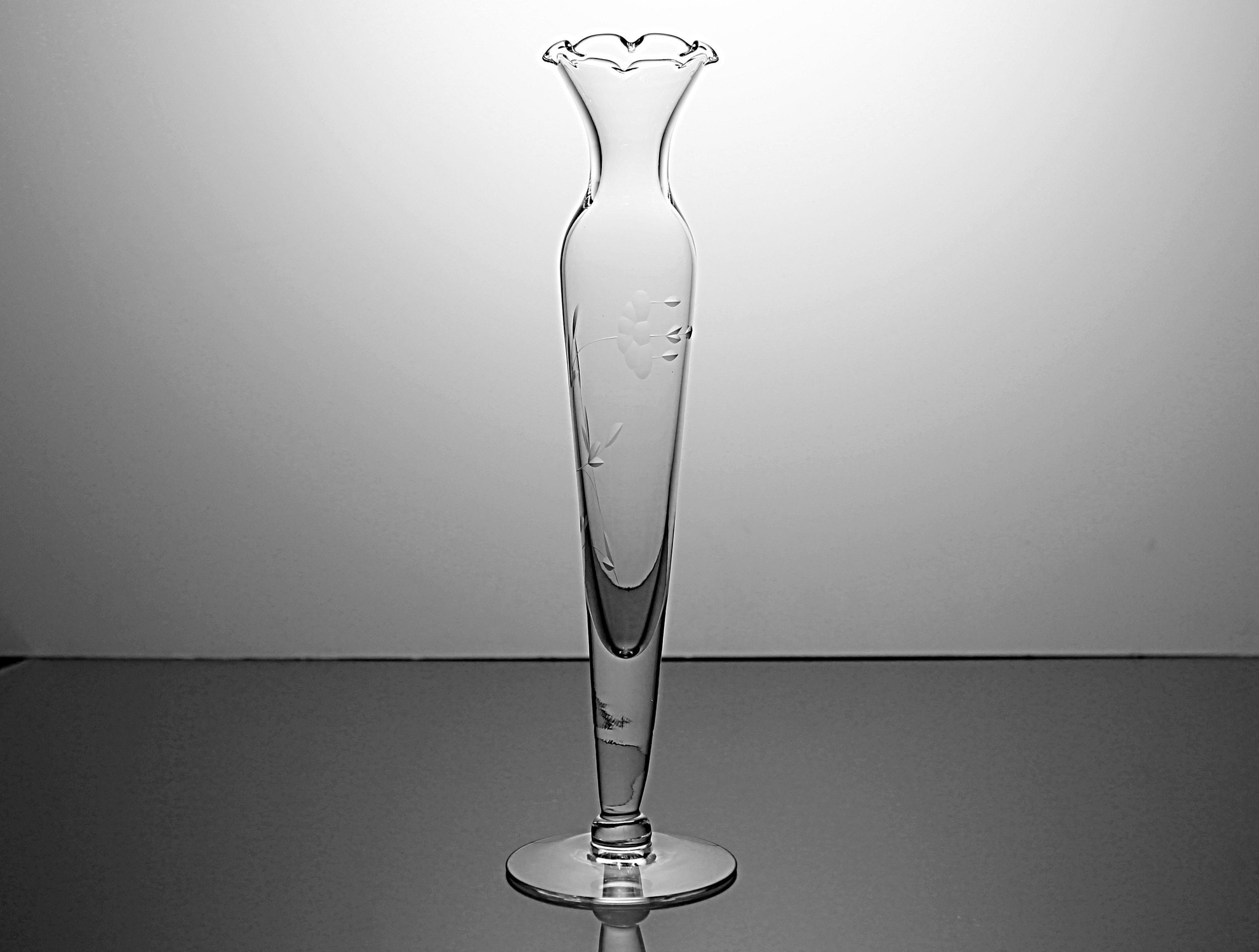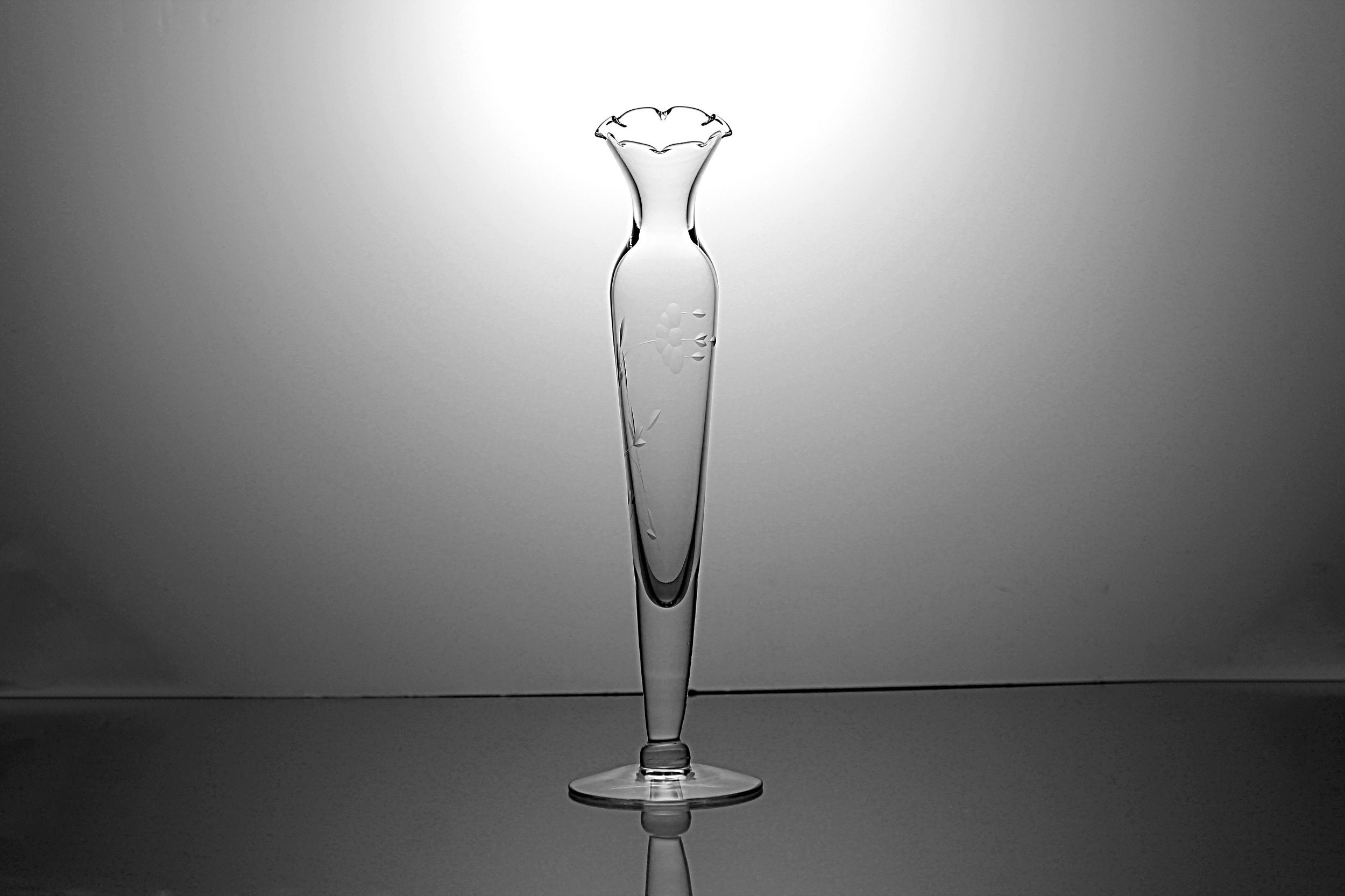 A lovely etched clear glass bud vase. It has a pedestal foot and a fluted rim. The floral pattern wraps around the vase. A perfect bud vase for those treasures from your garden.