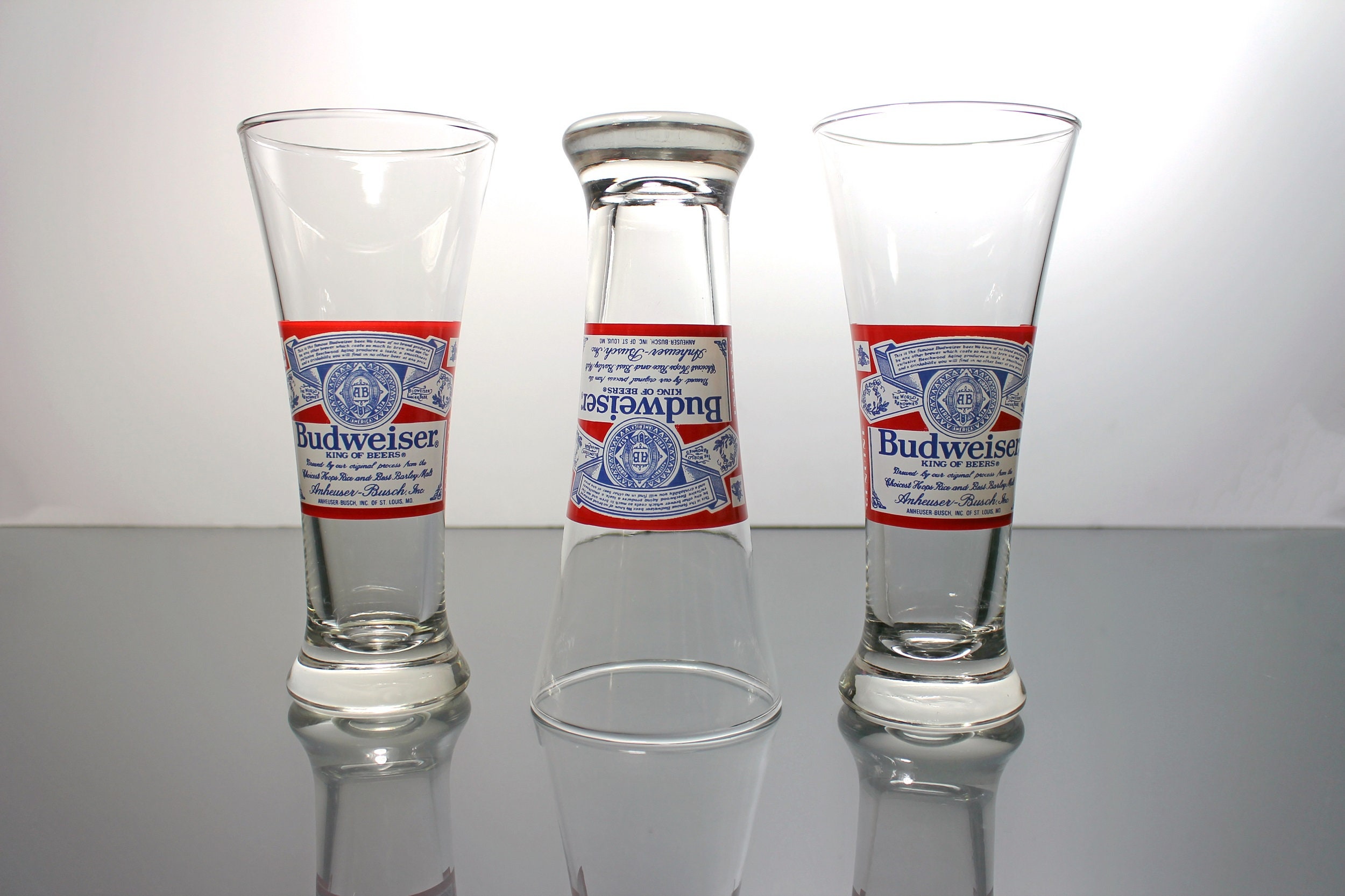 A fantastic set of three Budweiser pilsner glasses. These glasses feature the famous Budweiser label. They each hold 8 ounces. This would make a wonderful gift idea and a great find for the collector. A perfect addition to a man cave or home bar.