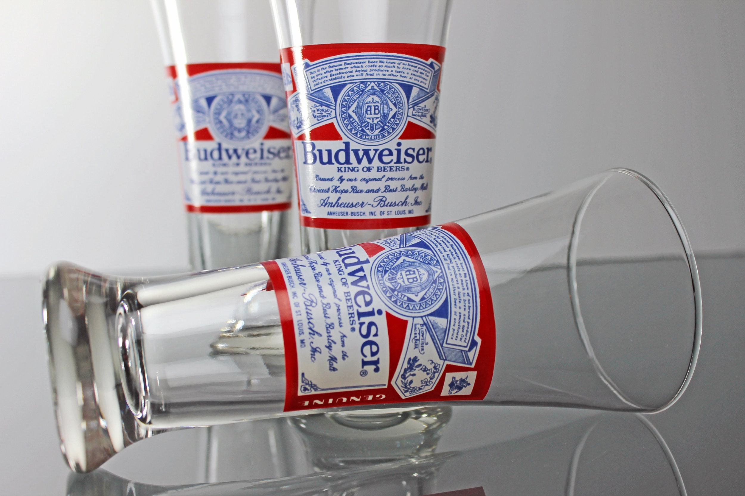 Budweiser Pilsner Glasses, Budweiser Label, 8 Ounce, Collectible, Anheuser-Busch, Barware, Beer Glass, Set of 3