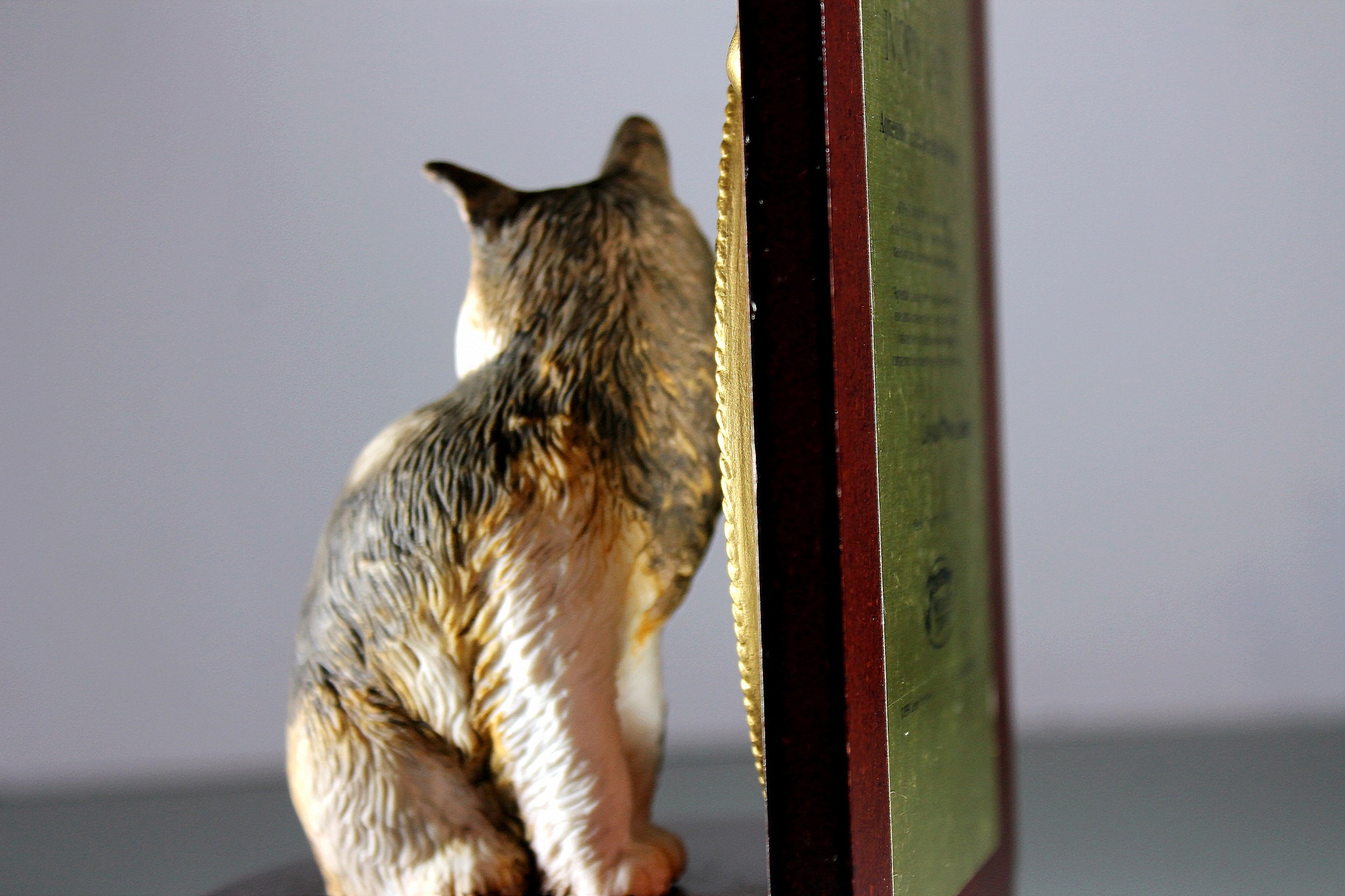 A gorgeous and charming music box by the San Francisco Music Box Co. It is 'Agneatha with her Red Paisley' which is first in the series of Ivory Cats based on the portraits by artist Lesley Anne Ivory. The cat is a long-haired tortoise-shell sitting in front of an oval mirror surrounded by red paisley wallpaper. This would be a great gift idea for a cat lover.