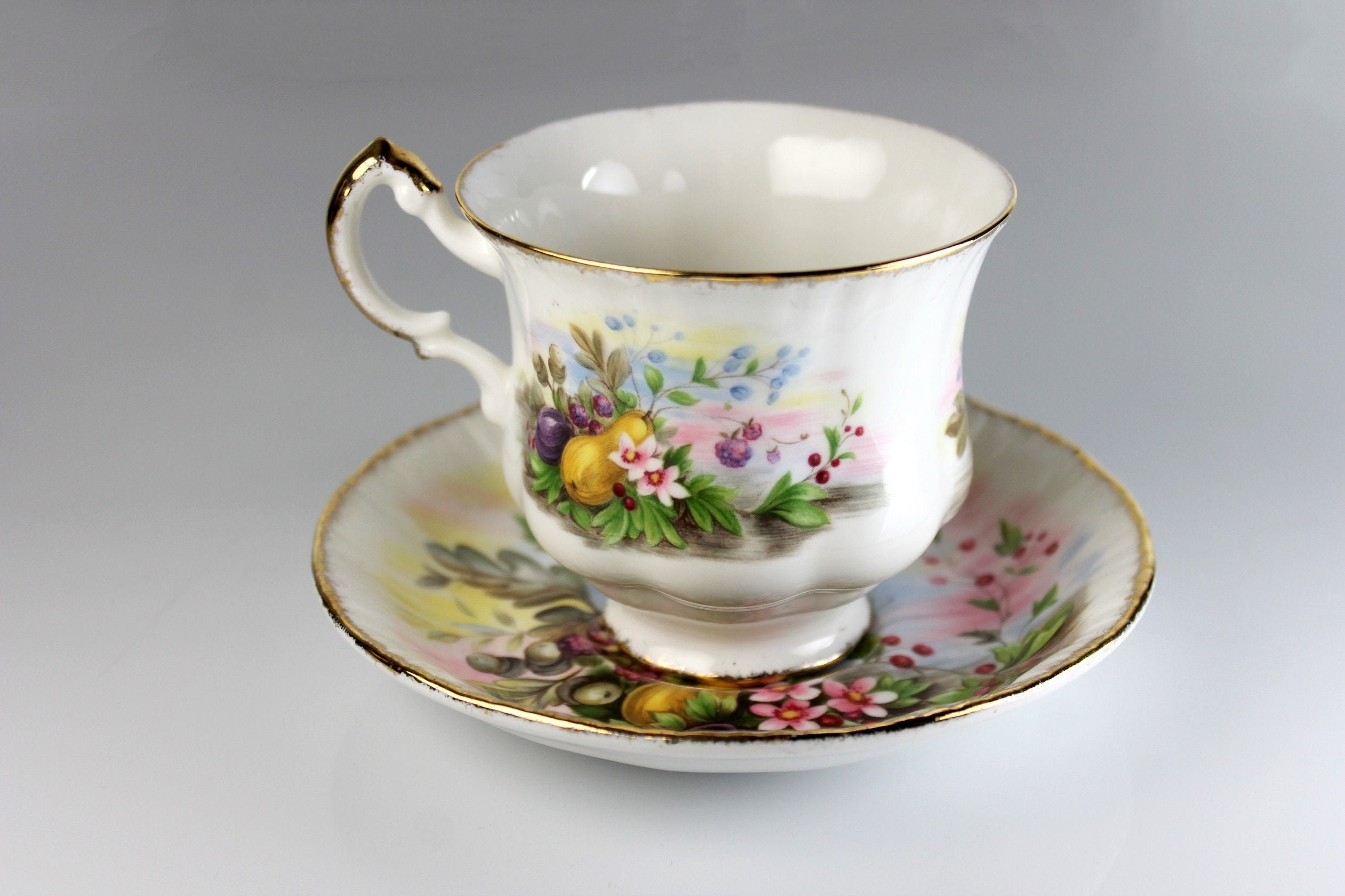 A gorgeous footed teacup and saucer by Paragon China. The pattern consists of various fruits and it is part of their Marlborough Series. The cup and saucer are made from fine bone china and the mark on the back says "By Appointment To Her Majesty The Queen". A great cup for having an afternoon tea on the porch, veranda, or patio in the summer or by the window or fireside in the winter. This would be a perfect gift for a collector.