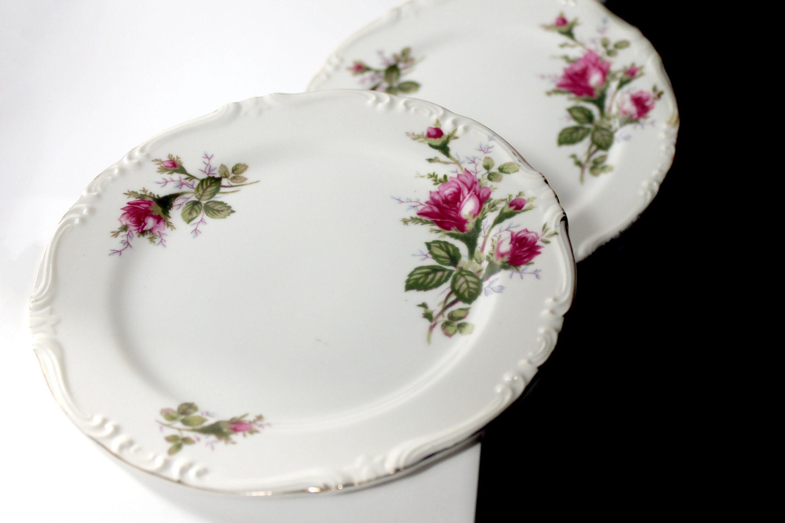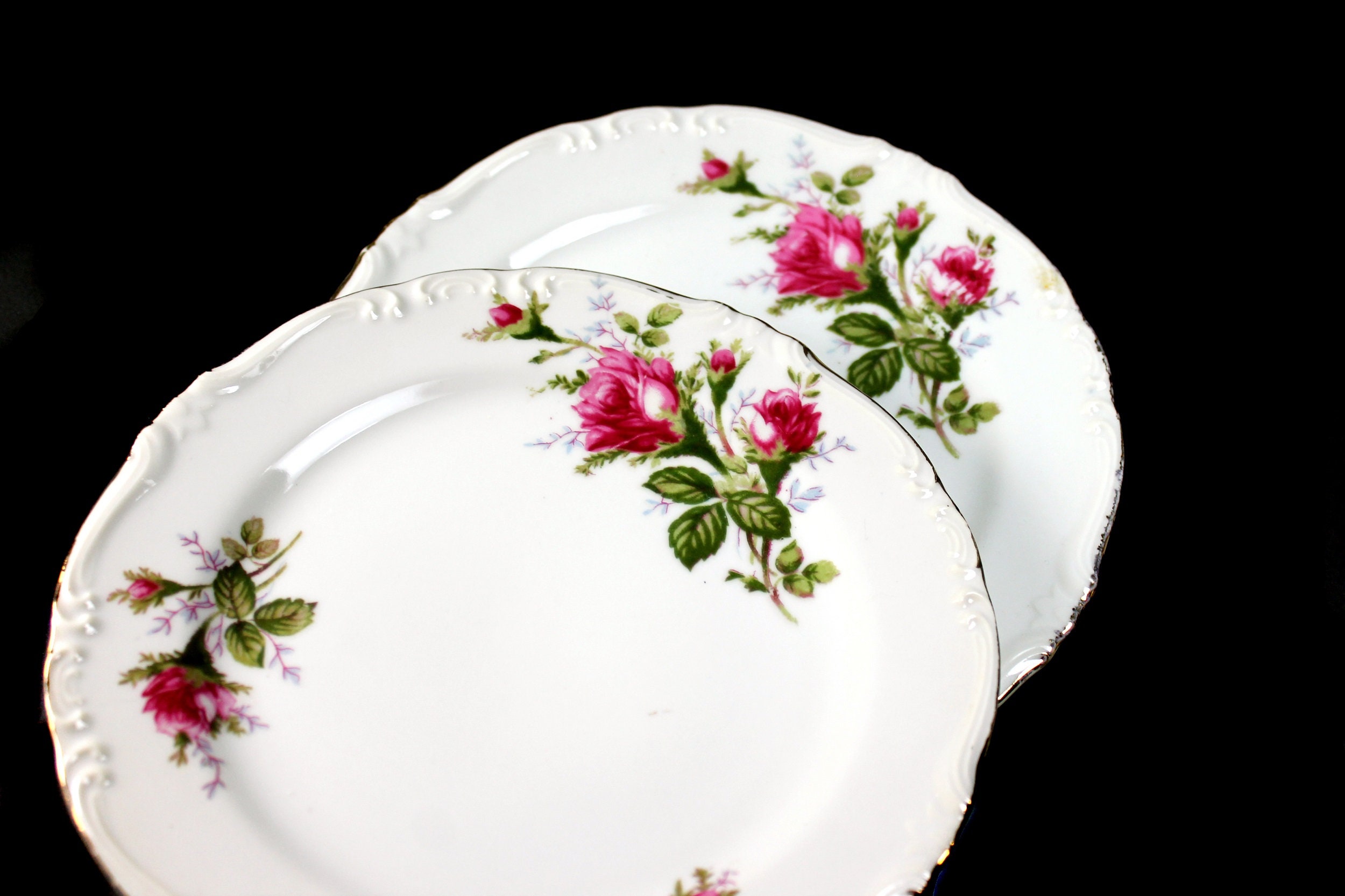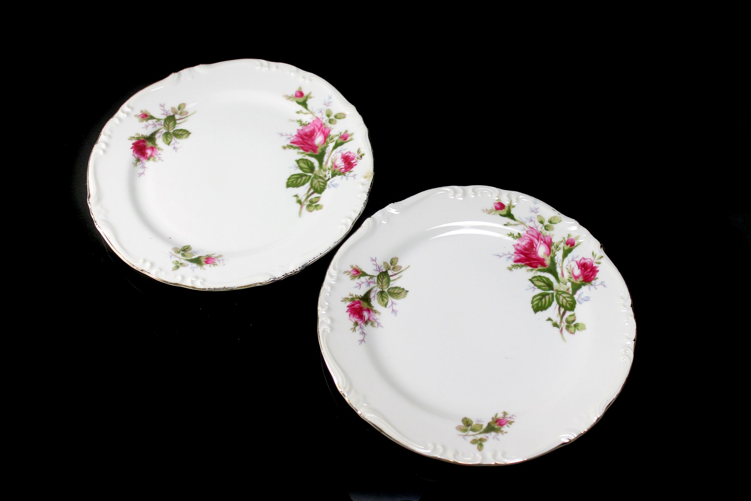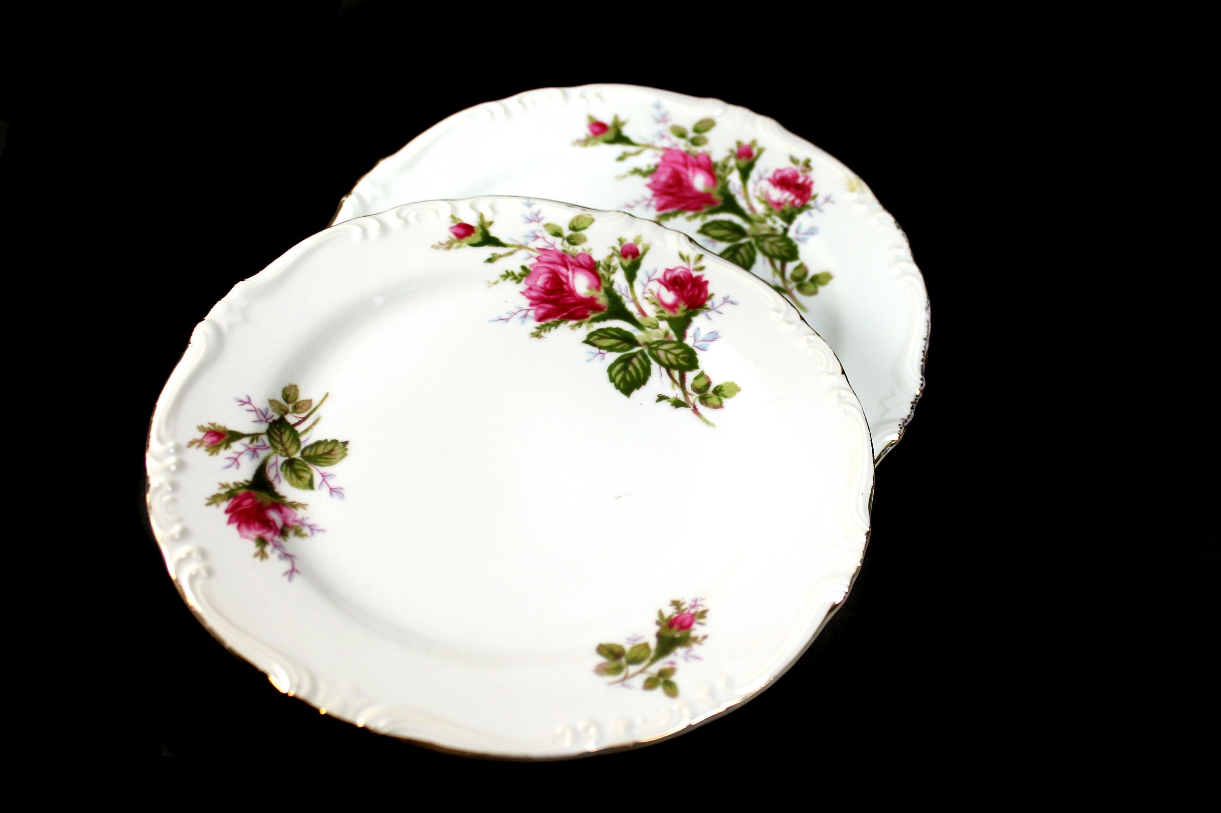 A lovely set of two salad plates by Royal Rose China Japan. There are roses (called Moss Roses) around the rim and the verge of the plates. The rim of the plates is embossed and outlined in gold. This is beautiful fine china. These plates are wonderful replacement pieces. Great start for a set.