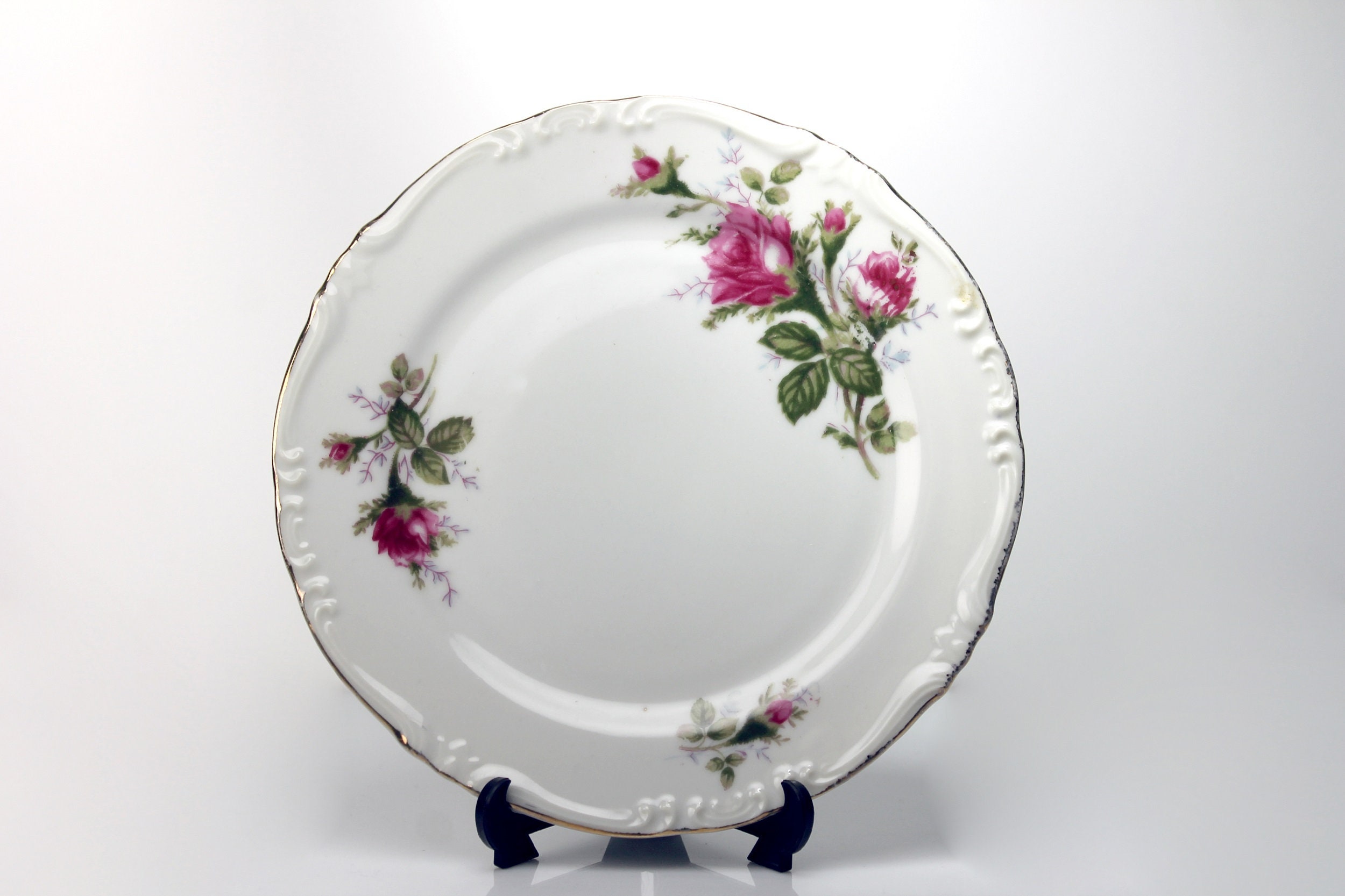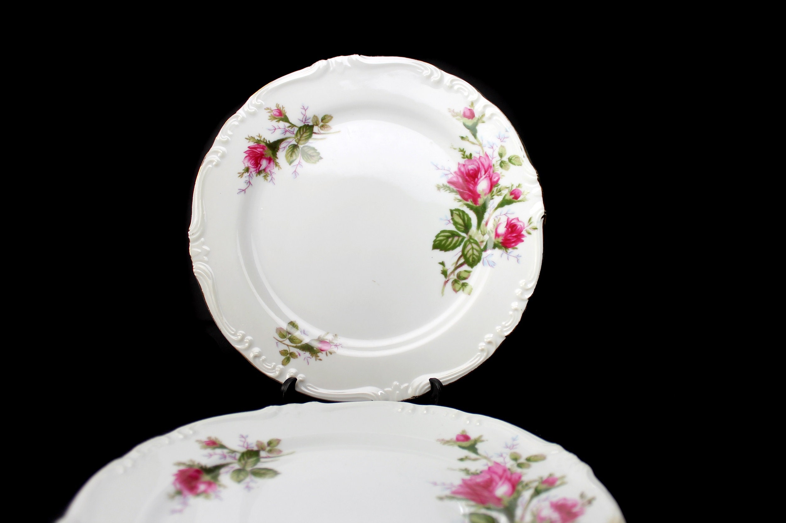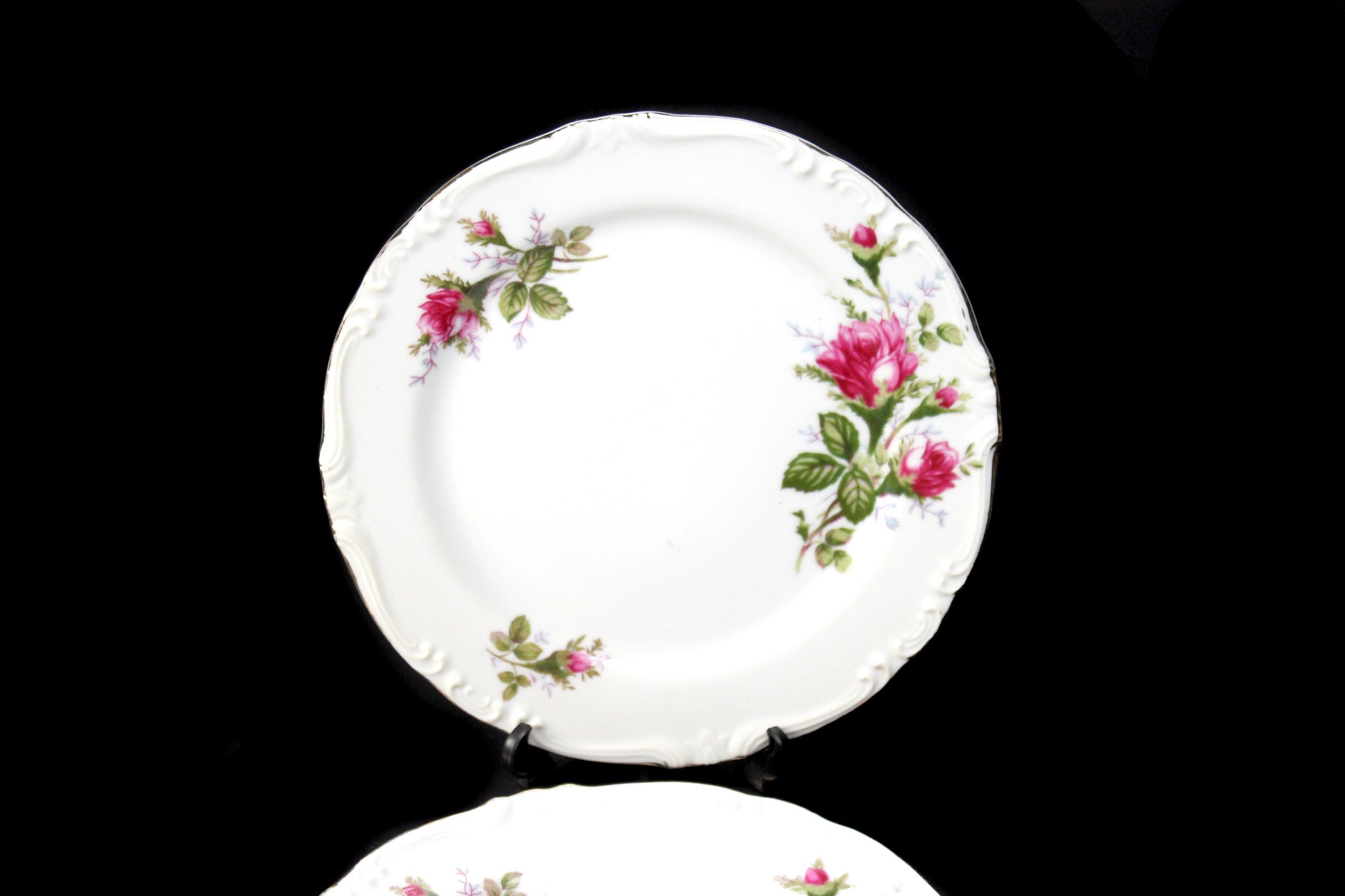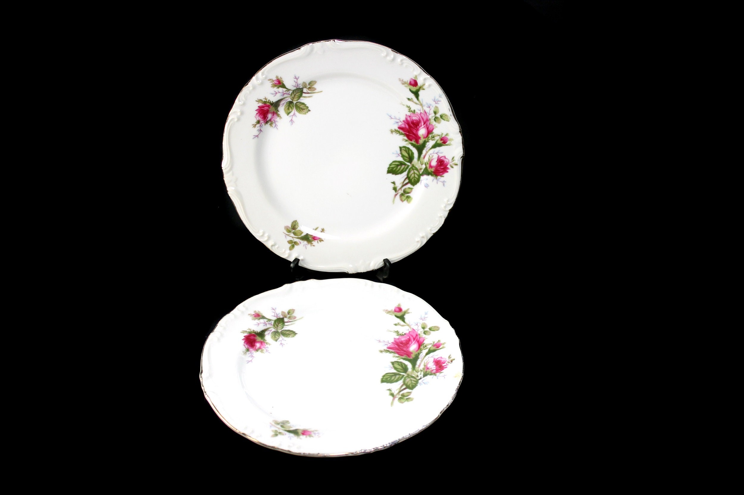 A lovely set of two salad plates by Royal Rose China Japan. There are roses (called Moss Roses) around the rim and the verge of the plates. The rim of the plates is embossed and outlined in gold. This is beautiful fine china. These plates are wonderful replacement pieces. Great start for a set.