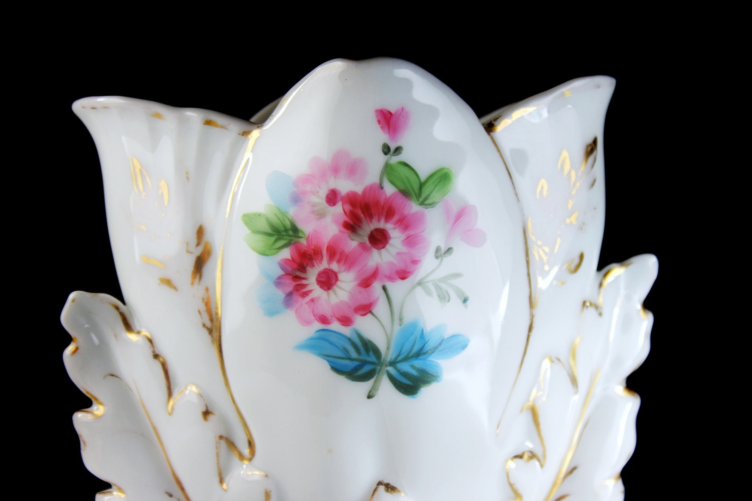 Porcelain Table Vase, Gold Trim, White, Centerpiece, Flower Vase, Pink Floral