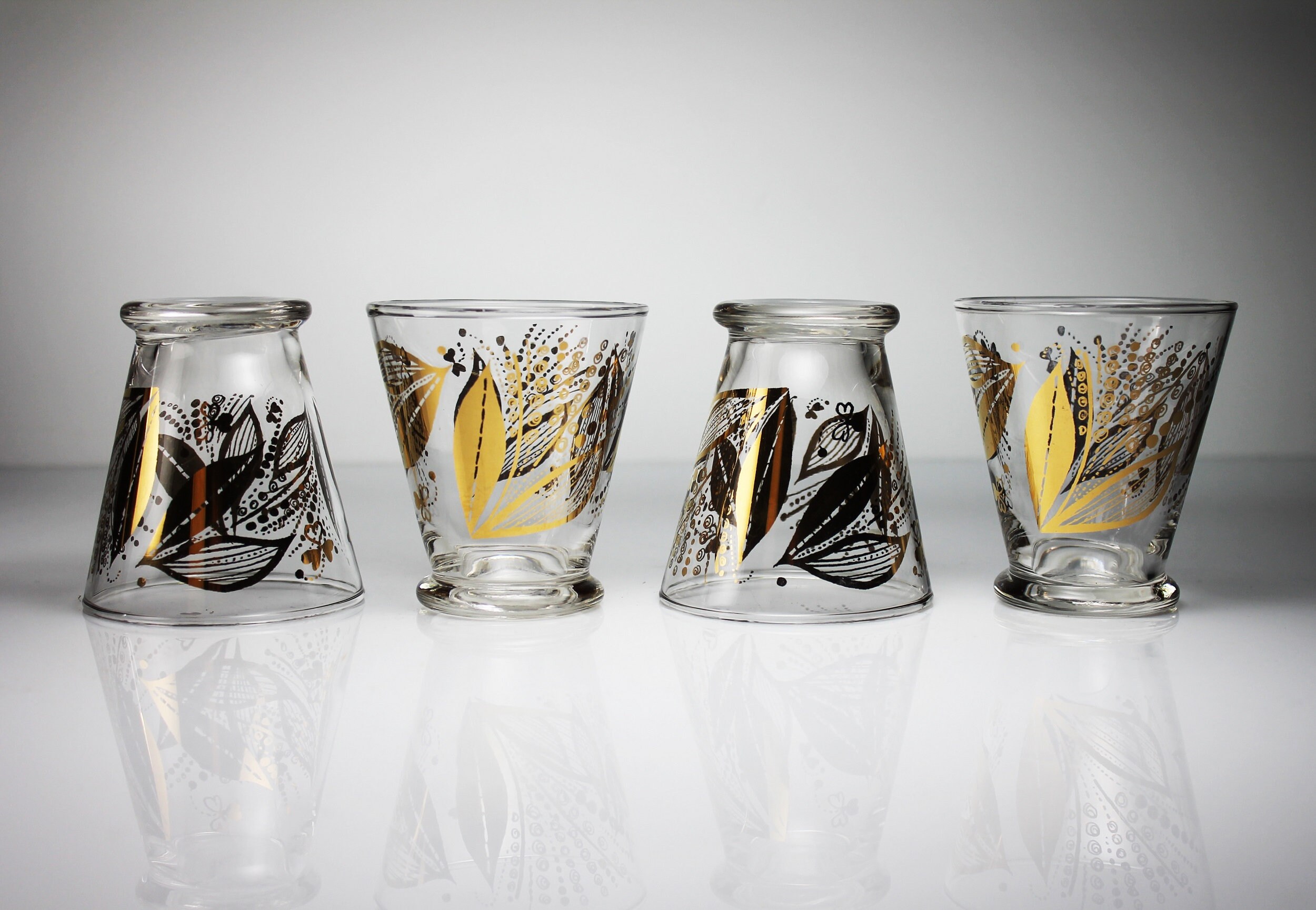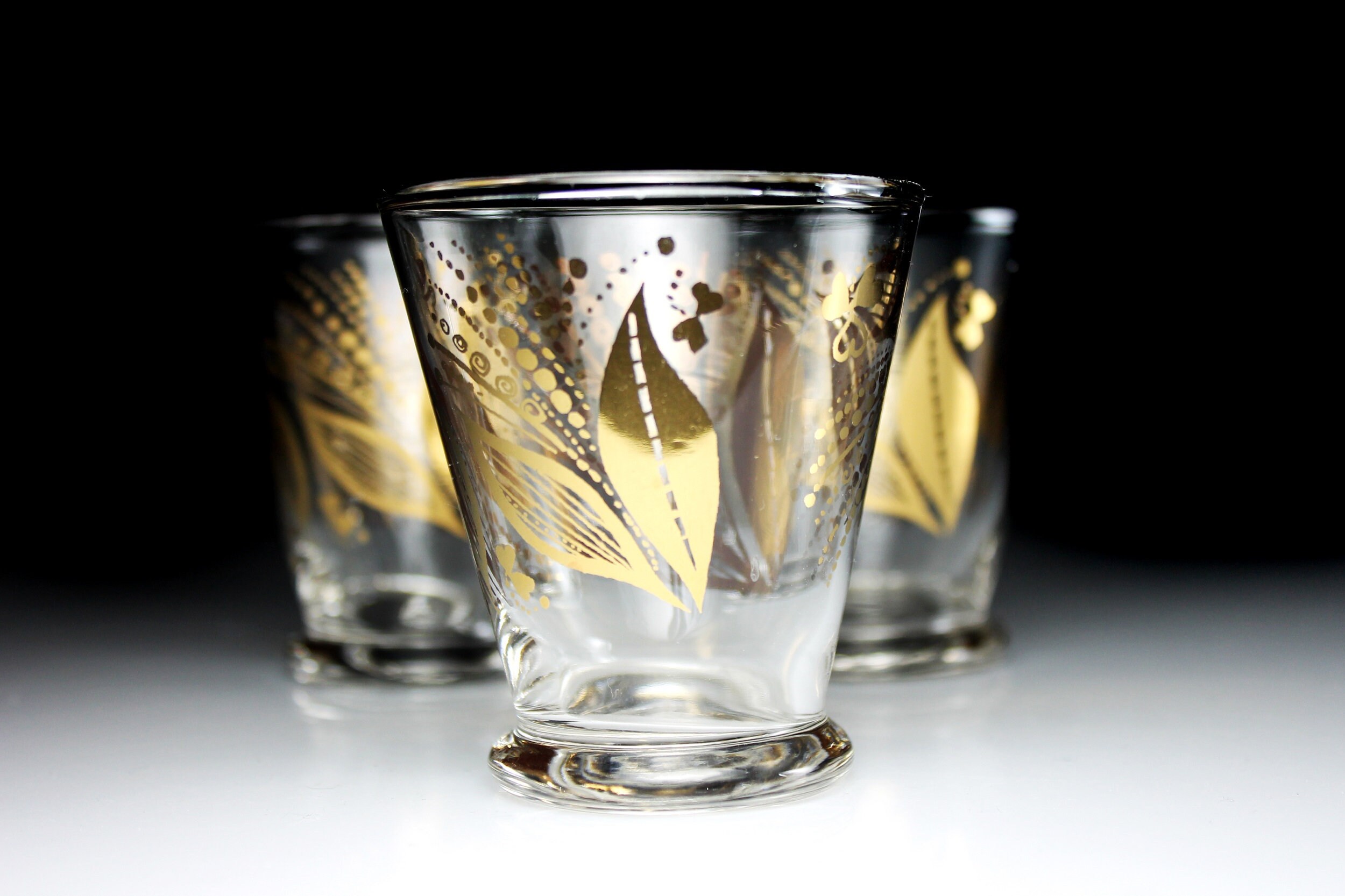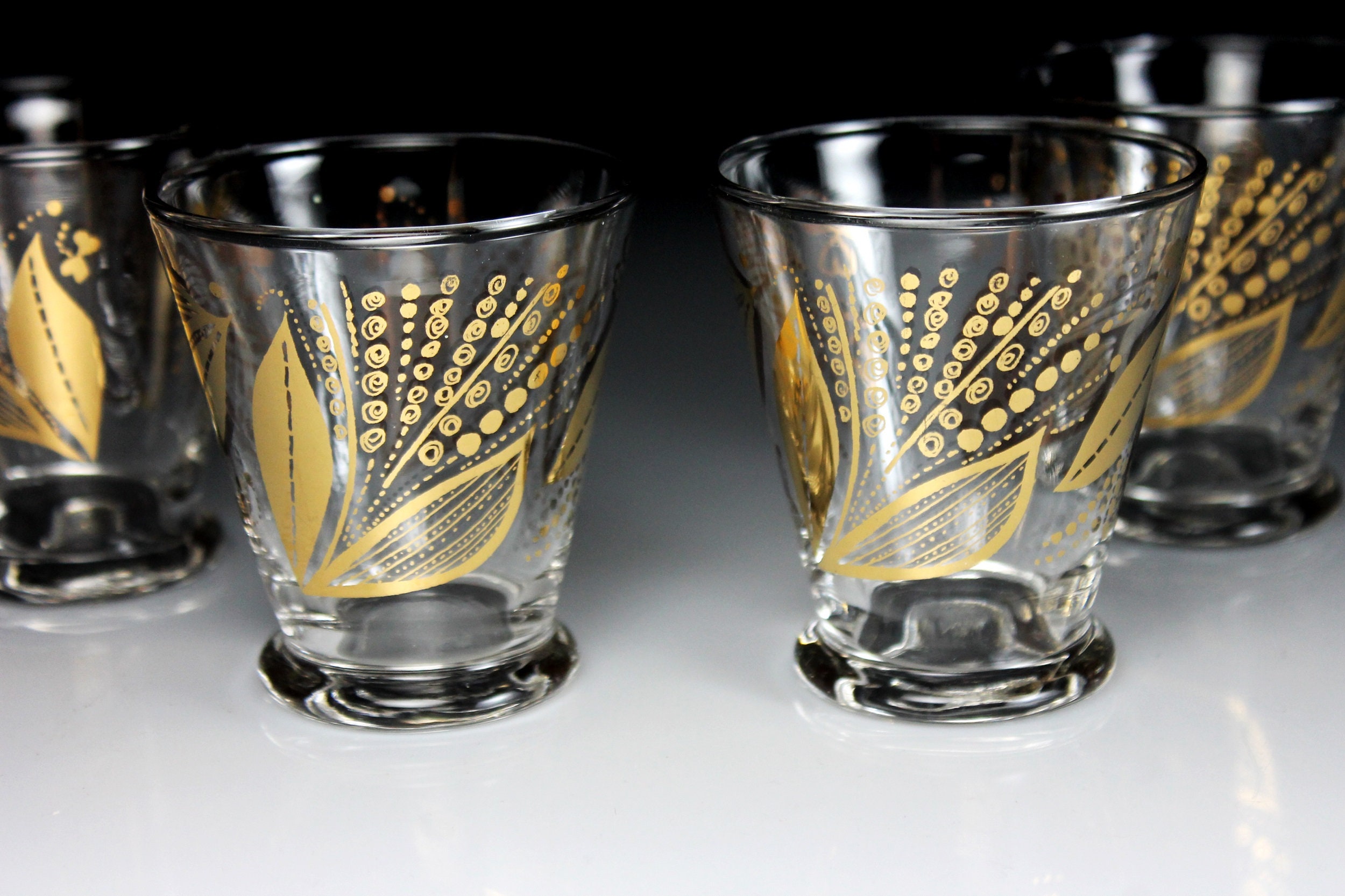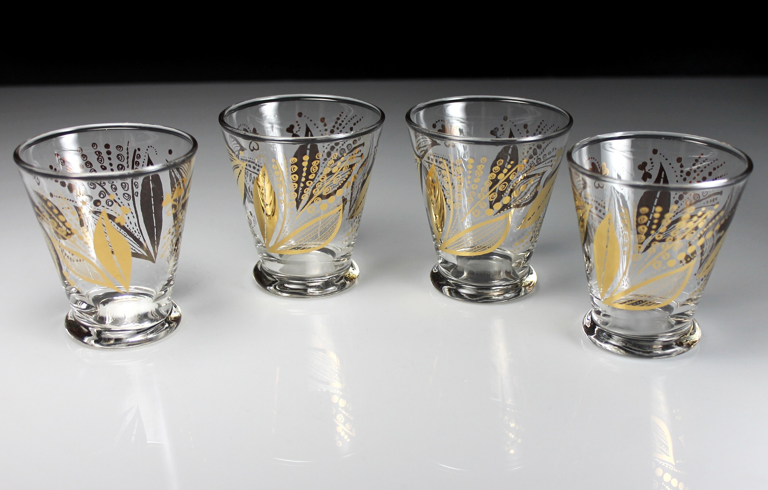A beautiful set of four juice glasses by Libbey. The pattern consists of a gold floral and leaf design. The glasses would be a great addition to a home bar, man cave, or morning breakfast.