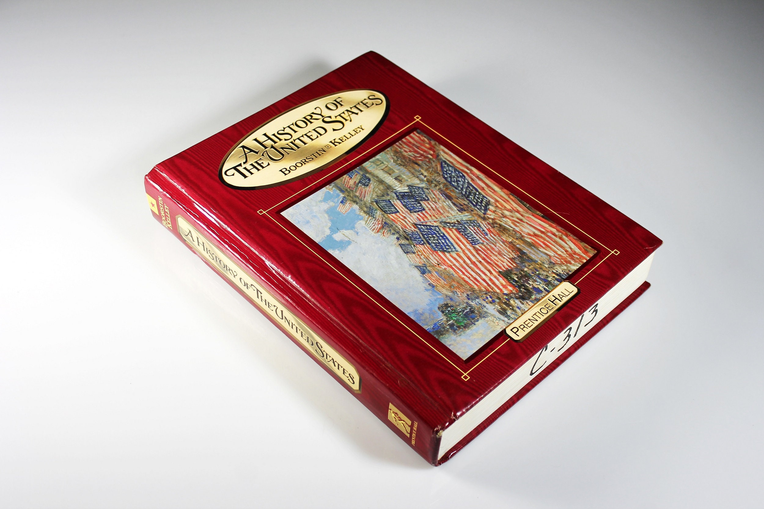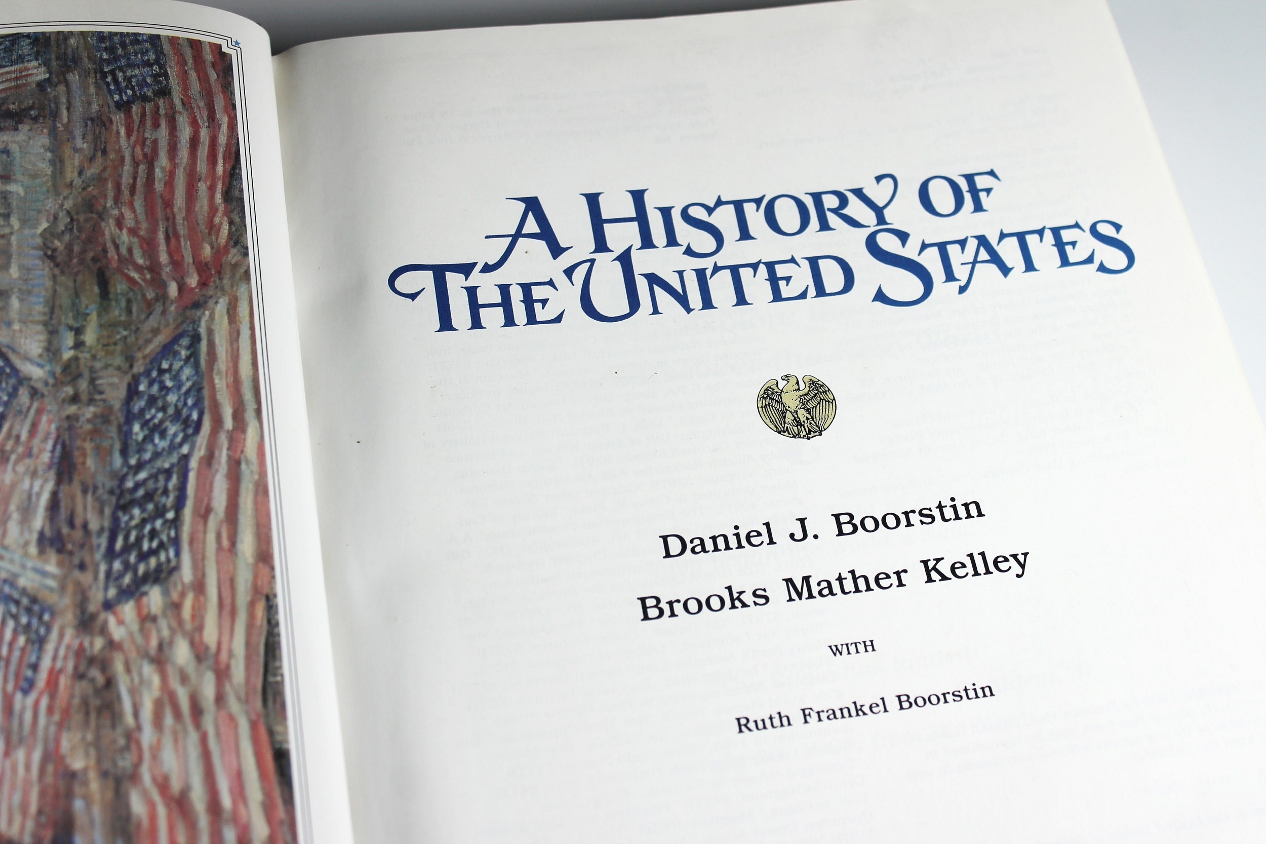 A hardcover text book entitled A history of the United States by Boorstin and Kelley. It presents a history of the United States from European exploration to the Presidency of Jimmy Carter.