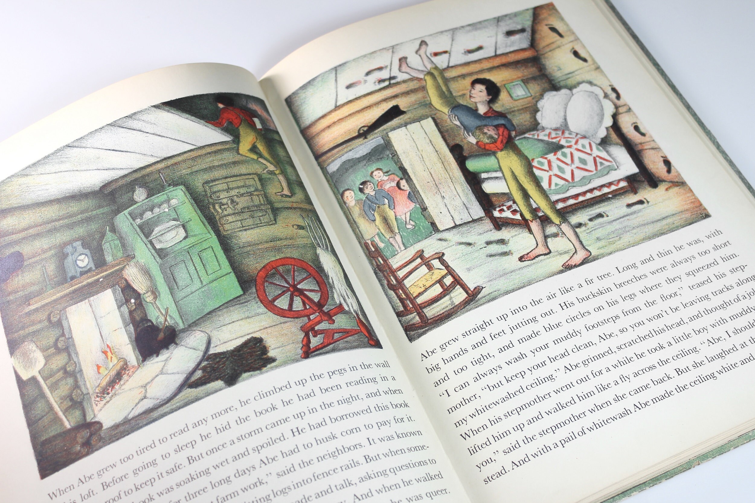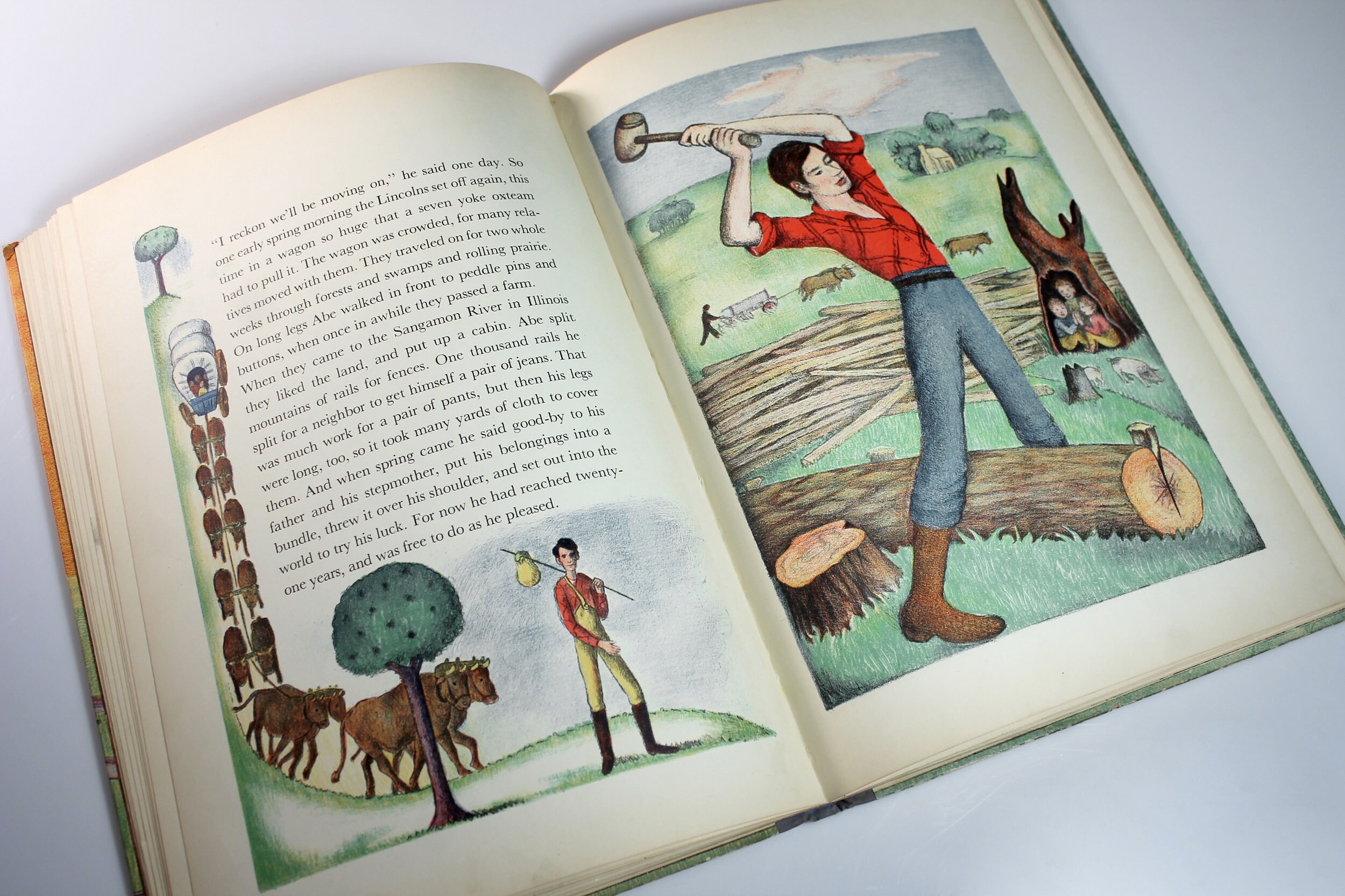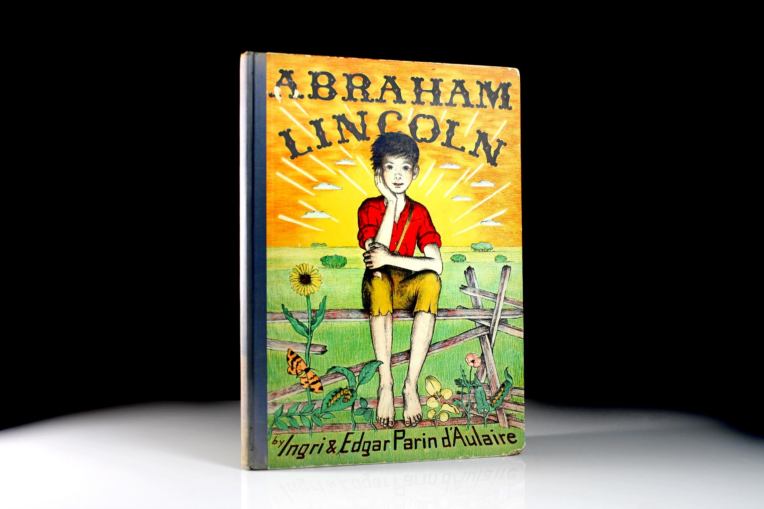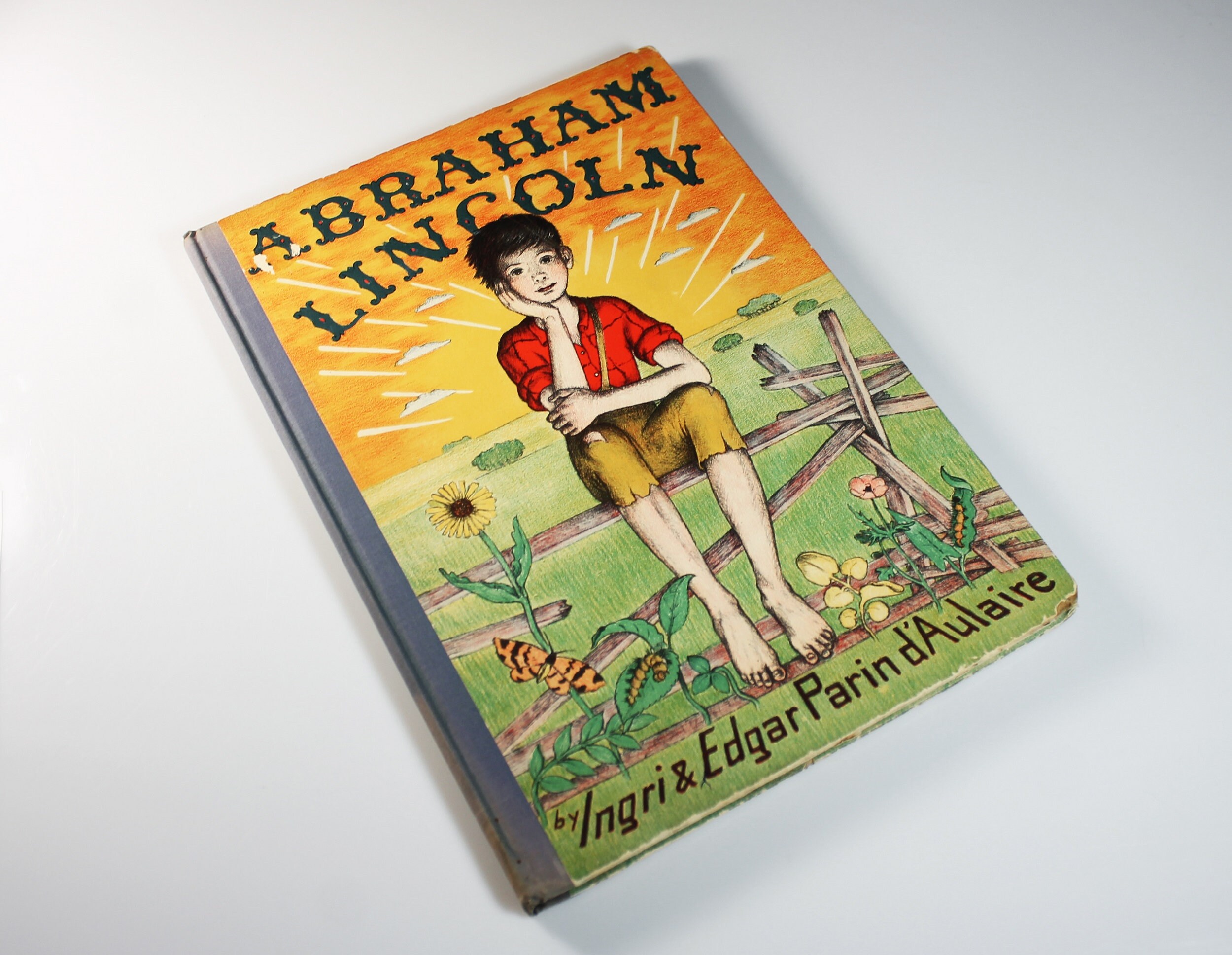 A wonderful children's hardcover book titled Abraham Lincoln by Ingri & Edgar Parin d'Aulaire. It was the recipient of the Caldecott Medal for illustration in 1940. This is a First Edition Second Printing. This copy has an erratum (an error in printing) glued in.