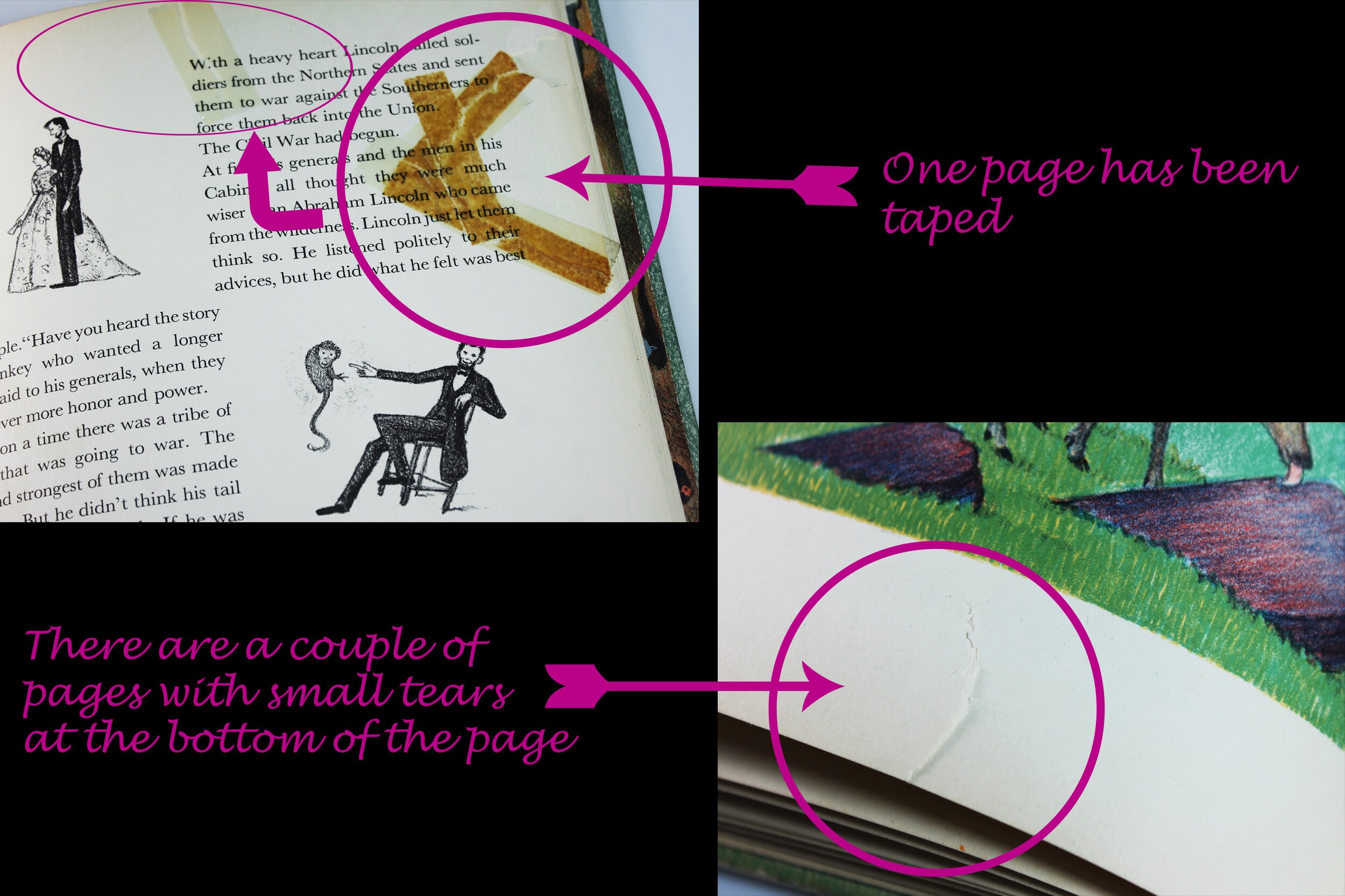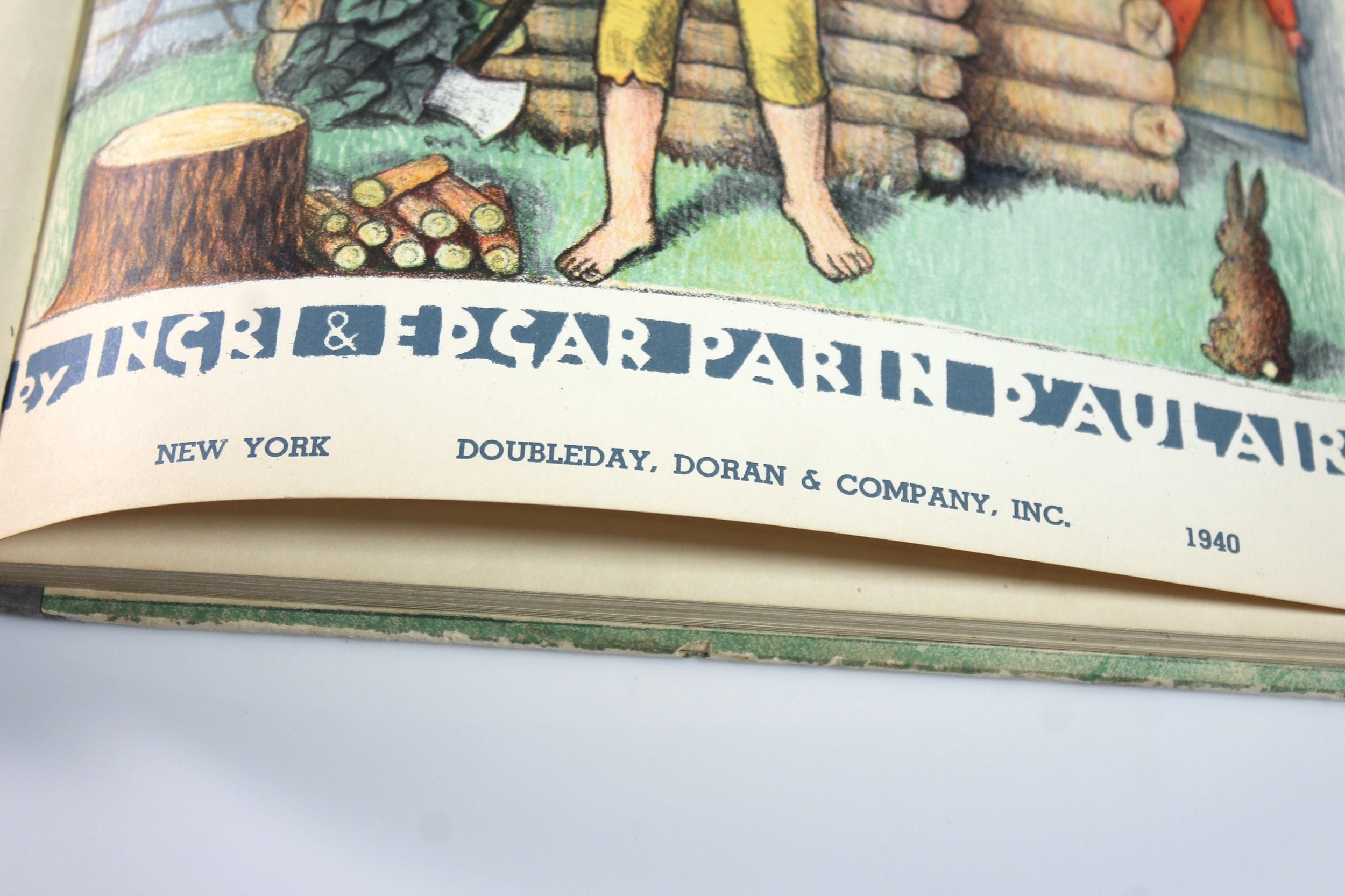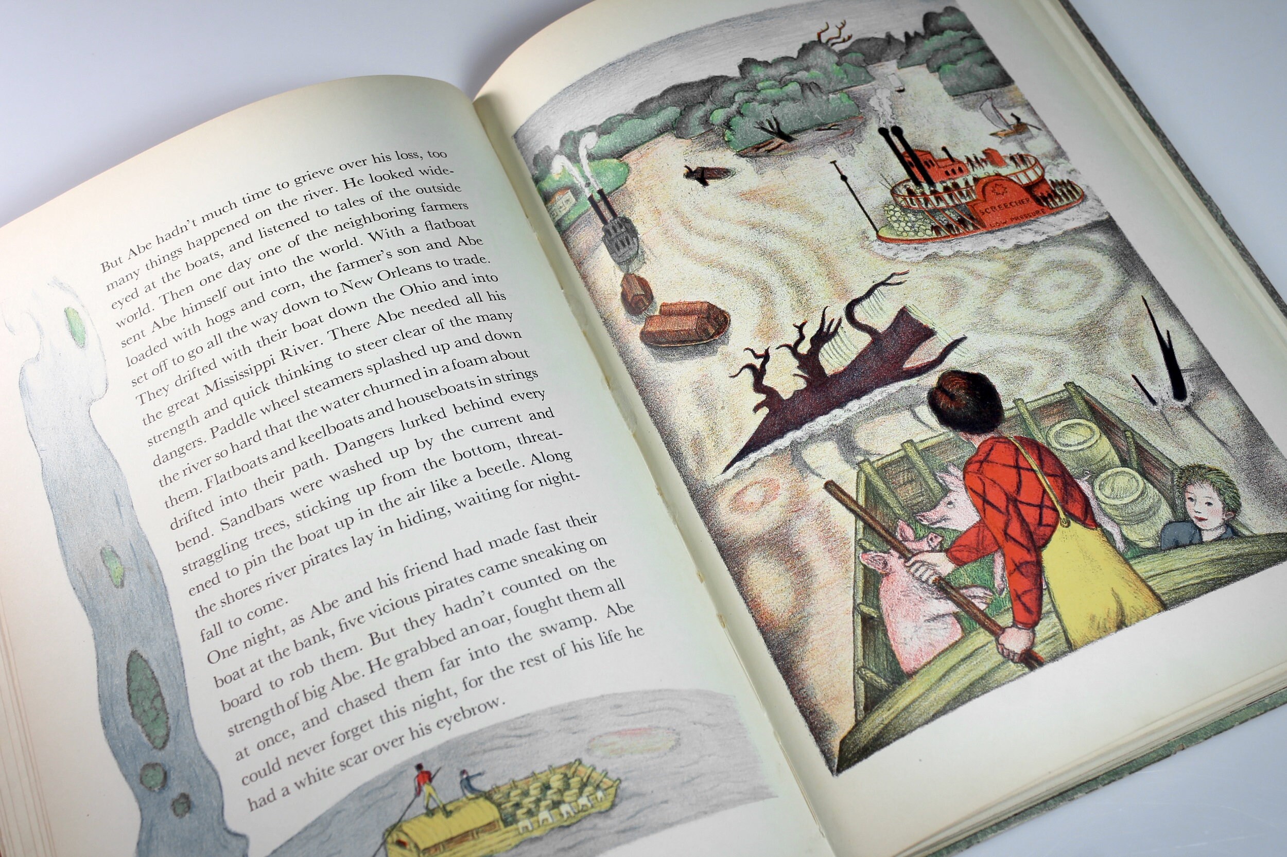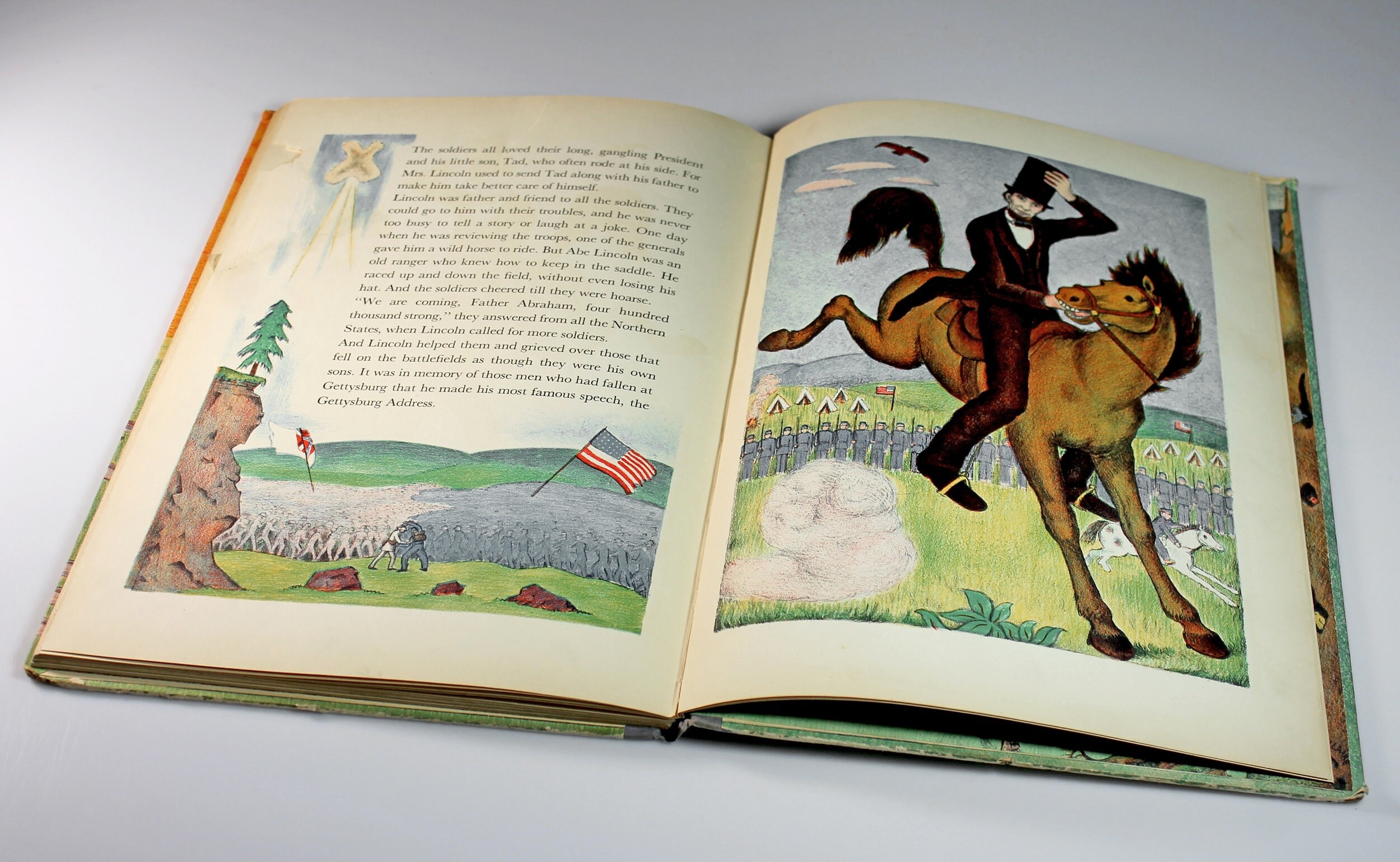 A wonderful children's hardcover book titled Abraham Lincoln by Ingri & Edgar Parin d'Aulaire. It was the recipient of the Caldecott Medal for illustration in 1940. This is a First Edition Second Printing. This copy has an erratum (an error in printing) glued in.